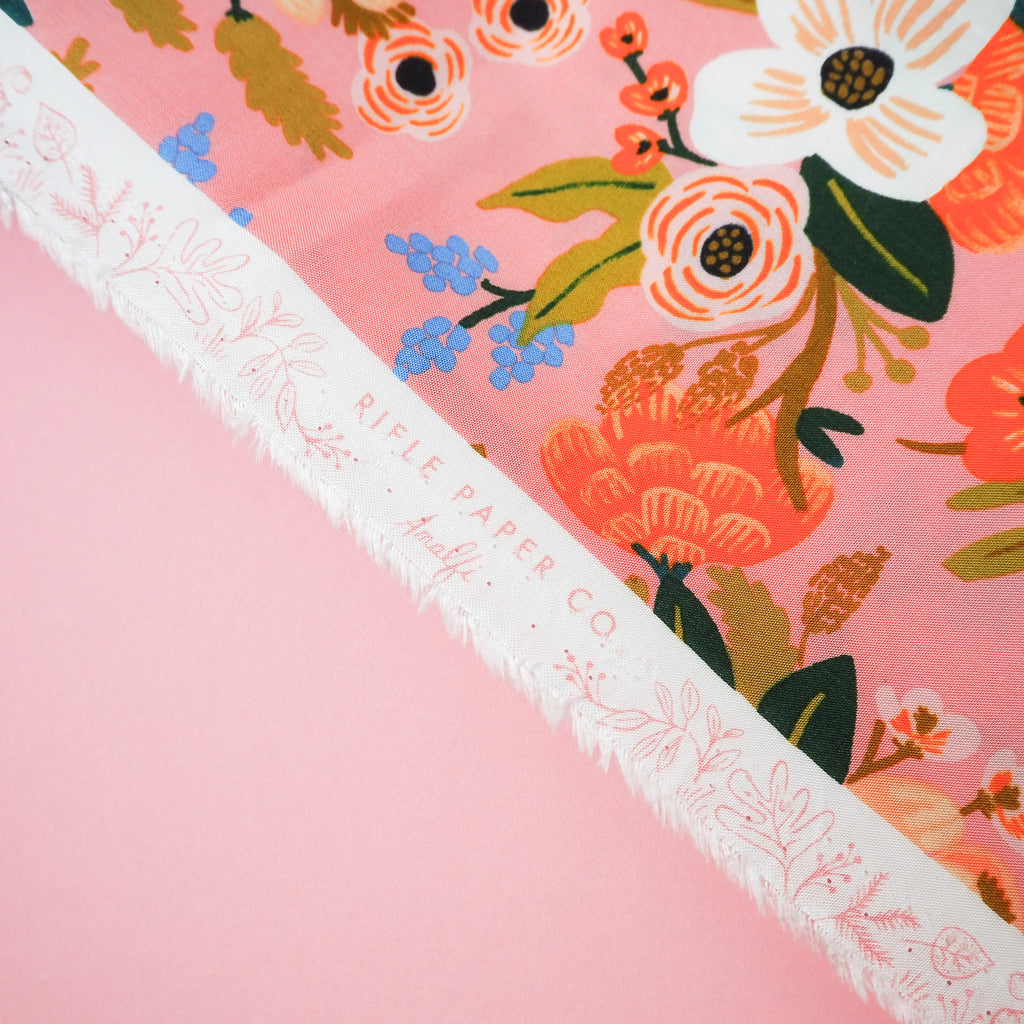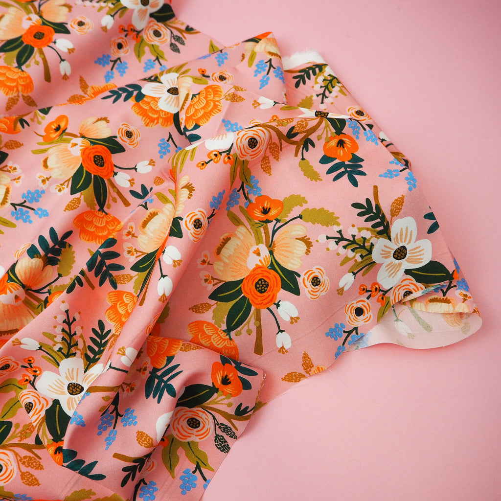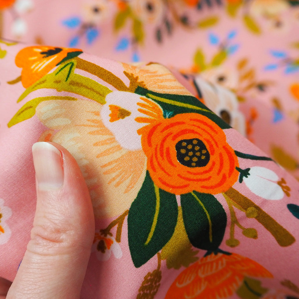 A beautiful floral rayon fabric in coral pink designed by Rifle Paper Co. for Cotton and Steel.