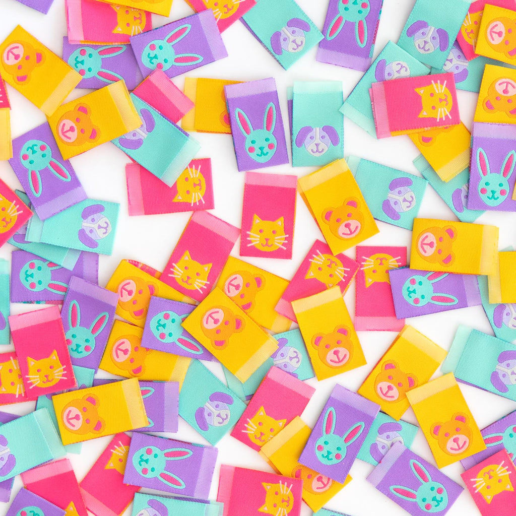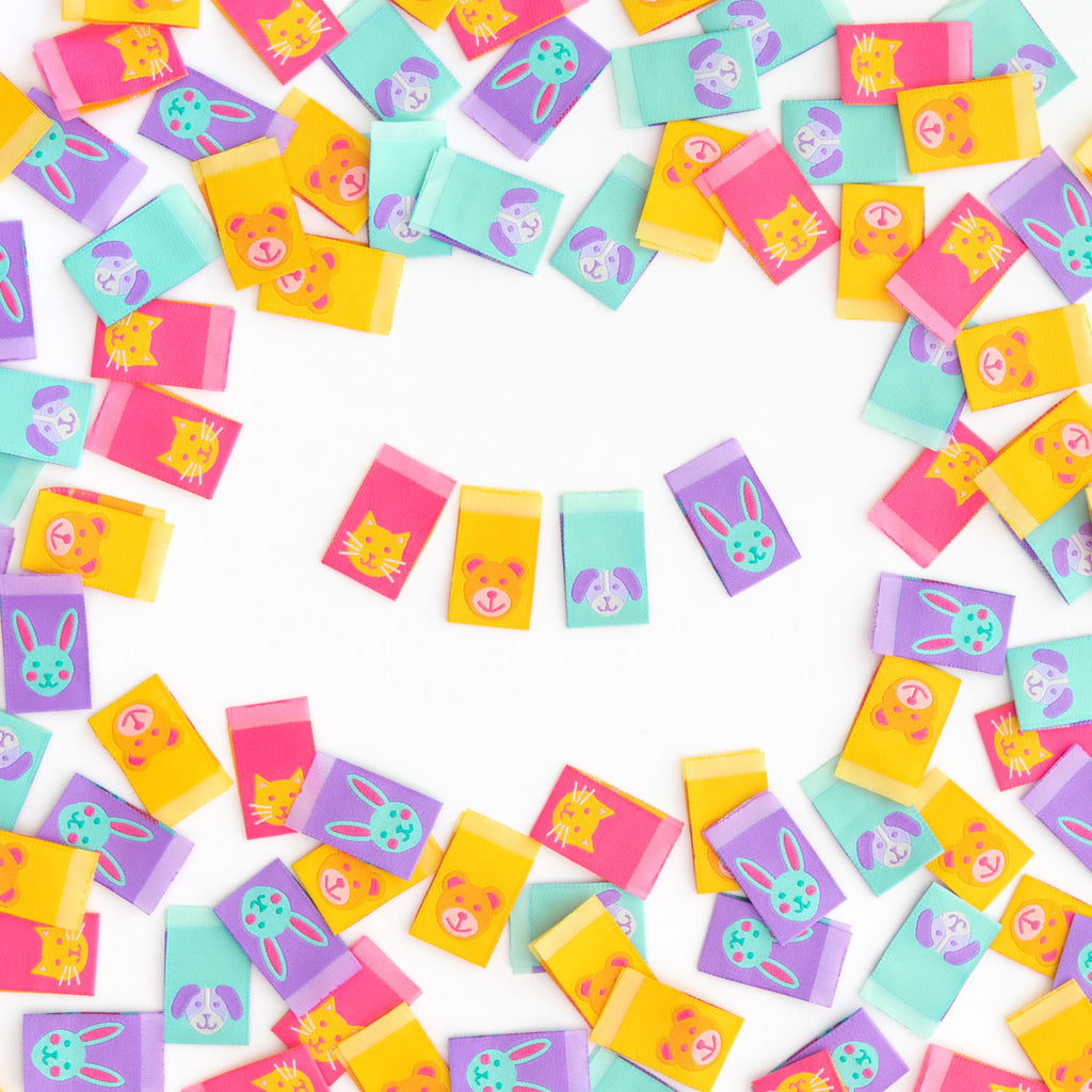 These high quality double-sided woven labels feature bright yellow, lavender, mint and pink colors tags each with a cute animal face. They are super soft to the touch, fully washable and can handle the heat of the dryer.