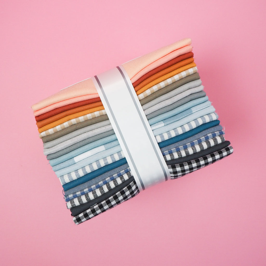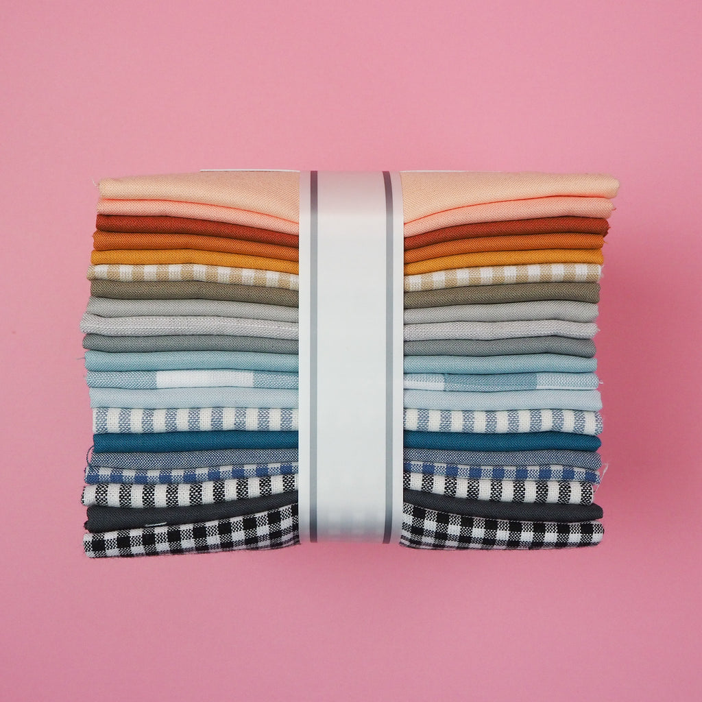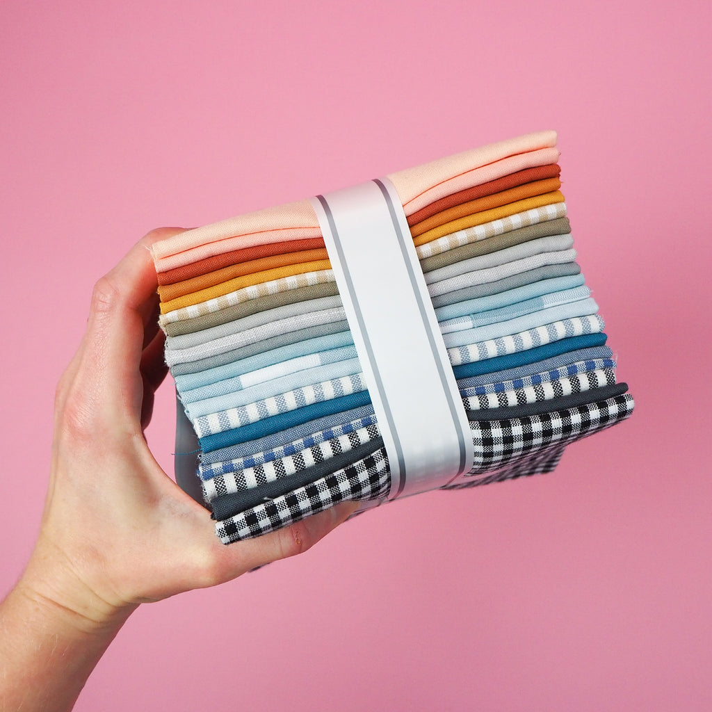 Fat quarter bundle featuring 20 fabrics curated by Anna Graham/Noodlehead for Robert Kaufman. These beautifully co-ordinated range of solids, stripes and gingham compliment each other perfectly.