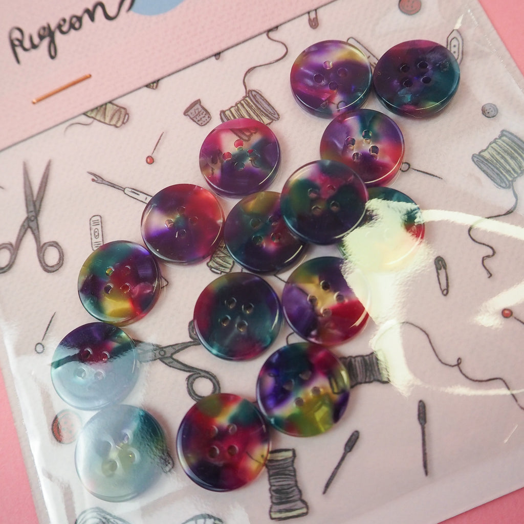 Tough, glossy multicoloured buttons made from resin: each button is one of a kind! These buttons are smooth, tough and lightweight. Sold in packs of 15.