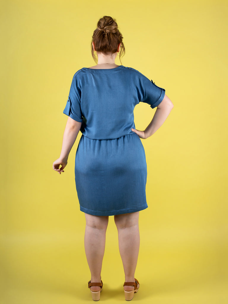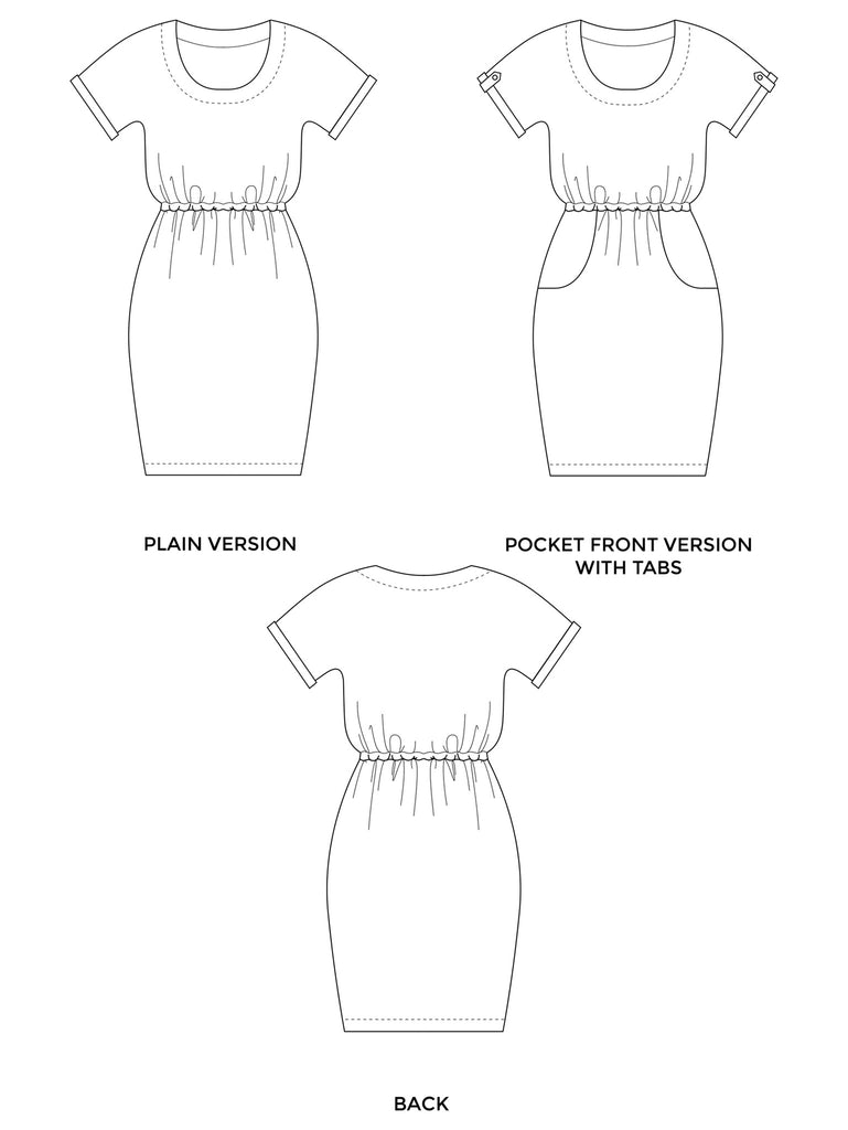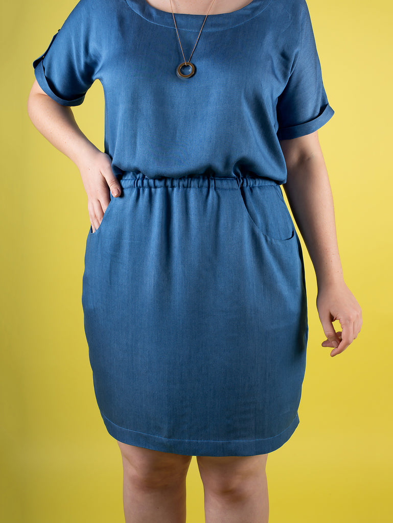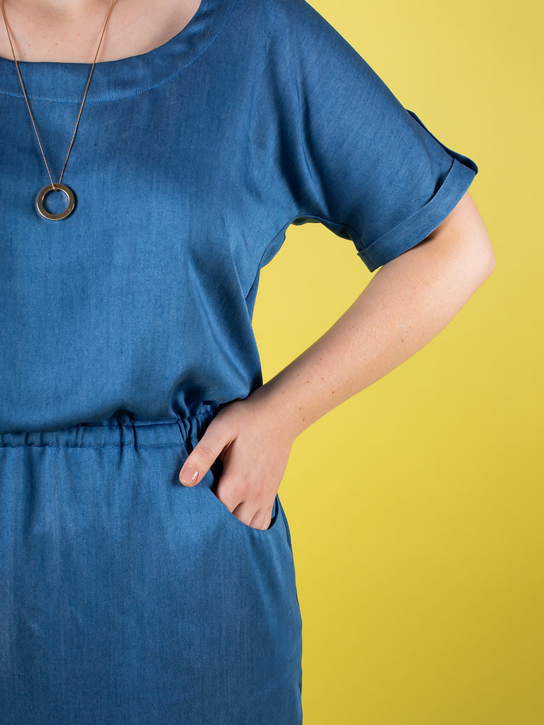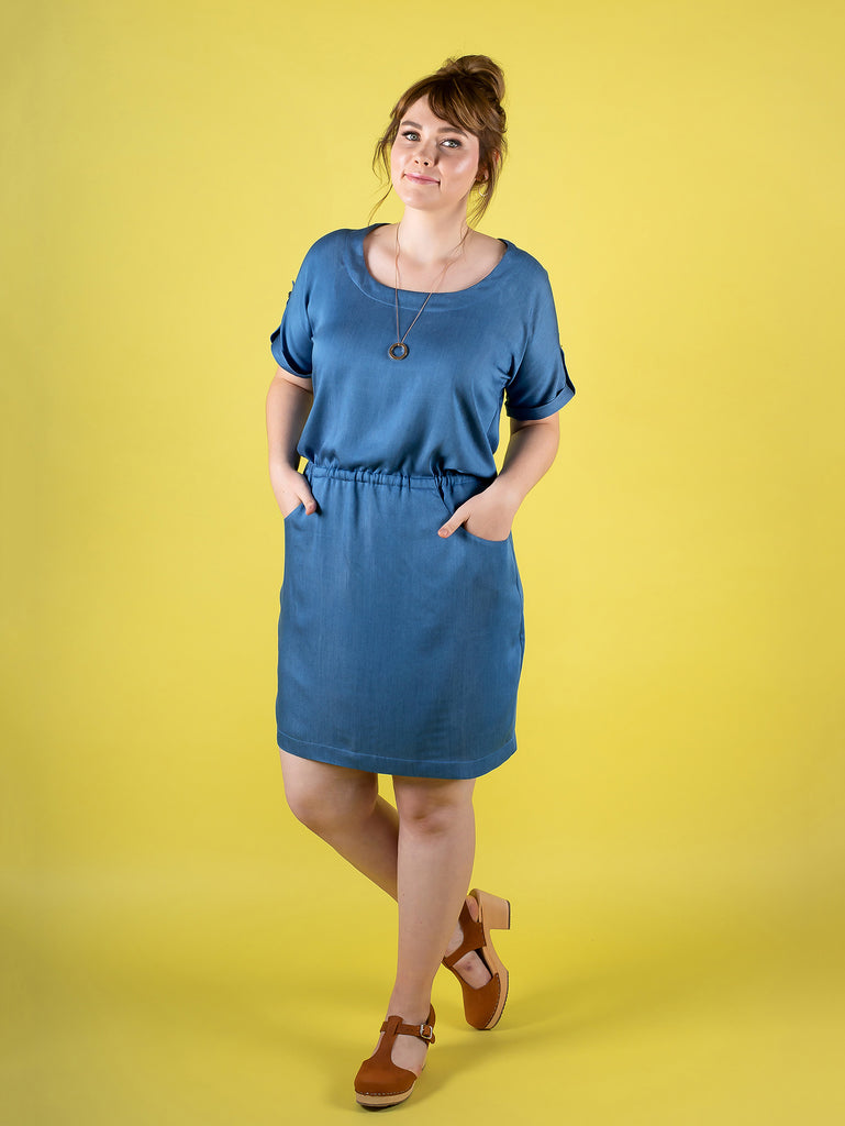 Bettine is an easy throw-it-over-your-head dress with a blousy bodice and scoop neckline, grown-on sleeves which hang softly around the underarm, turn-up cuffs, elasticated waistline to cinch you in and flattering tulip skirt.