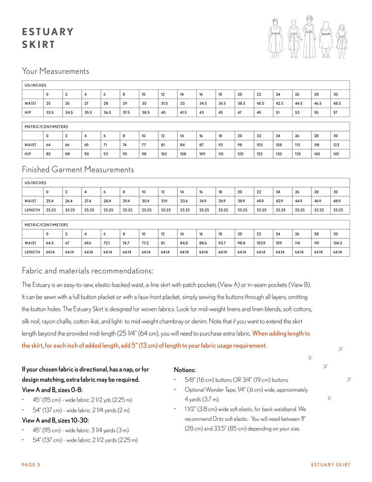 Fabric Suggestions: The Estuary Skirt is designed for woven fabrics - try mid-weight linen and linen blends, soft cottons, silk noil, rayon challis, cotton ikat, and light- to mid- weight chambray or denim.