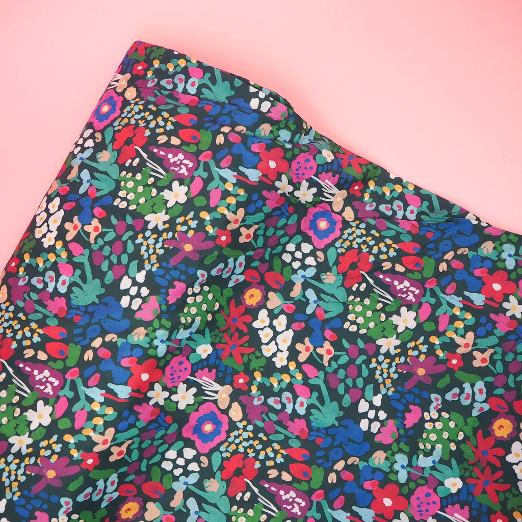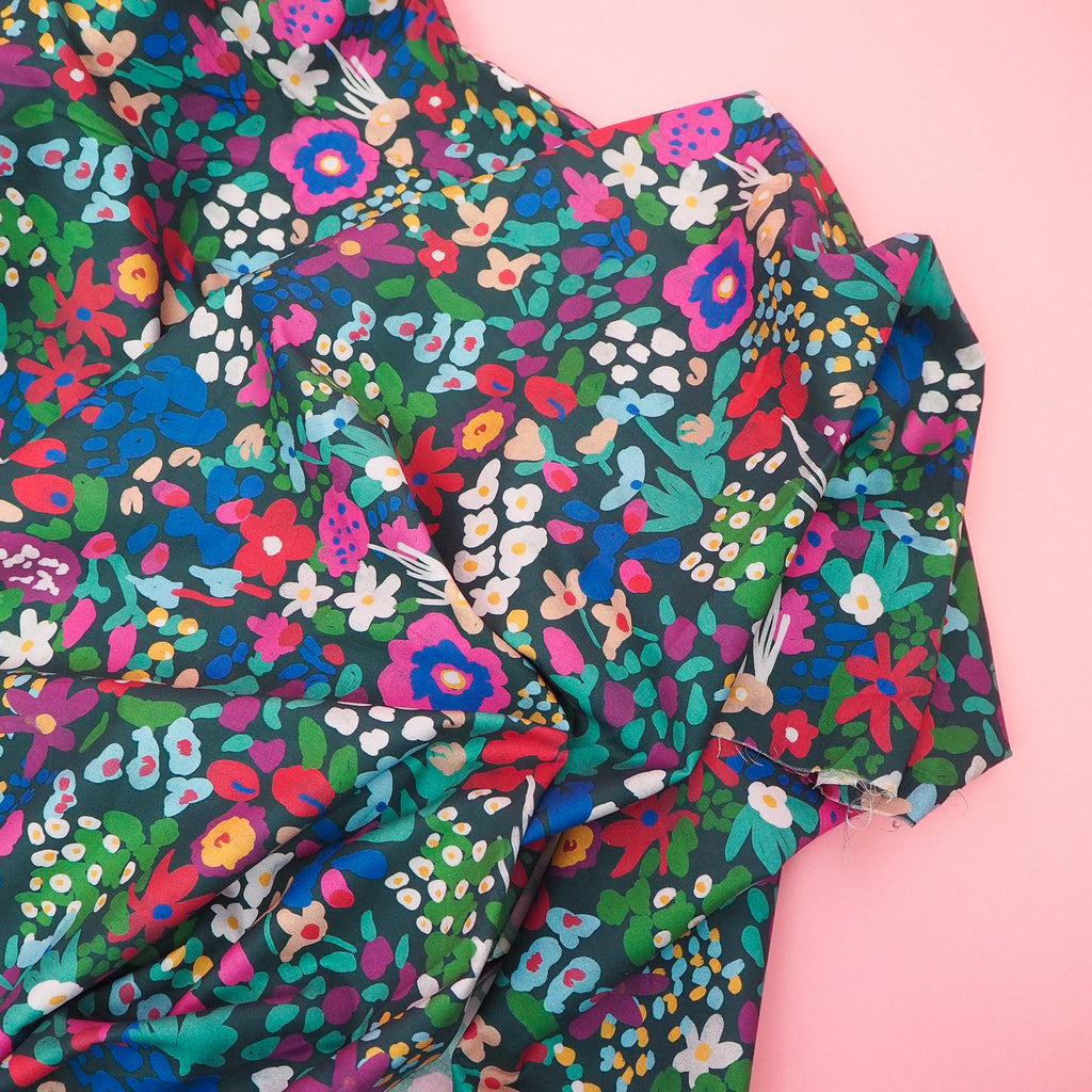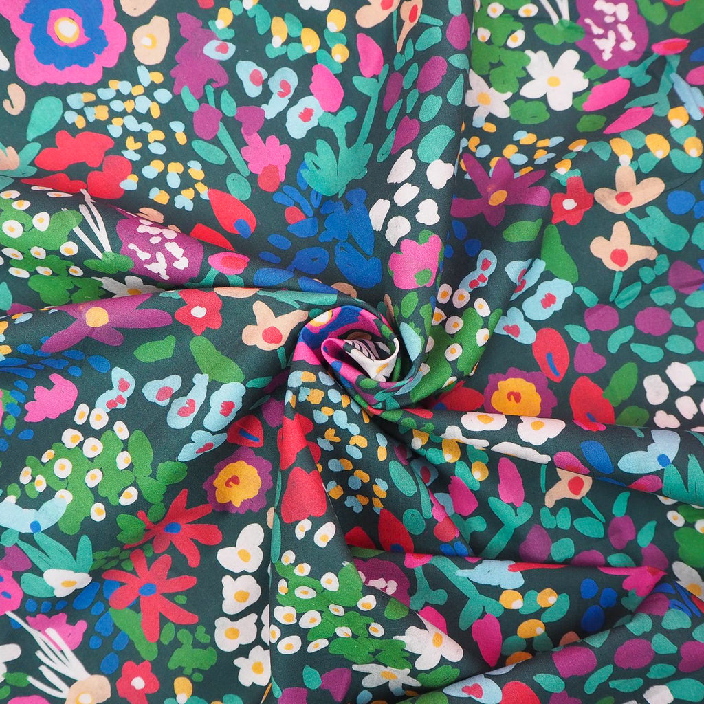 Fantastic, bright and eye-catching, this cotton lawn print features a garden of flowers and foliage on a black background. Great for a maxi-dress!