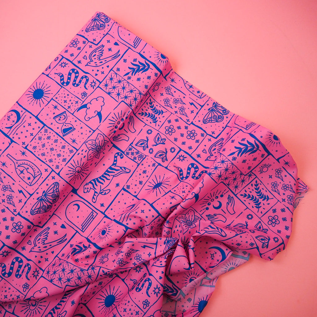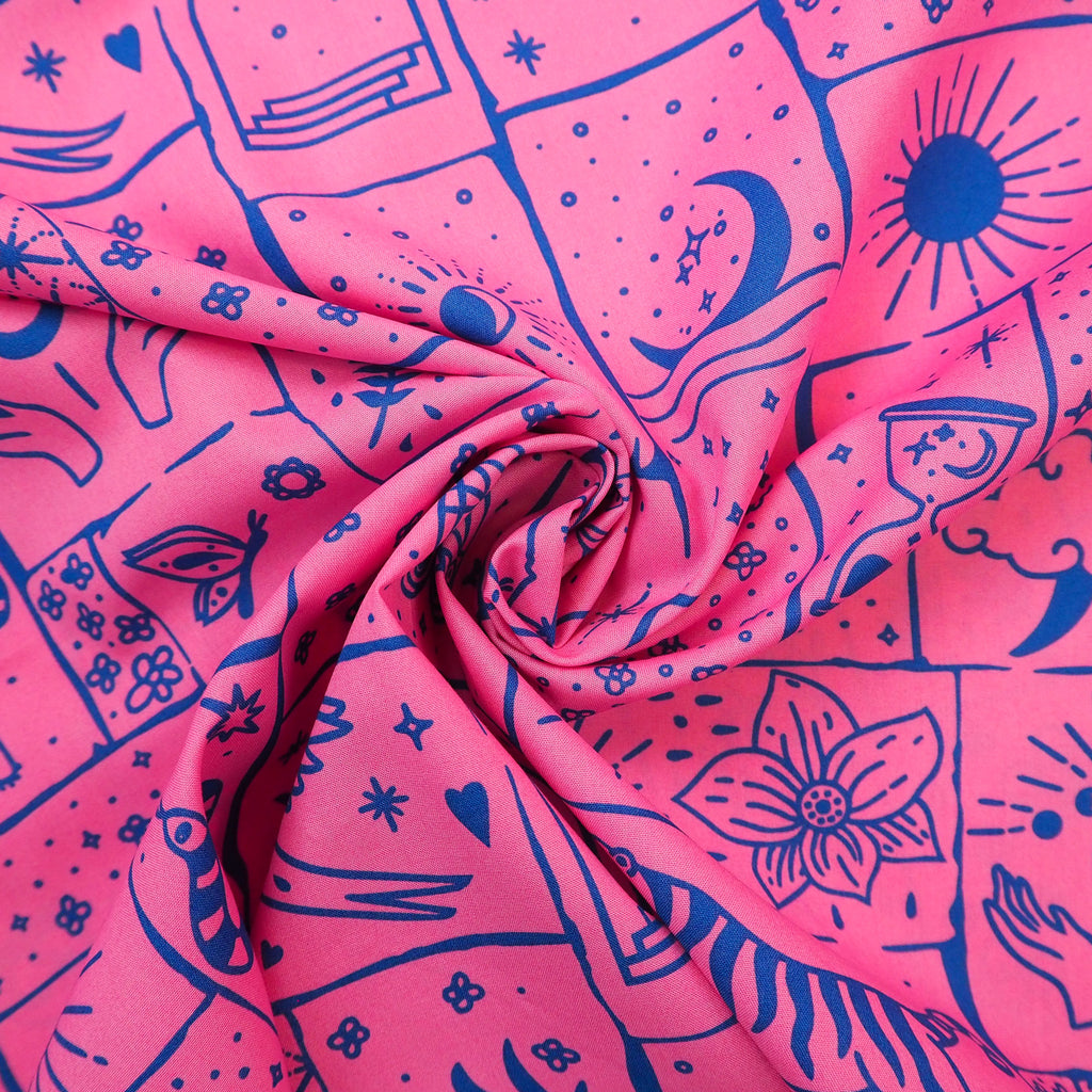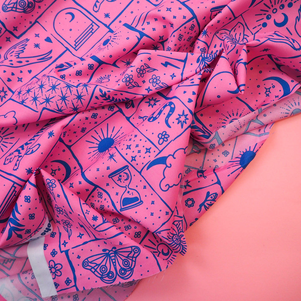 Dreamy print on fine cotton poplin in fuchsia pink and blue!