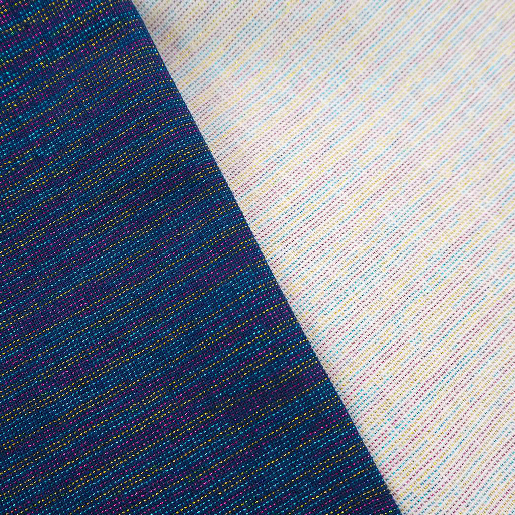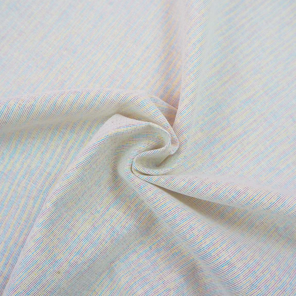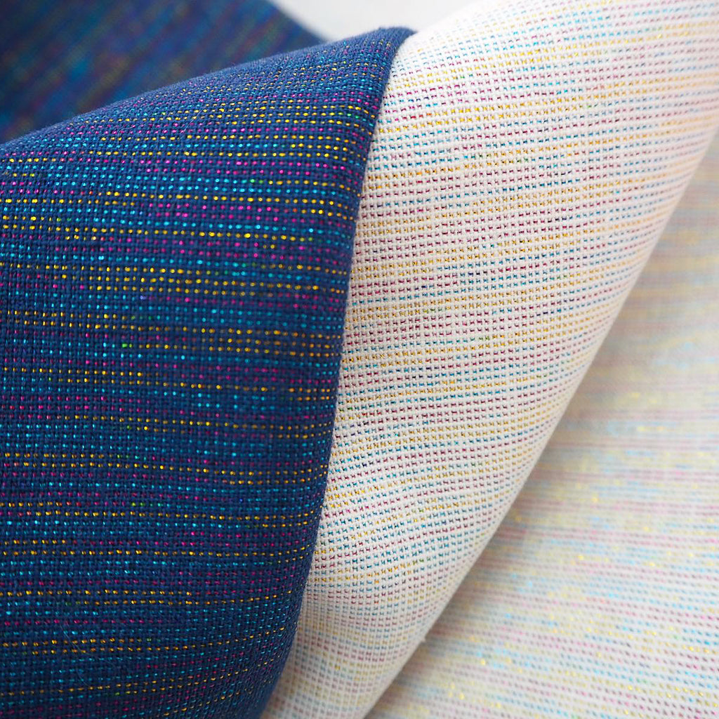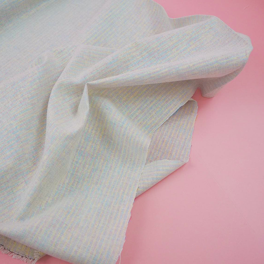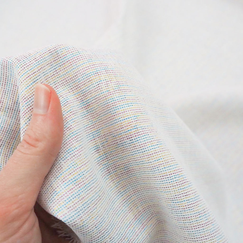 Amazing linen cotton blend from Robert Kaufman with a rainbow of metallic thread running through the white fabric.