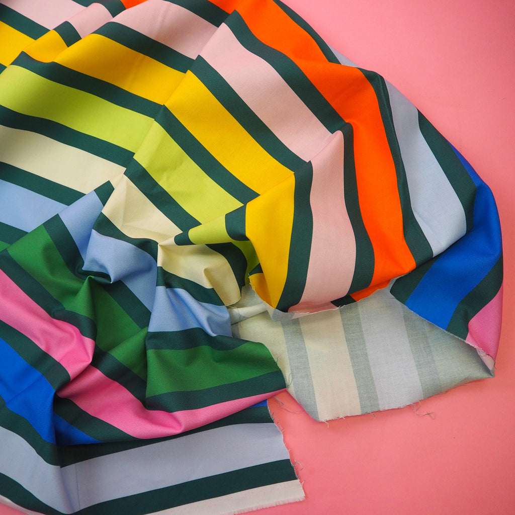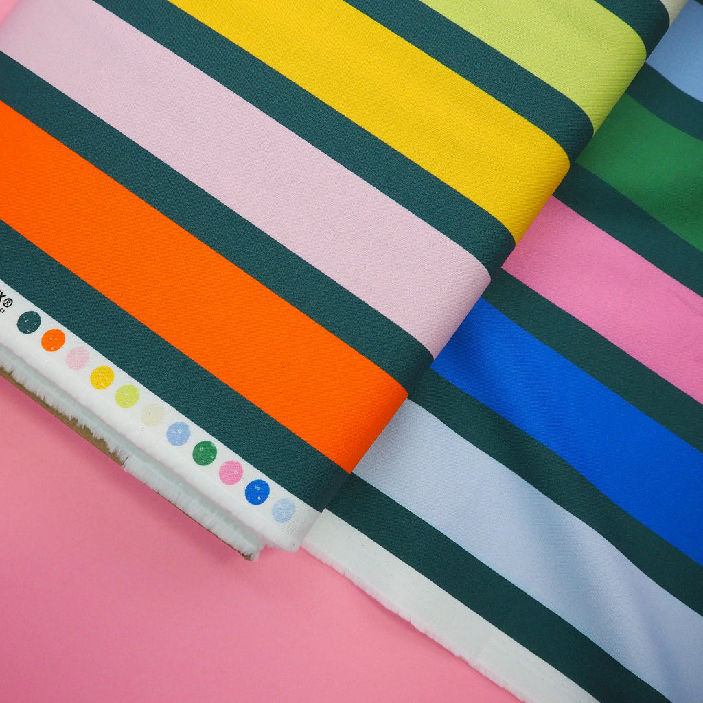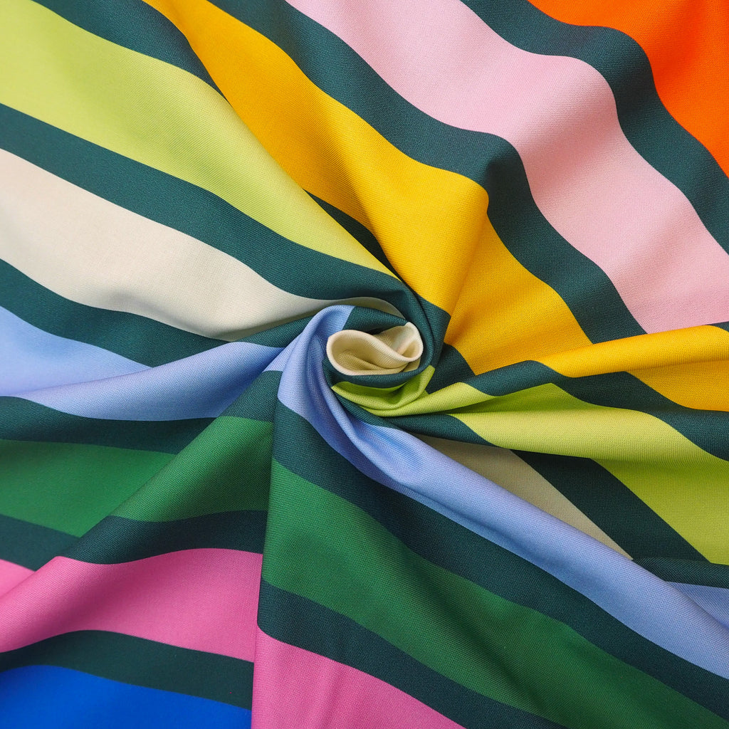 Fun big rainbow and green stripes on cotton from the Groove collection designed by Emily Van Hoff for Moda Fabrics.