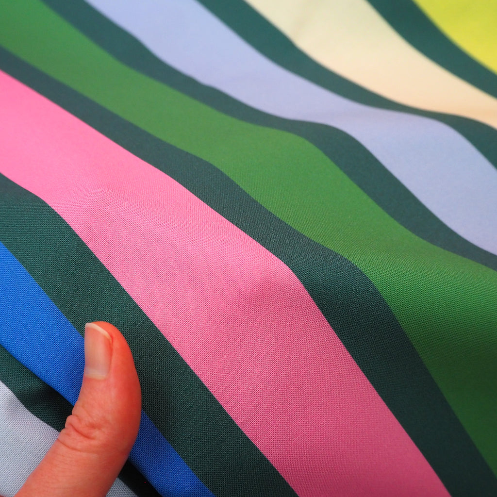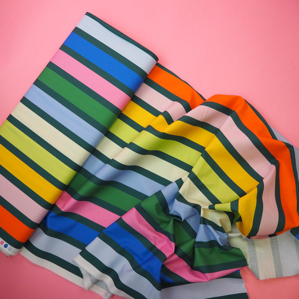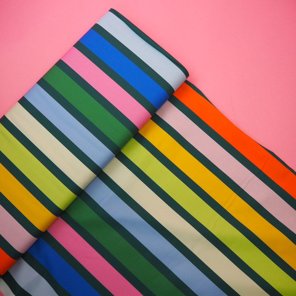 Fun big rainbow and green stripes on cotton from the Groove collection designed by Emily Van Hoff for Moda Fabrics.