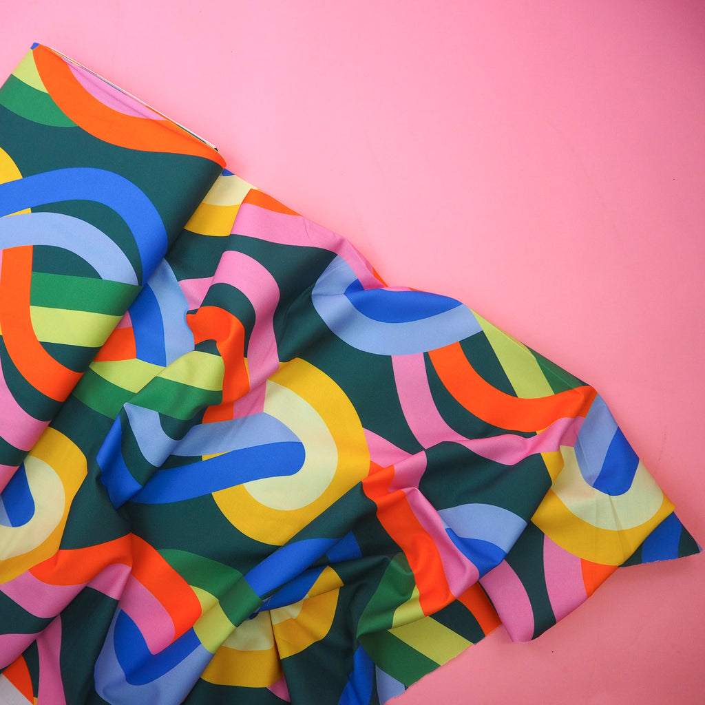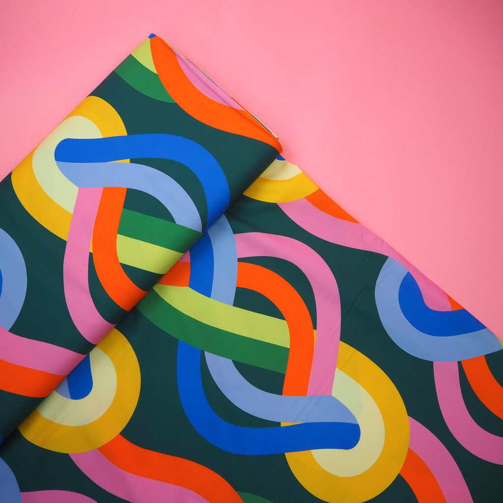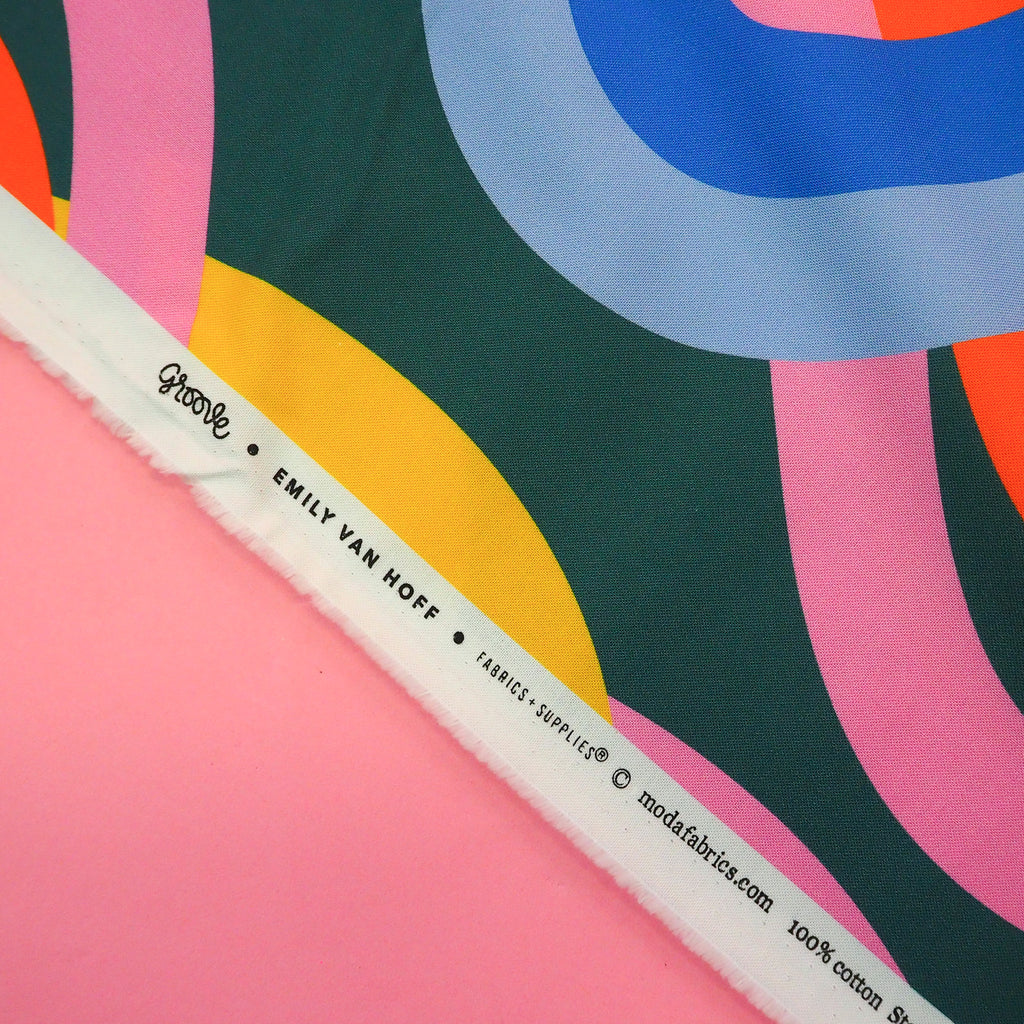 Gorgeous twists of colour on green cotton from the Groove collection designed by Emily Van Hoff for Moda Fabrics.