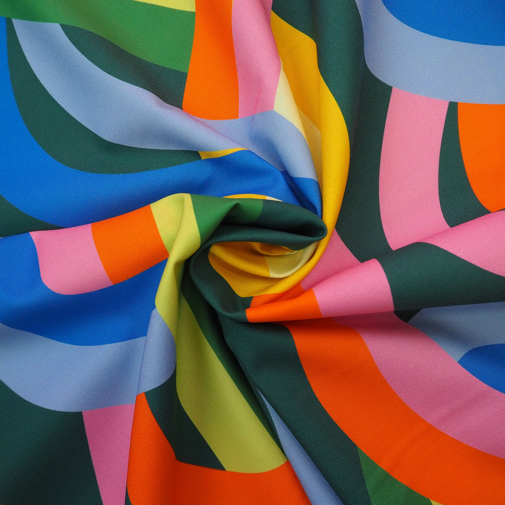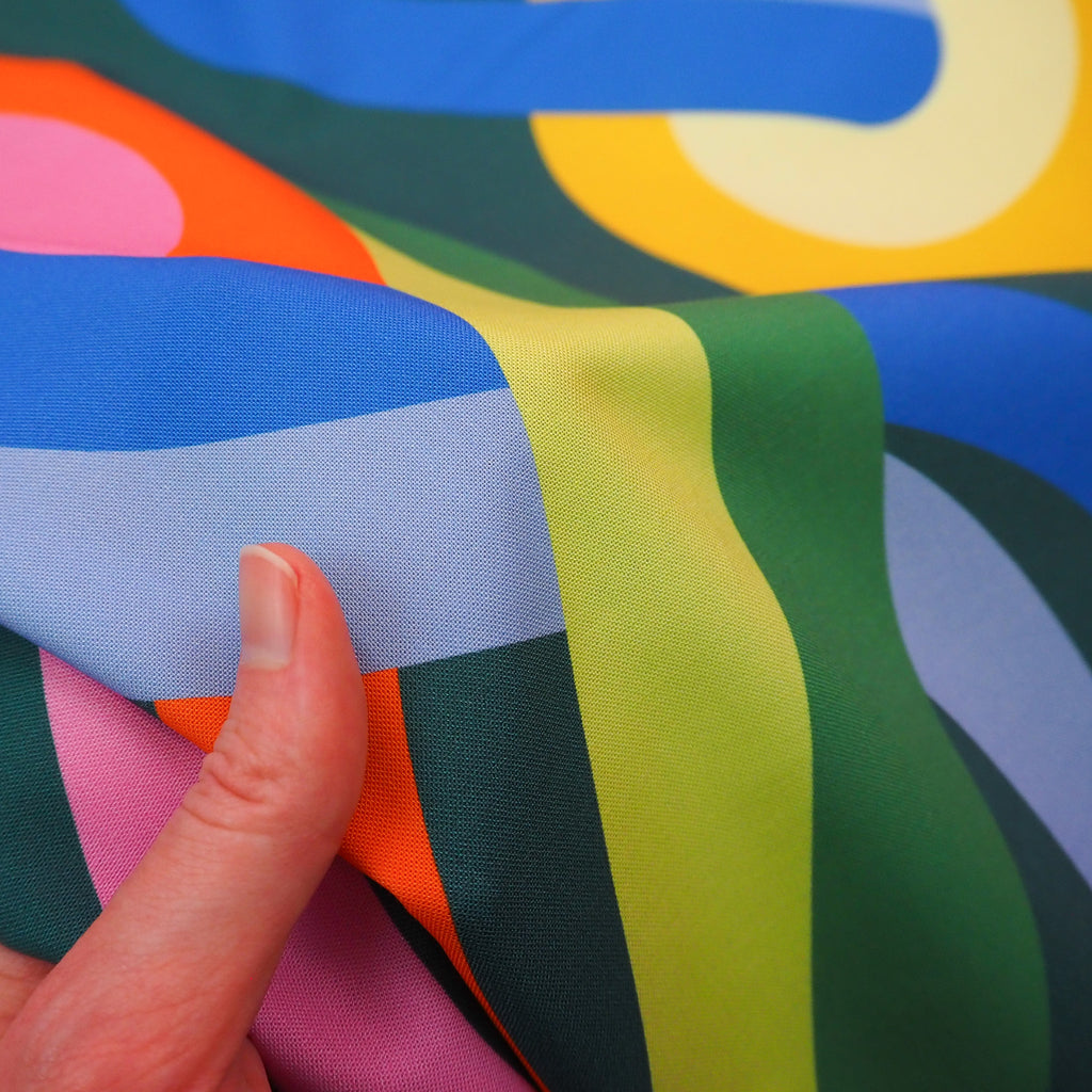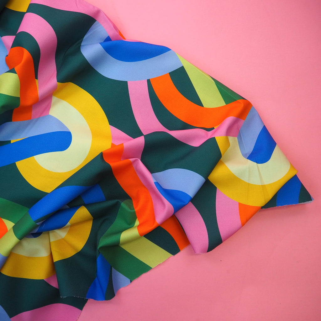 Gorgeous twists of colour on green cotton from the Groove collection designed by Emily Van Hoff for Moda Fabrics.