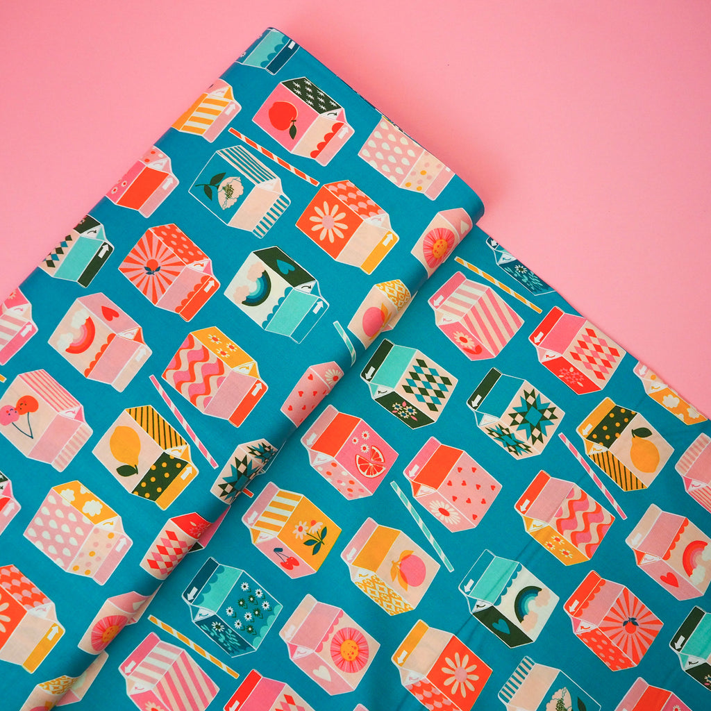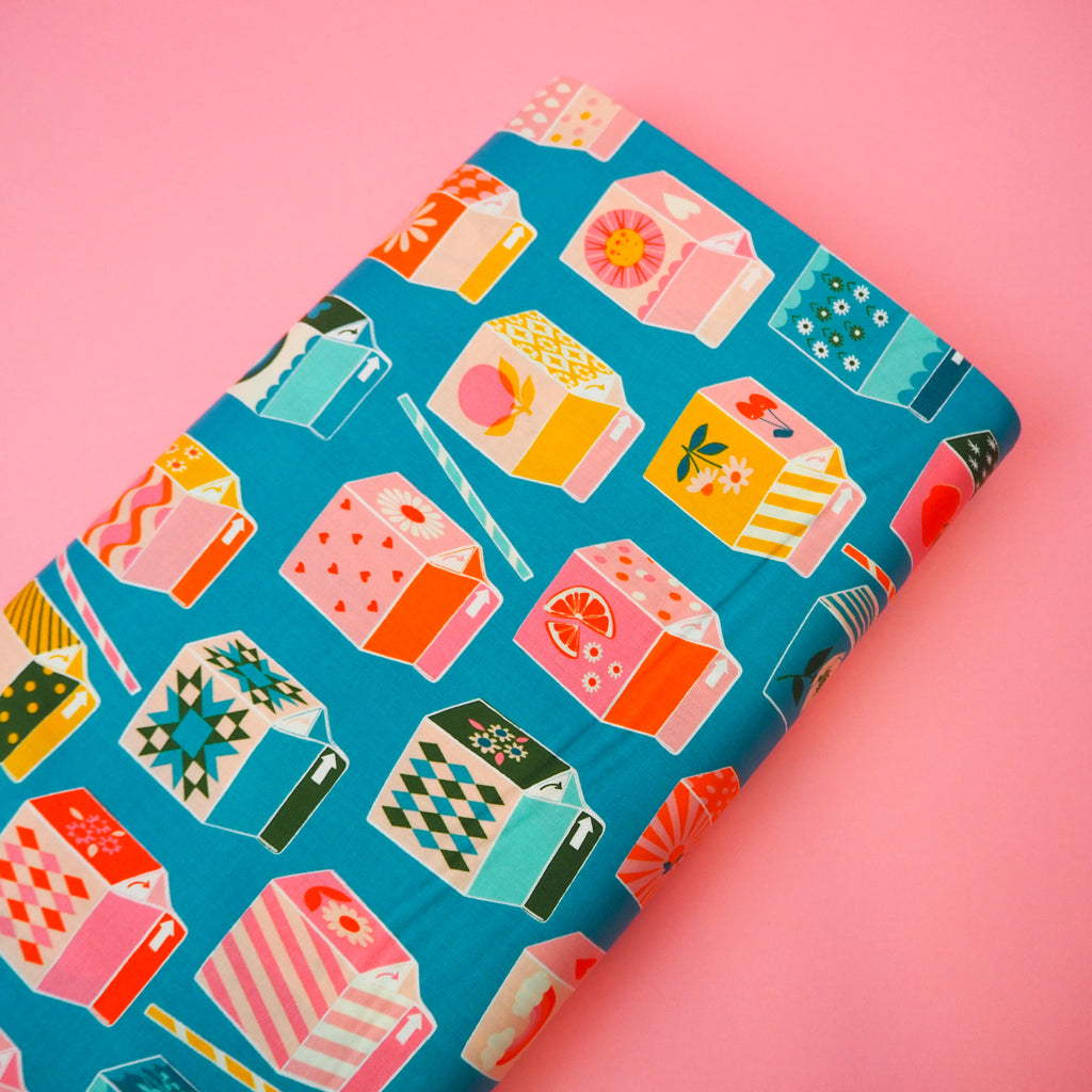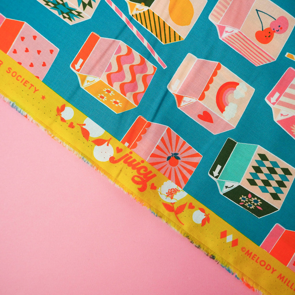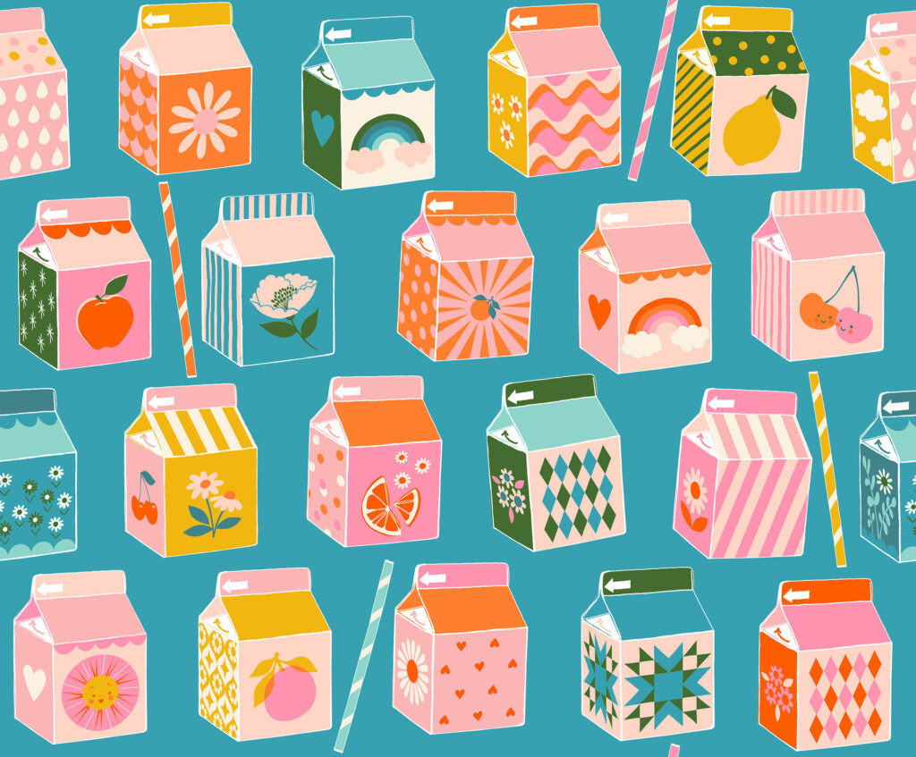 Juice cartons on a dark turquoise background designed by Melody Miller for Ruby Star Society.