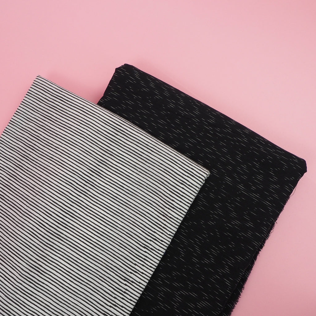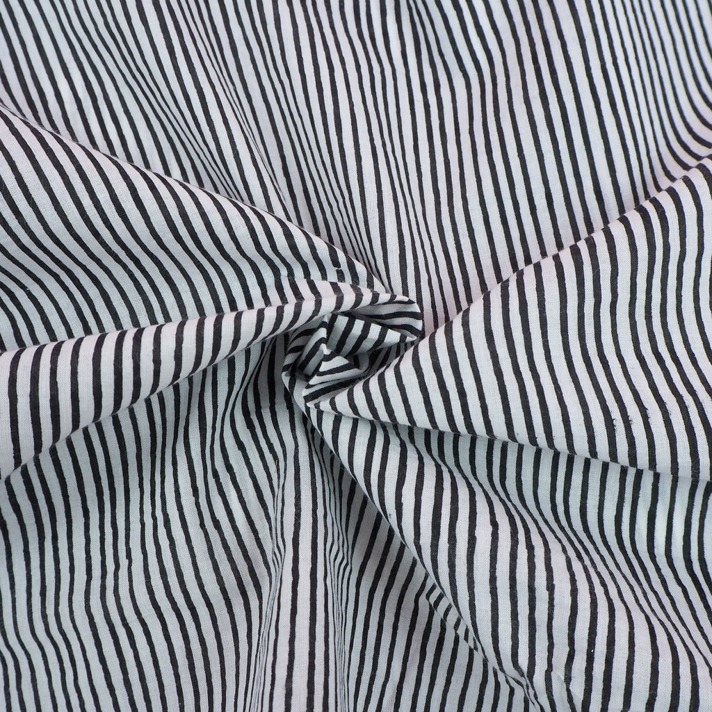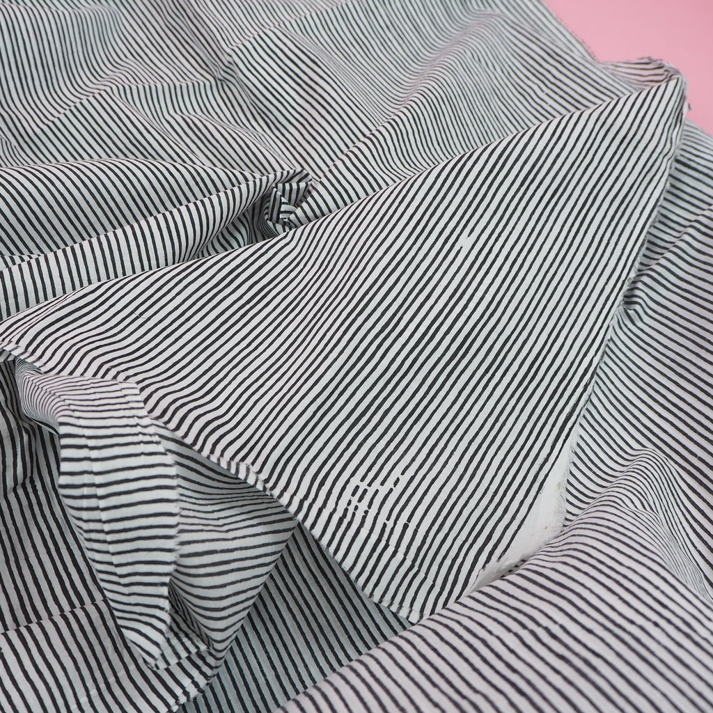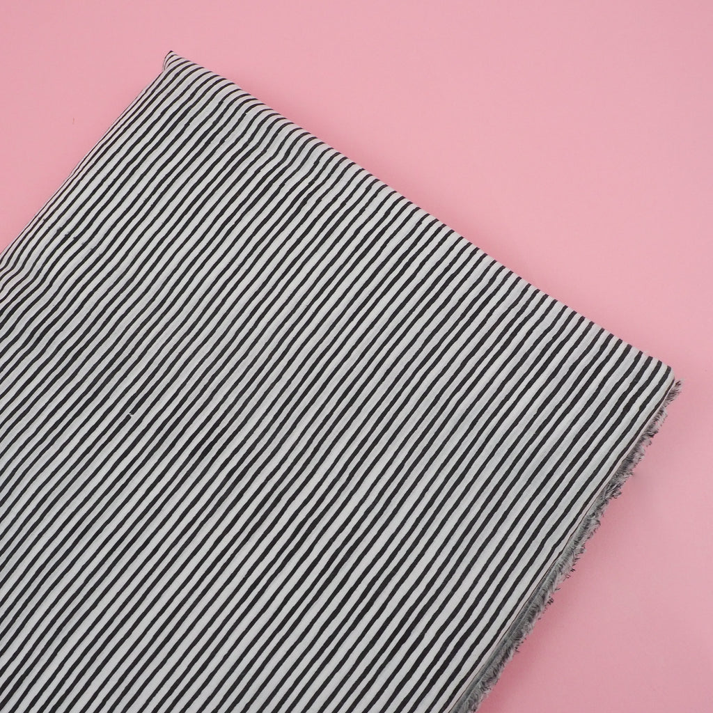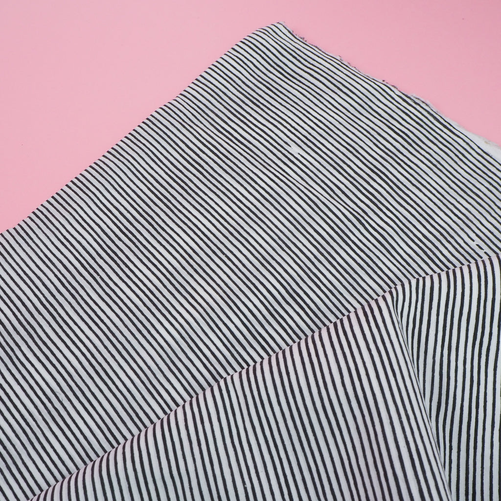 Unique black and white hand blocked design, from Jaipur in India. Traditional hand block and dye techniques are used to make this summer cotton. Due to being handmade, there is variation in the stripe, expect slight overlaps and gaps which only add to this fabric's charms!