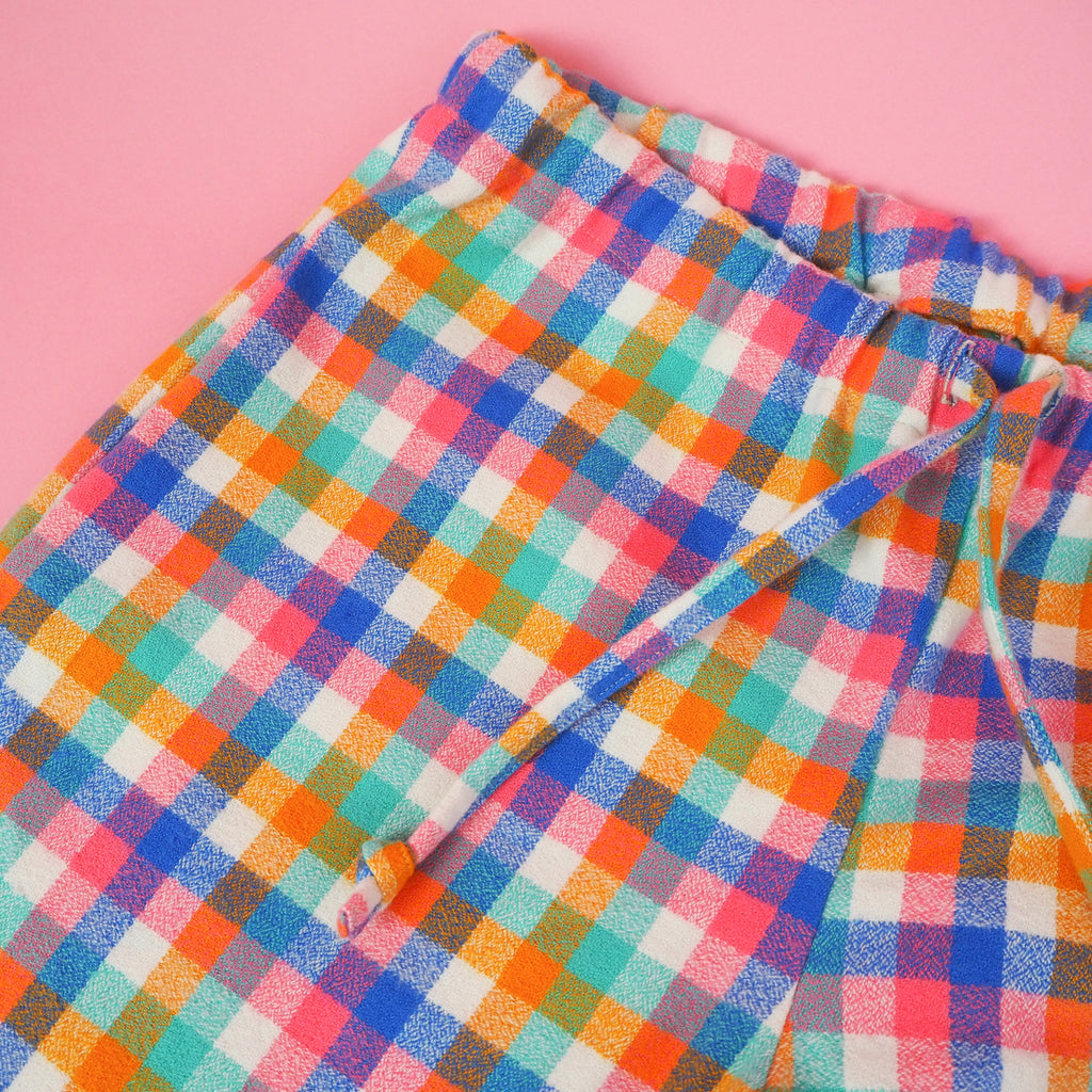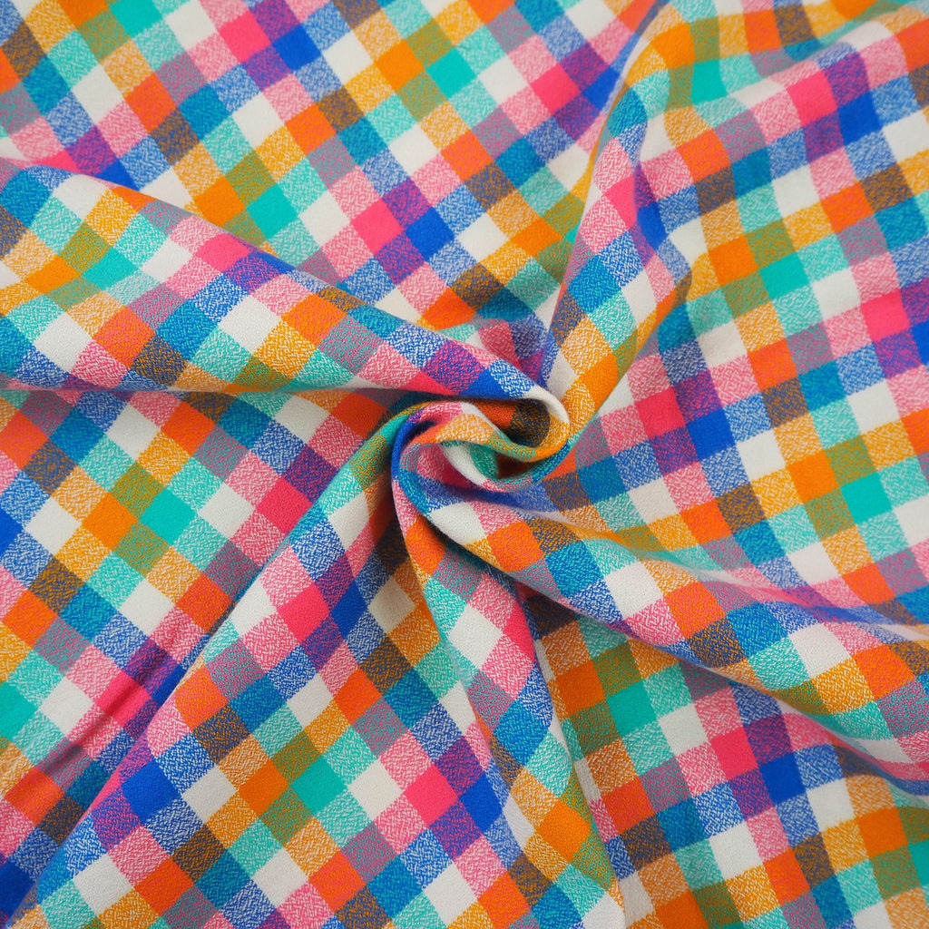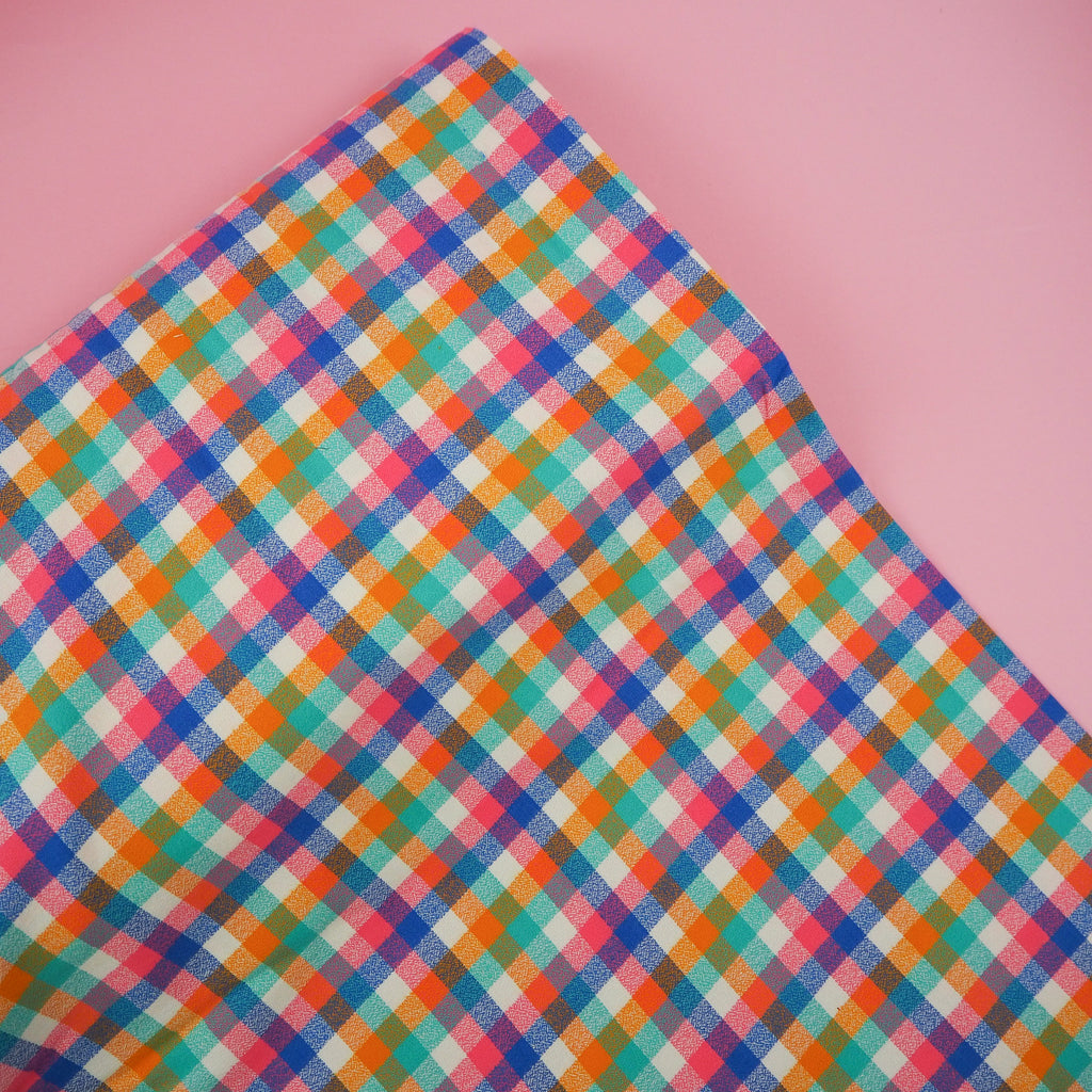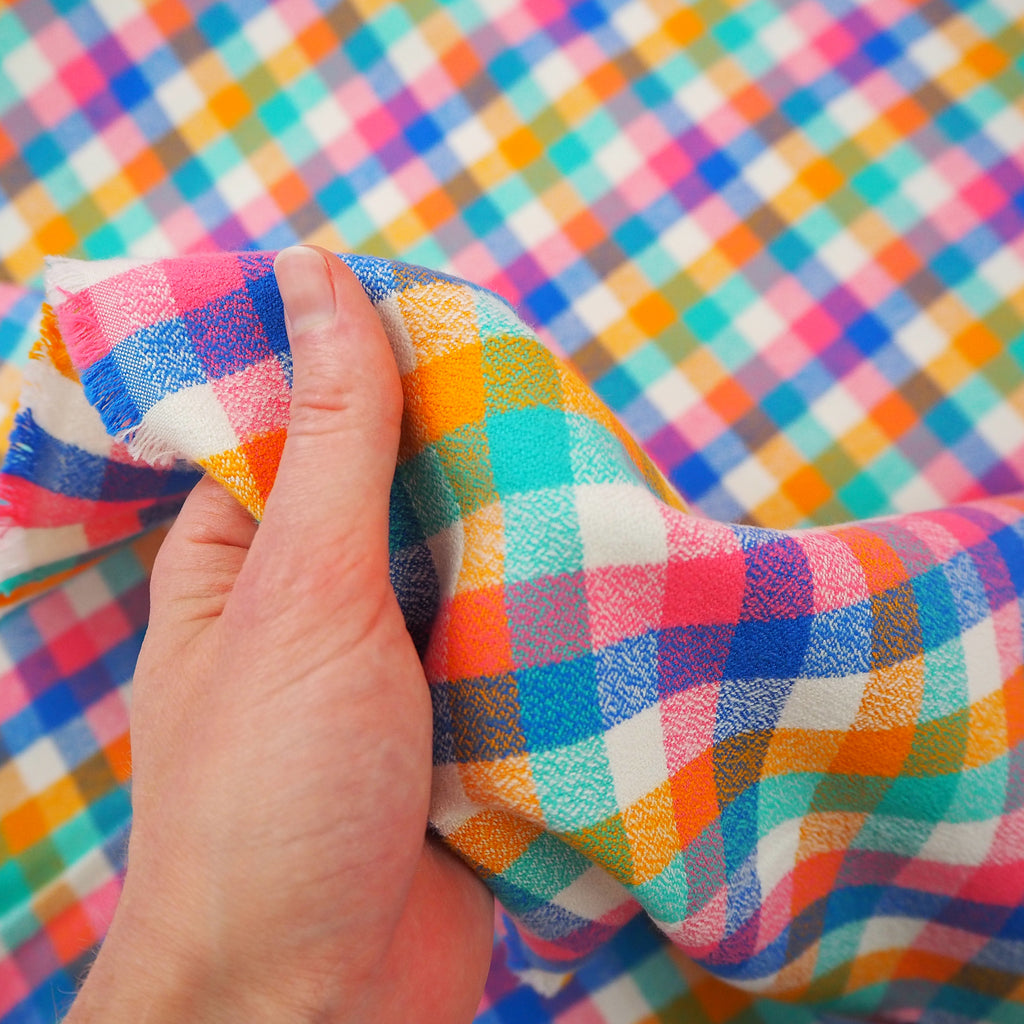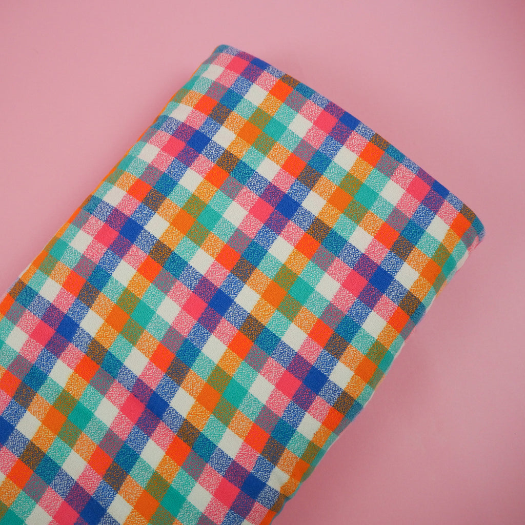 Soft, cosy flannel from Robert Kaufman in bright blue, spearmint green, orange and pinks on a white base. This fabric is easy to sew with and would make a great flannel shirt or warm pyjamas.