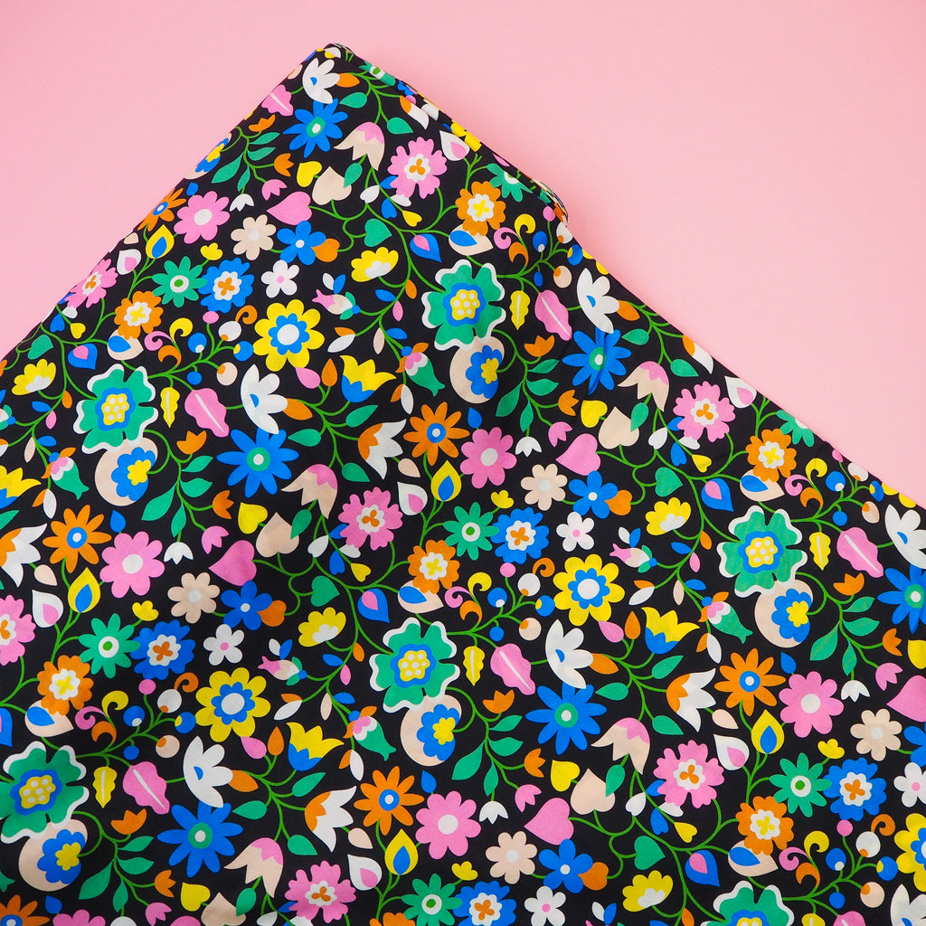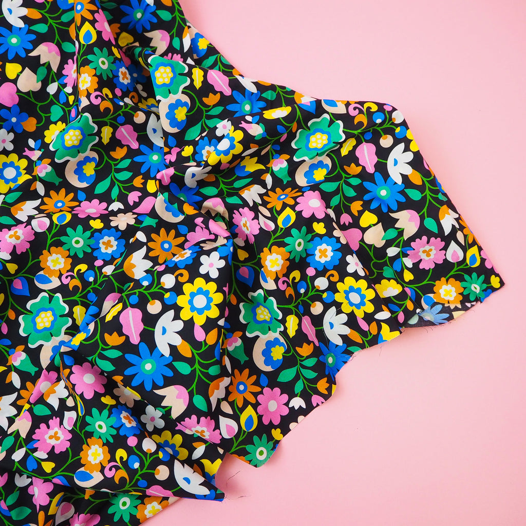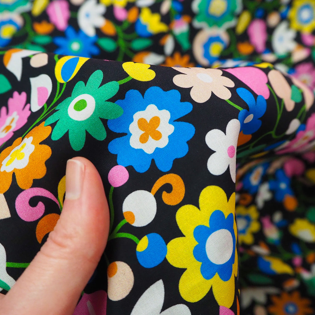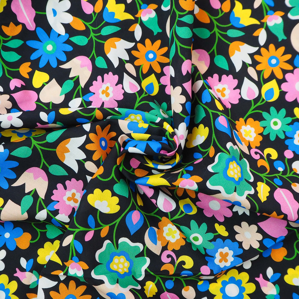 Multi-coloured floral print on black lightweight, beautifully soft cotton lawn. This Lady McElroy "Louise Lawn" is made of 100% superfine cotton.