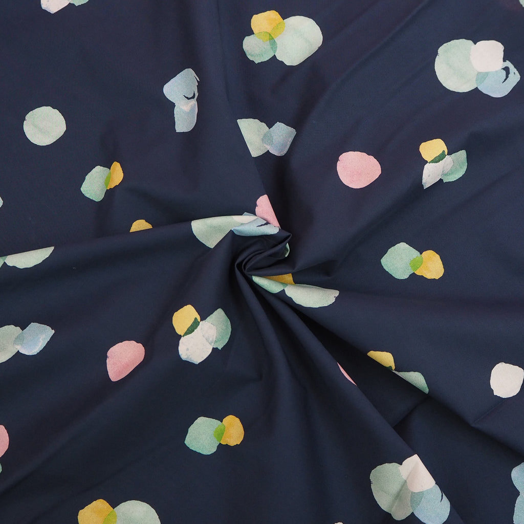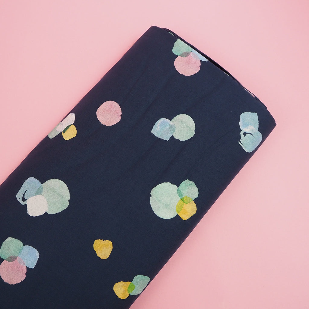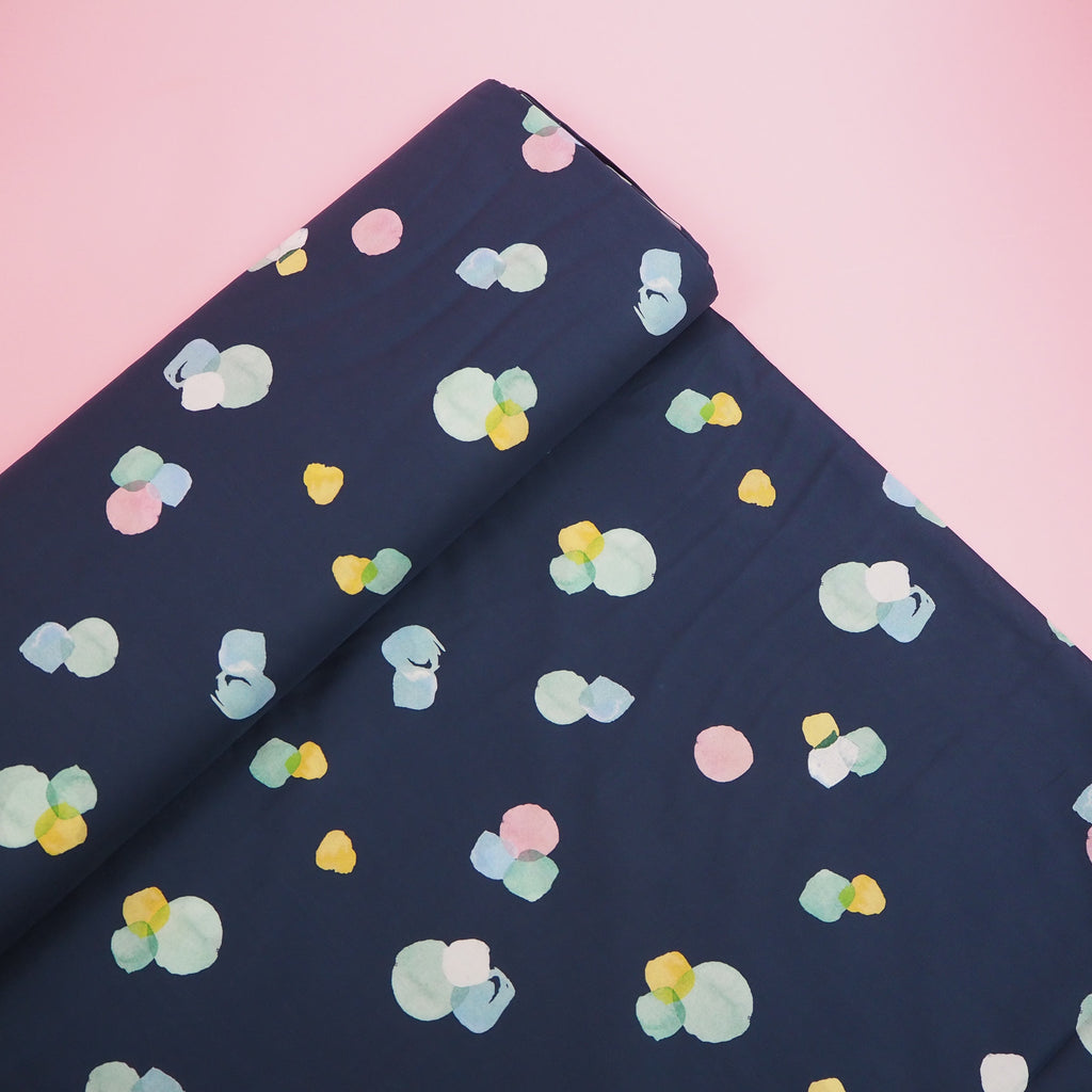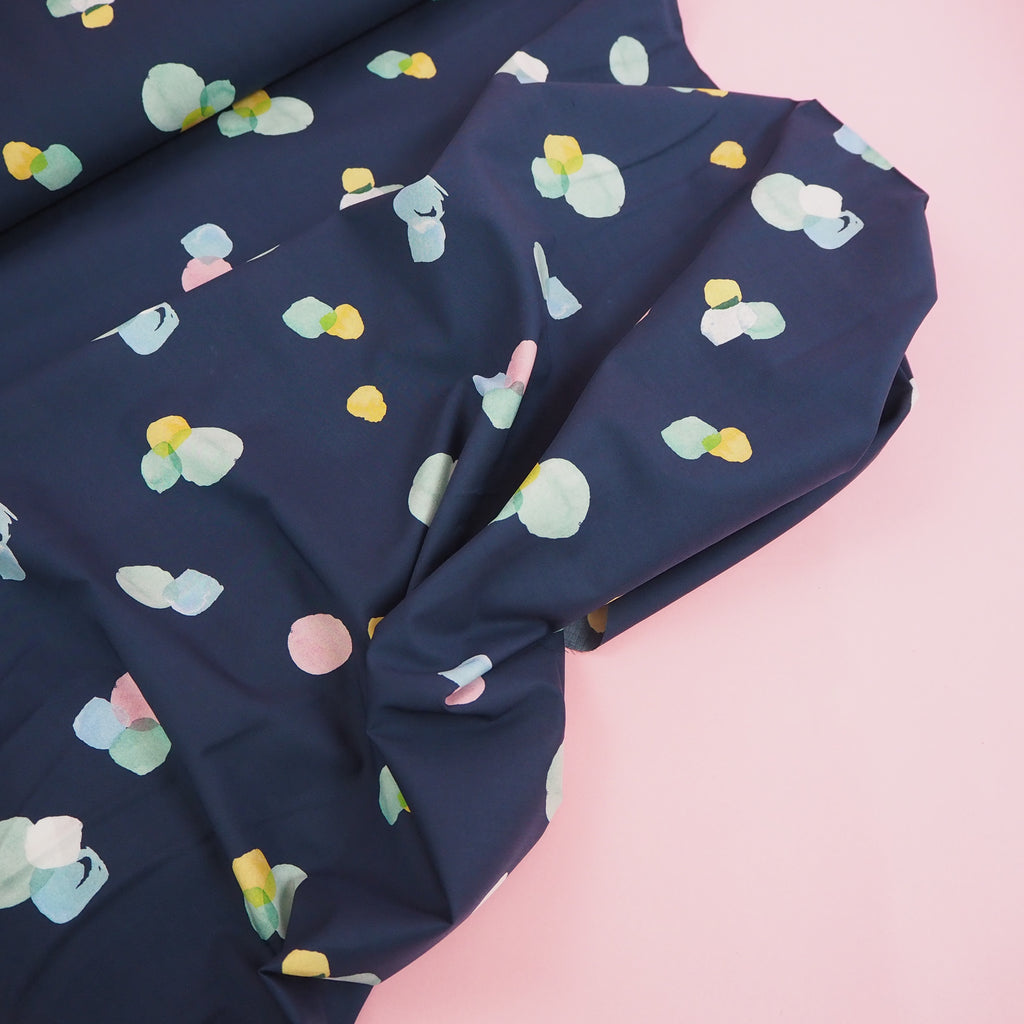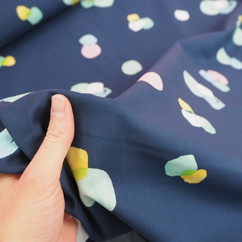 Gorgeous dark navy lightweight cotton lawn with freehand coloured spots. Smooth fabric with tight weave which easy to sew and wont fray too much. Very slight sheen, and nice structure. Would make perfect luxury loungewear!