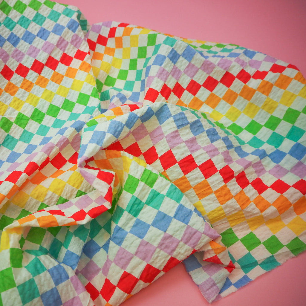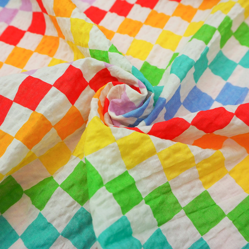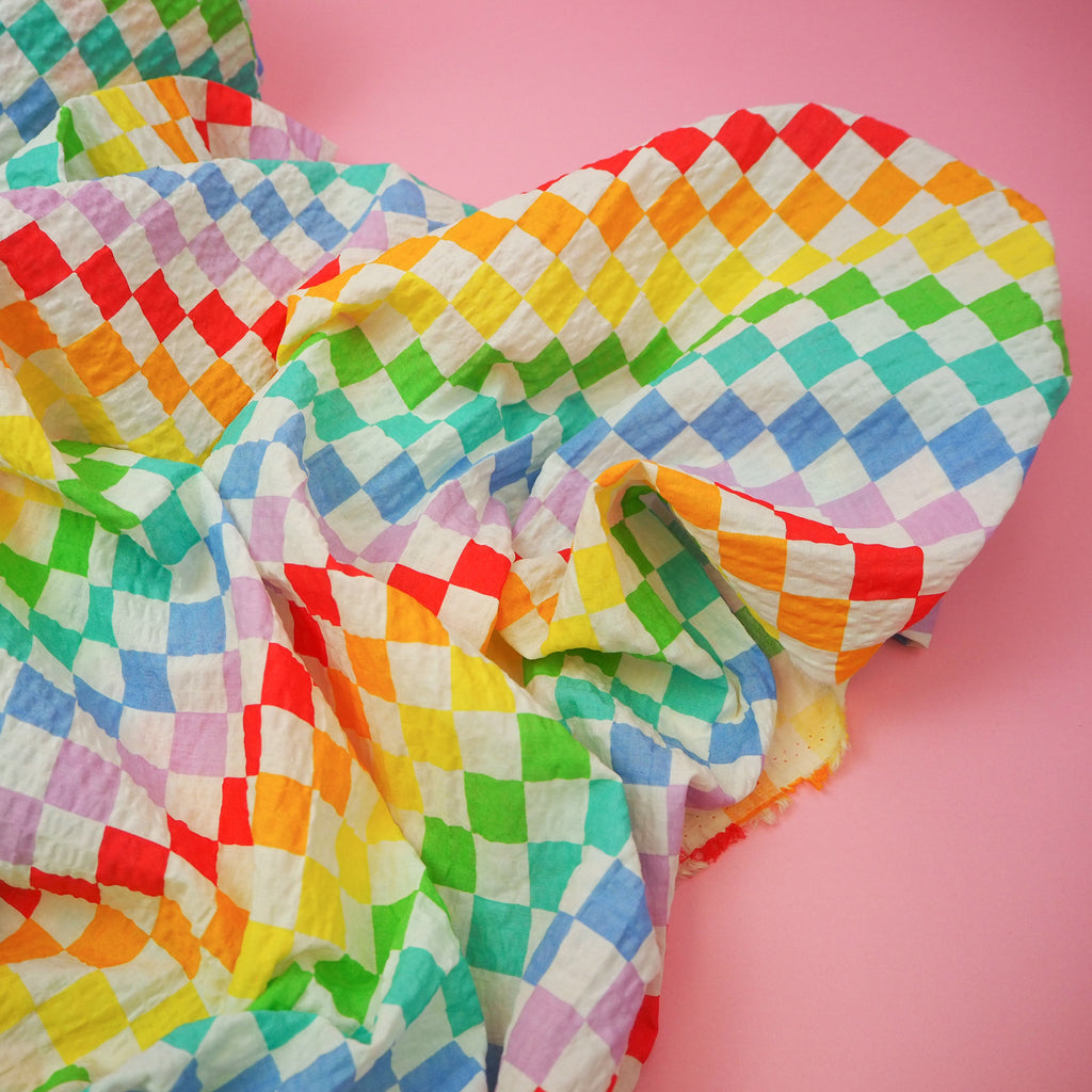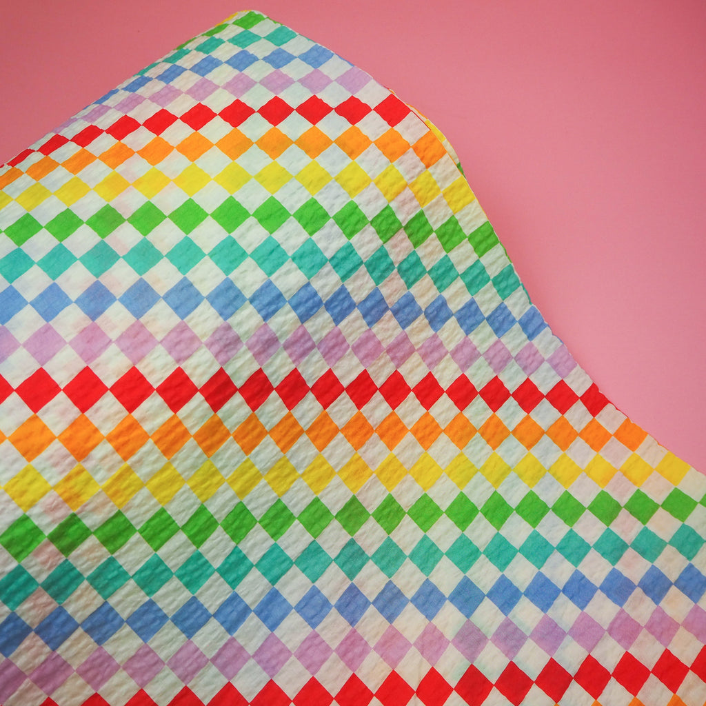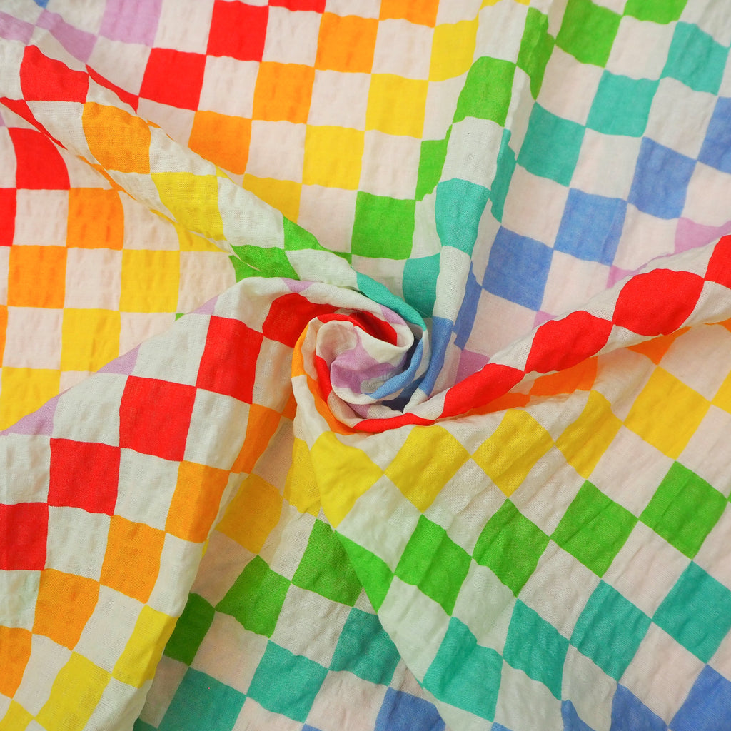 Rainbow coloured checkerboard cotton seersucker deadstock fabric on an almond background. This is a lovely, colourful, textured fabric with a crinkled bubble surface.