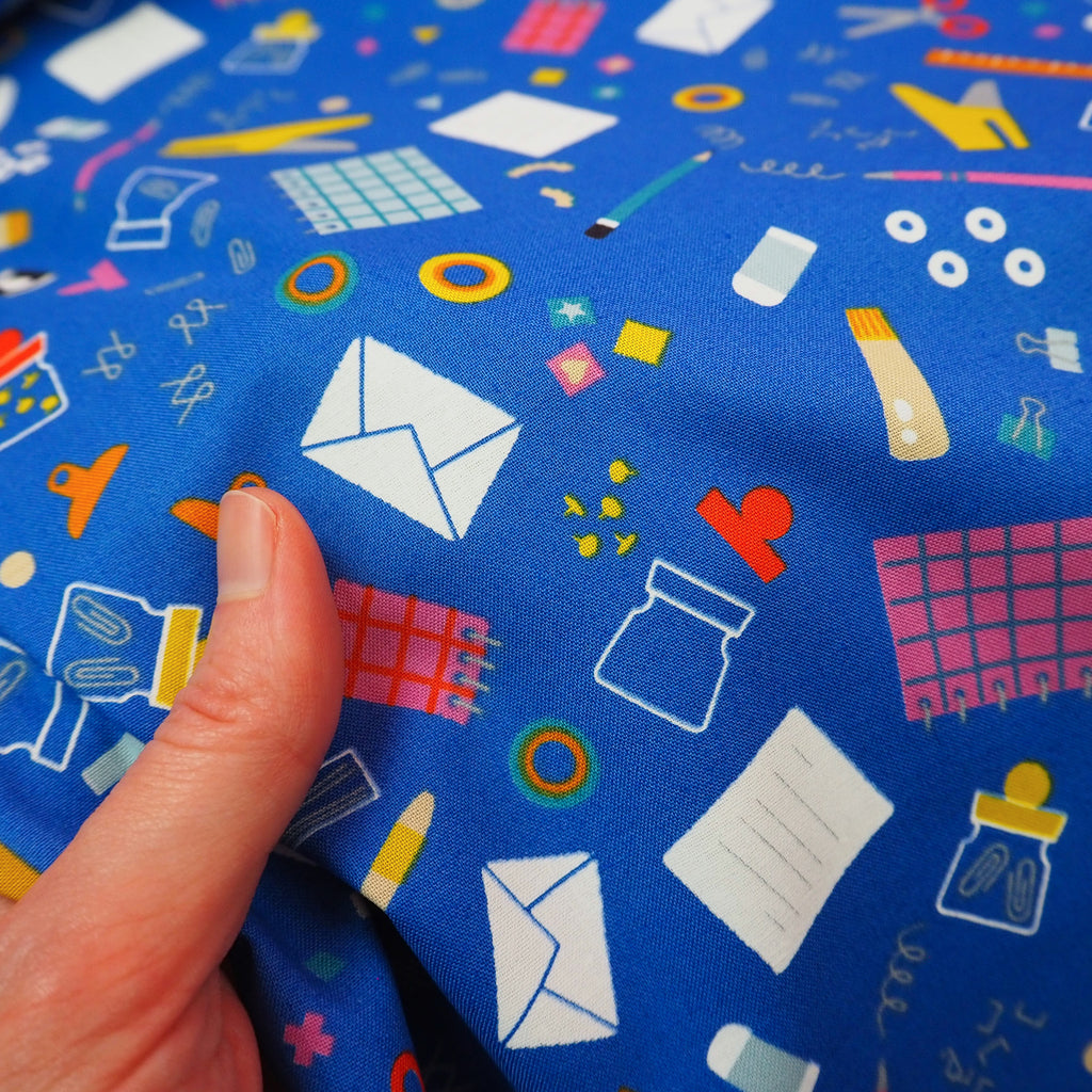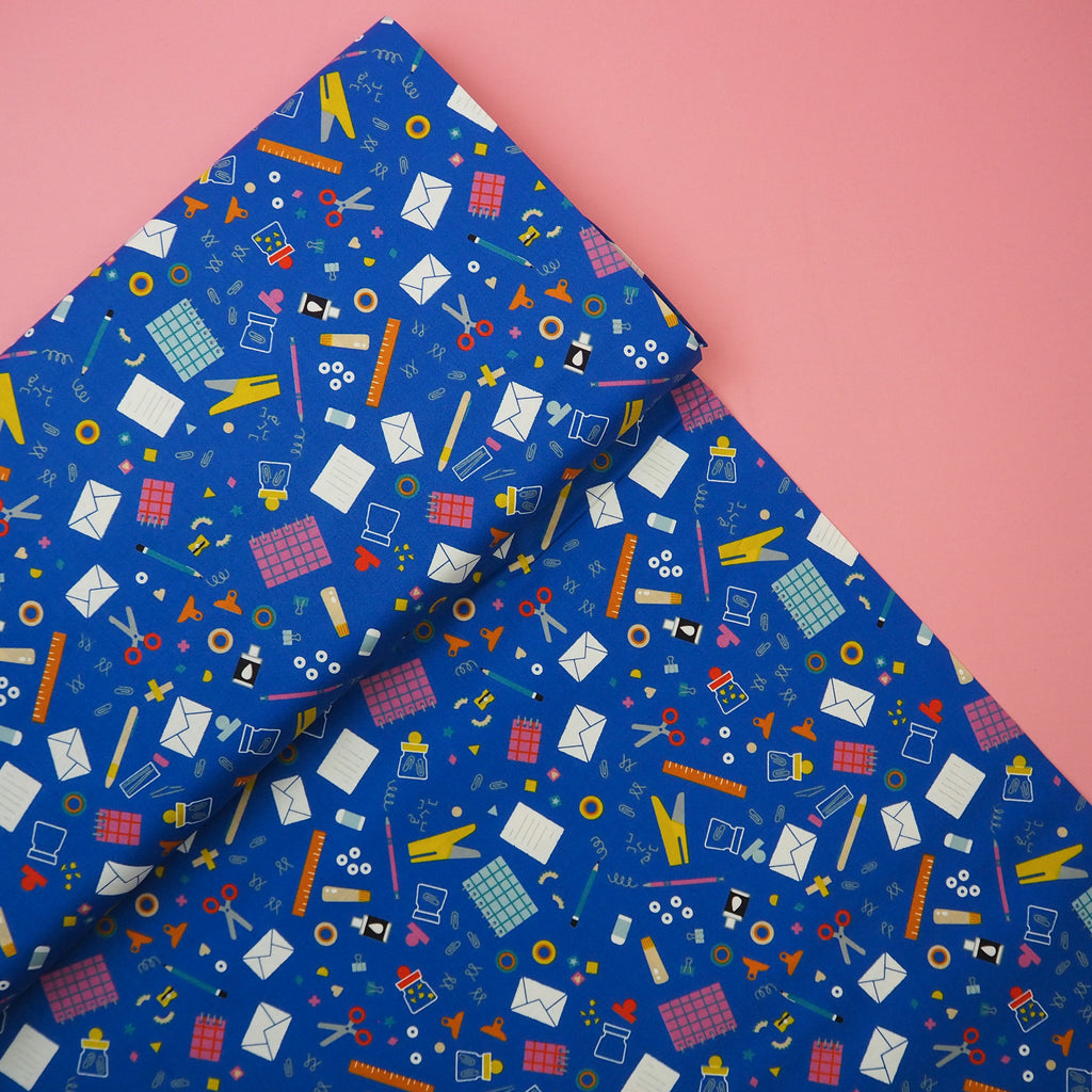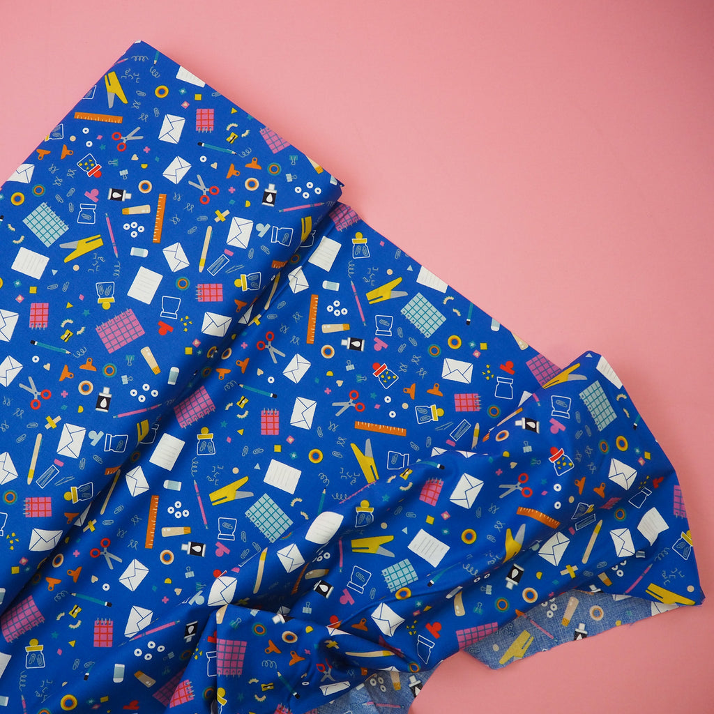 Stationery print in pretty colours on a gorgeous blue background designed by Rashida Coleman Hale for Ruby Star Society.