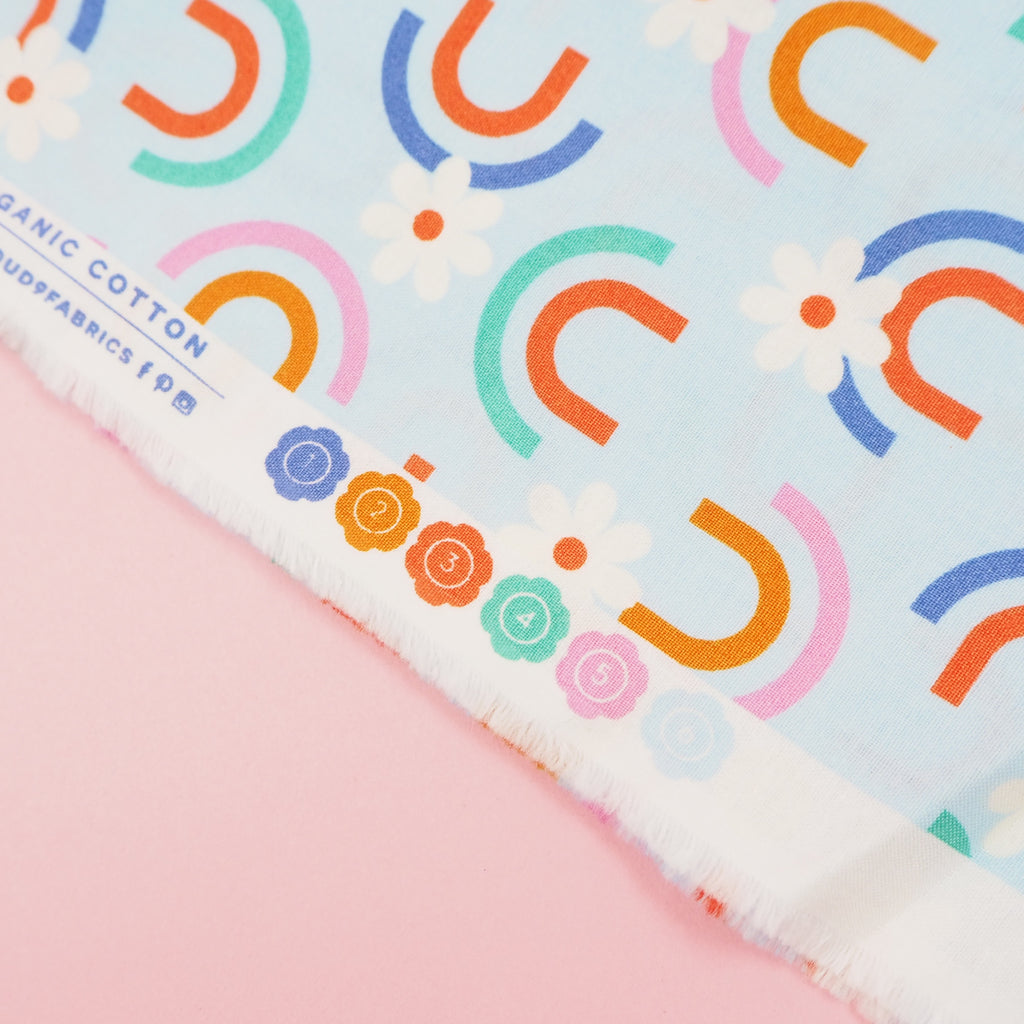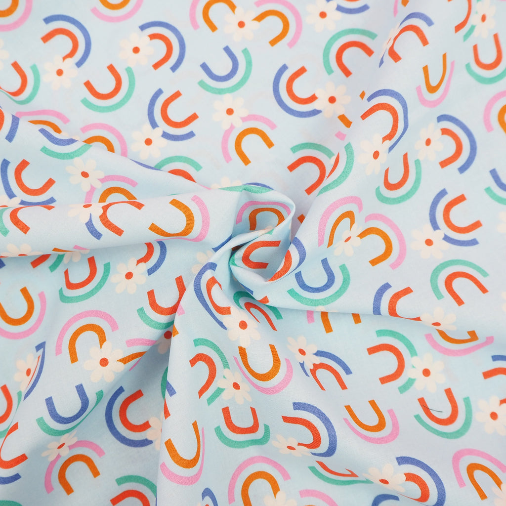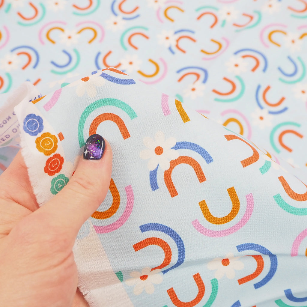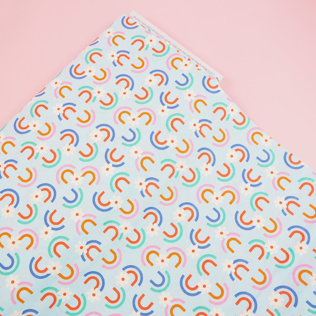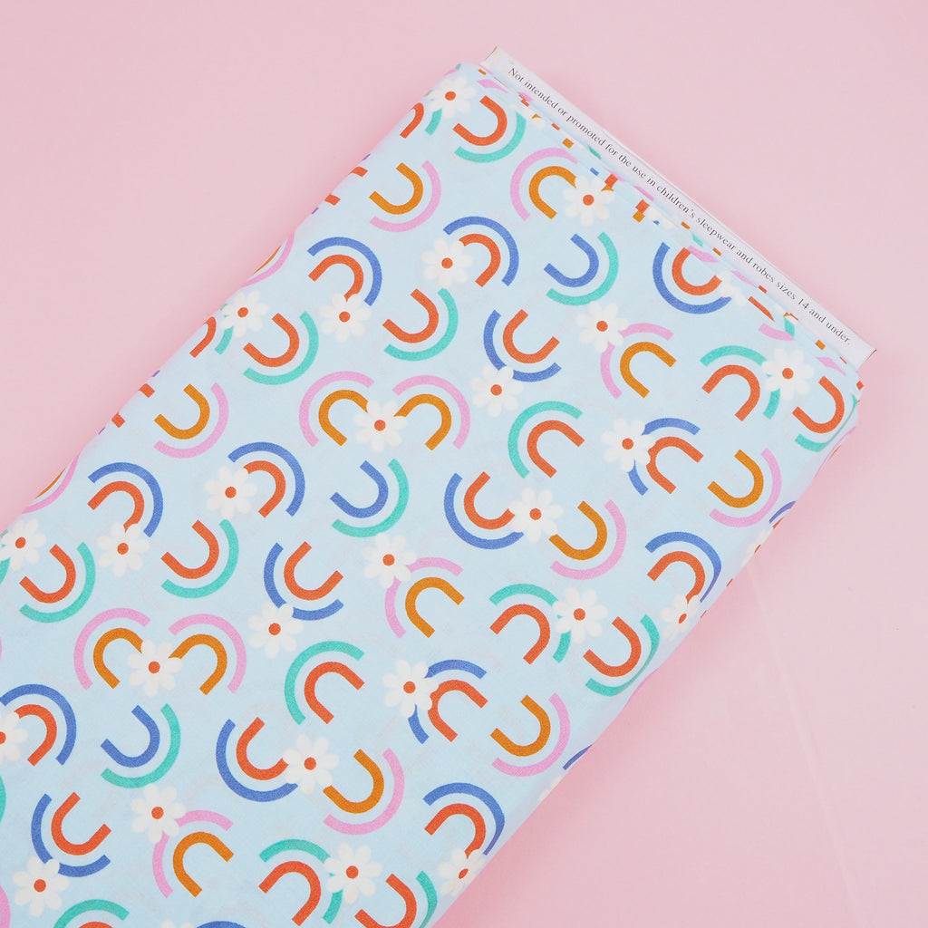 Stylised rainbows and daisies in a retro colour scheme from Elizabeth Olwen's Universal Love collection for Cloud9.