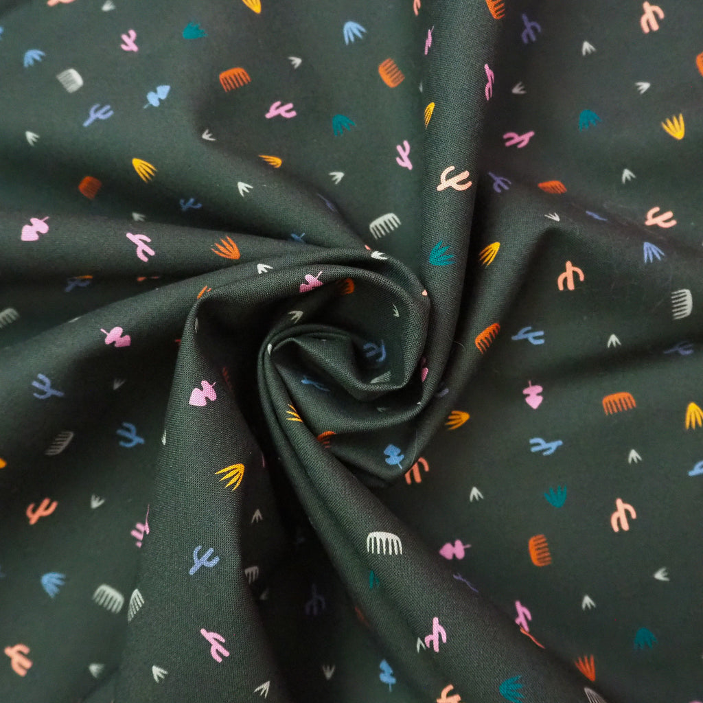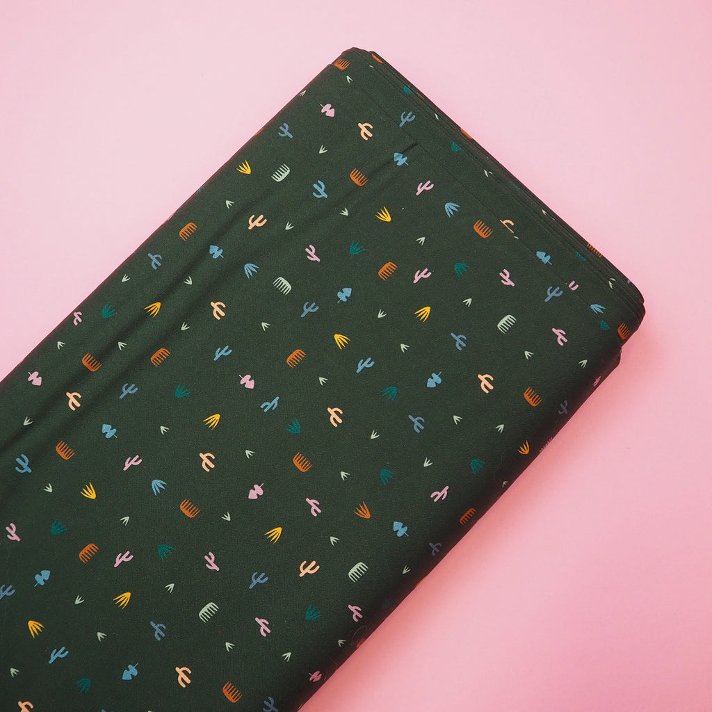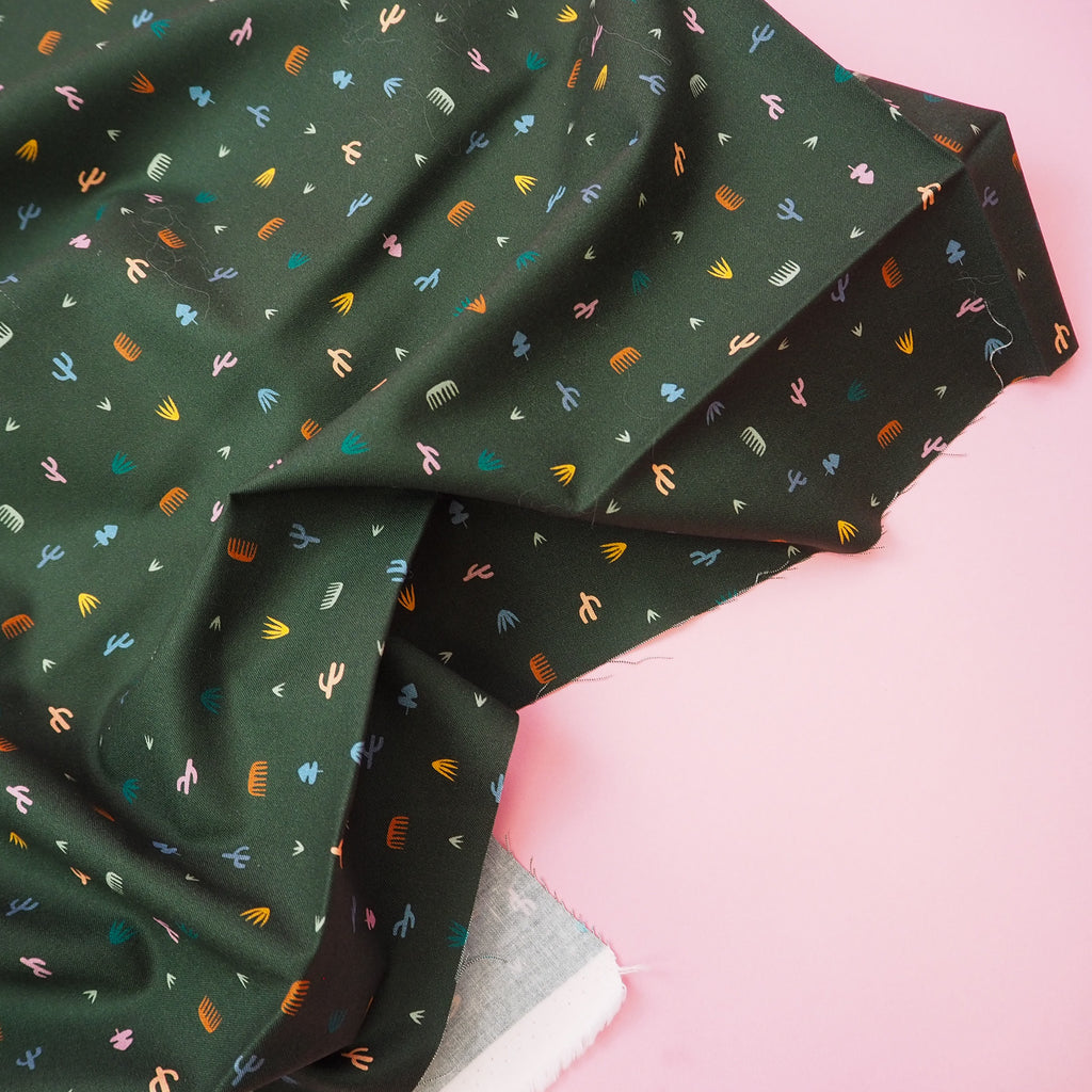 Pretty stylised plant shapes in a retro colour scheme on a dark green background from Leah Duncan's Yuma collection for Cloud9.