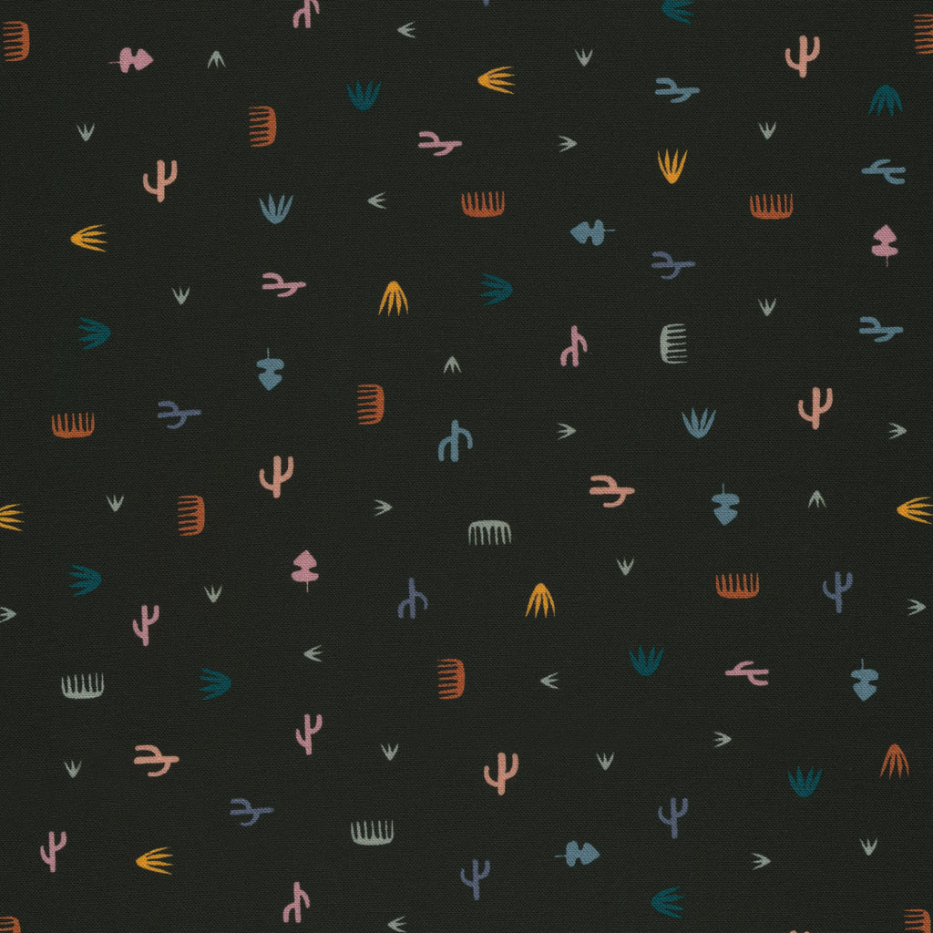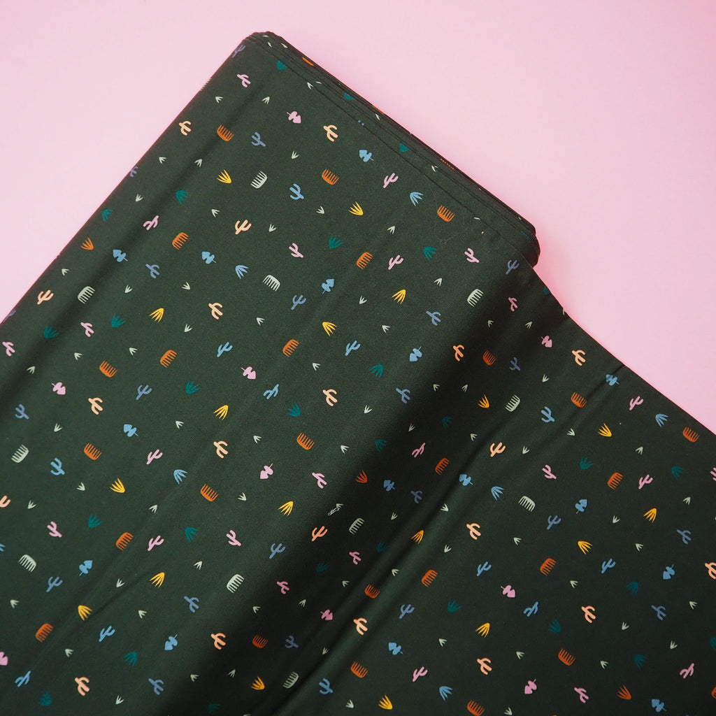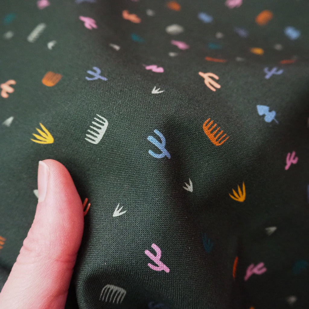 Pretty stylised plant shapes in a retro colour scheme on a dark green background from Leah Duncan's Yuma collection for Cloud9.