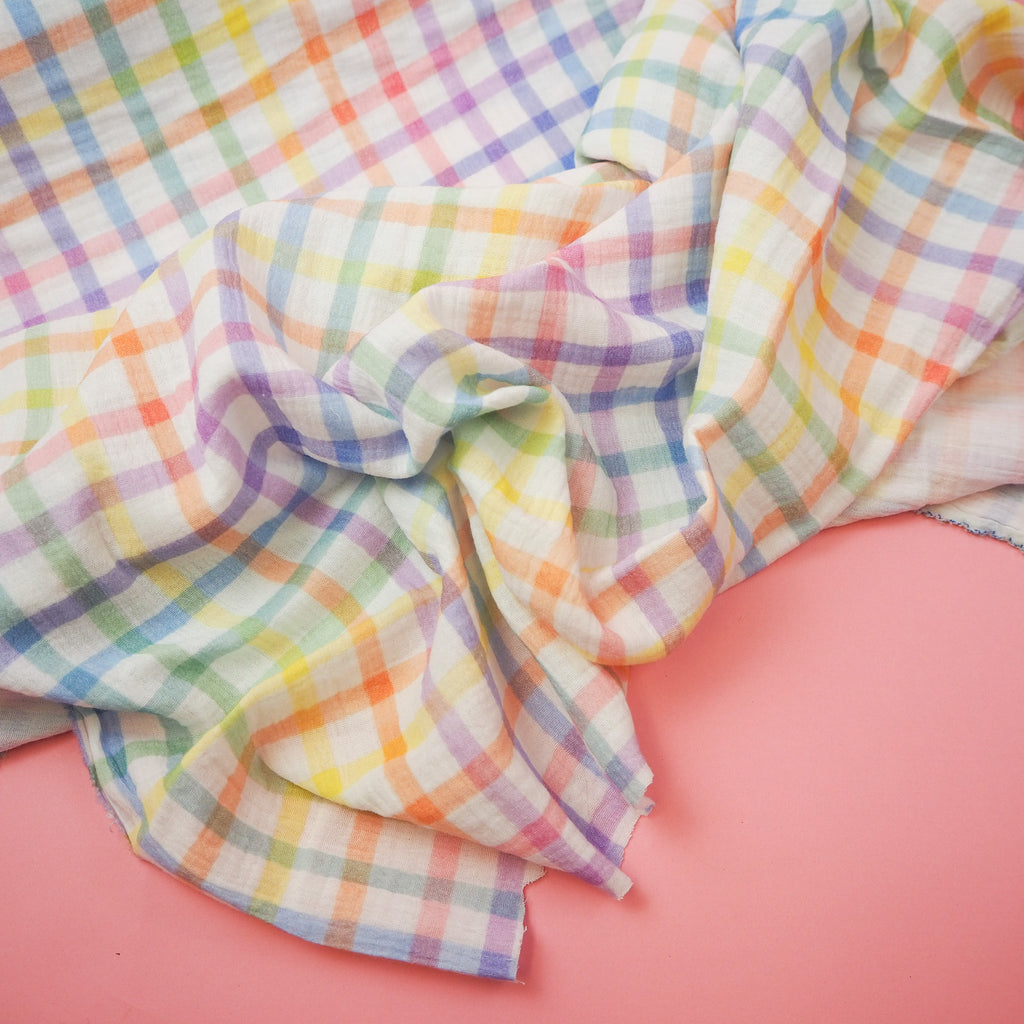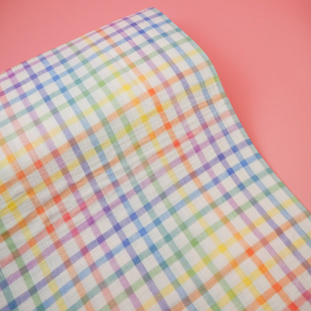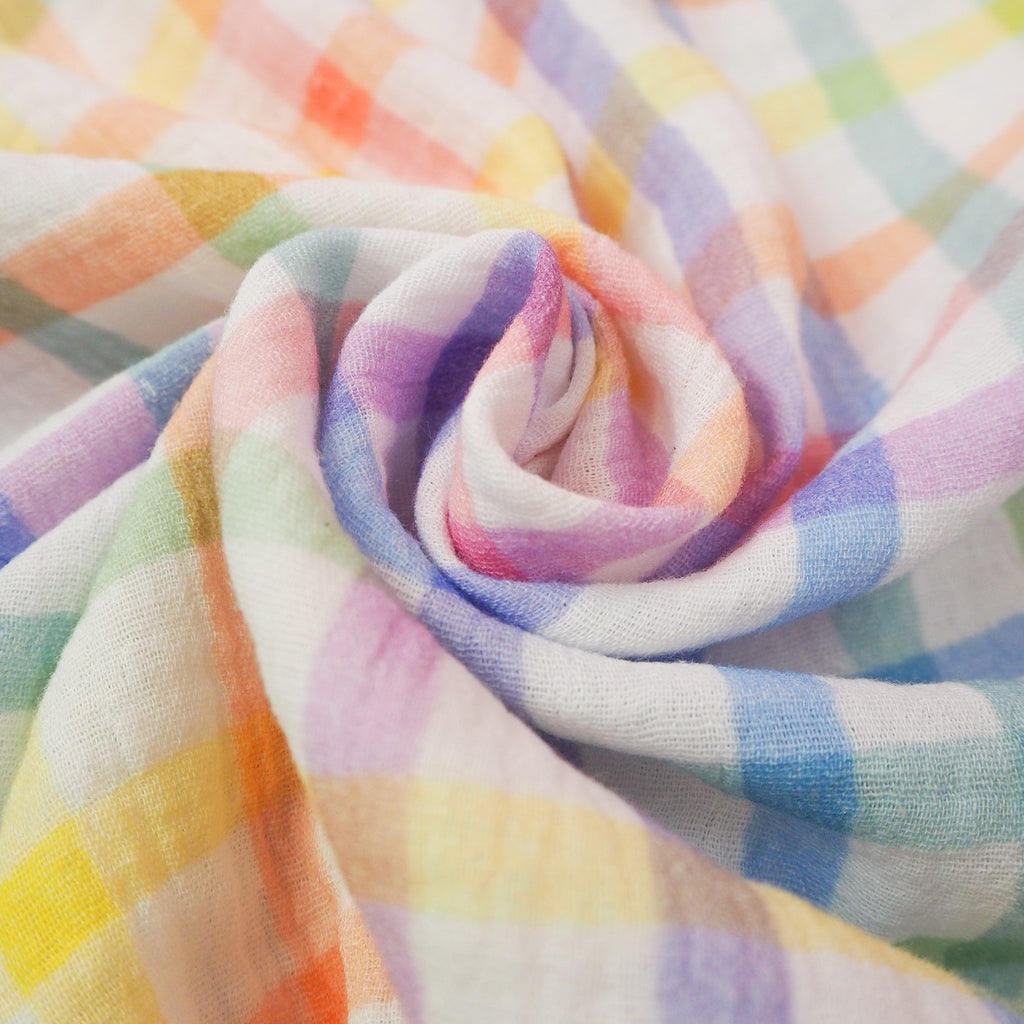 A beautiful, high quality, double gauze base that has an extremely soft, delicate handle. Featuring a loosely drawn rainbow checkered design that is set against a crisp white background.