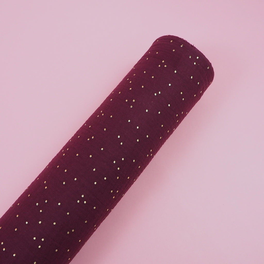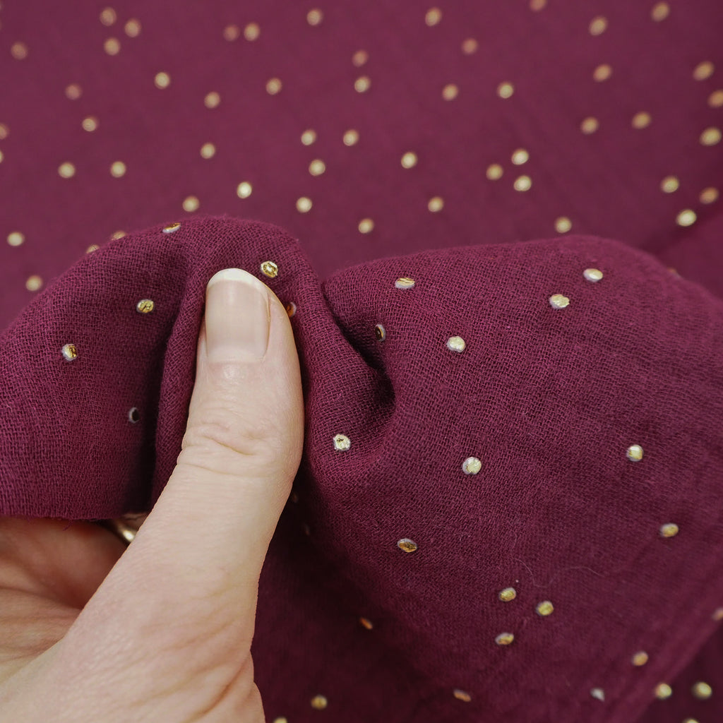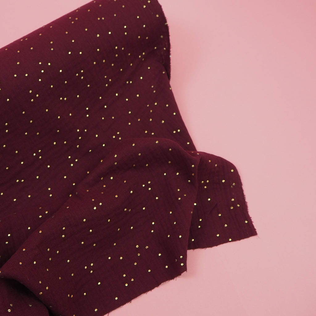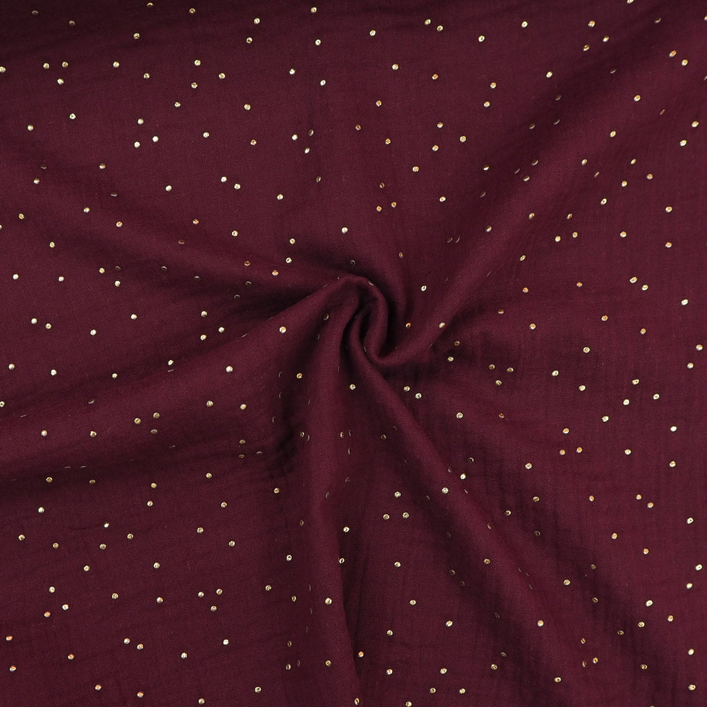 A wine coloured red-purple double gauze sprinkled with pretty golden dots. Great for a soft, floaty dress or skirt with lots of gathers.
