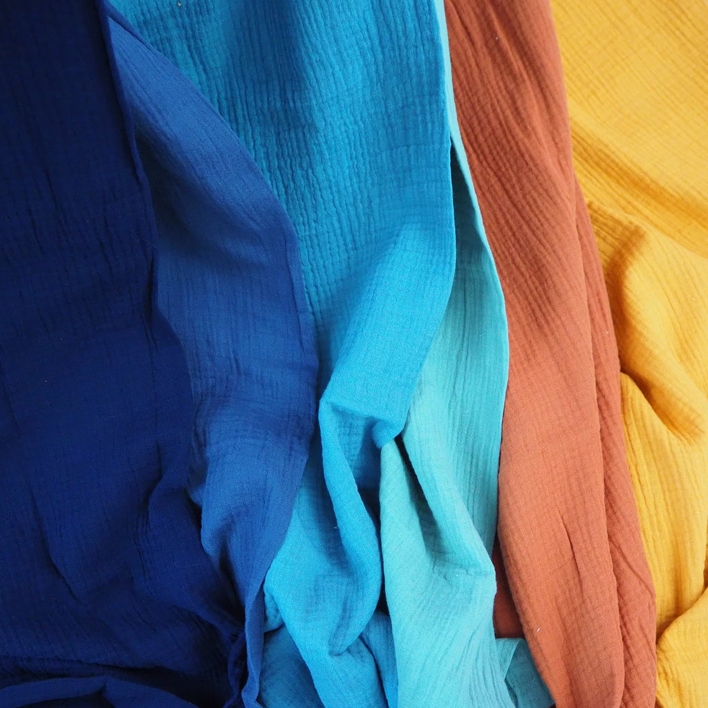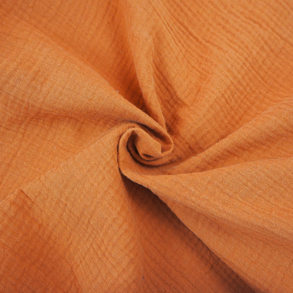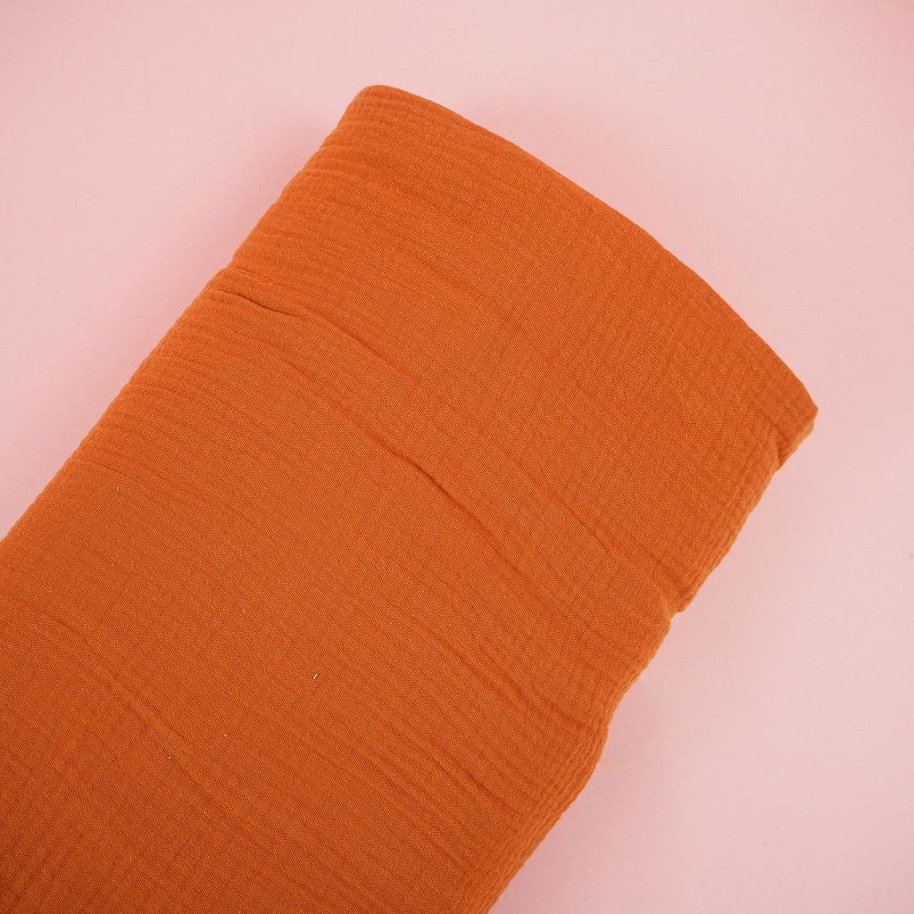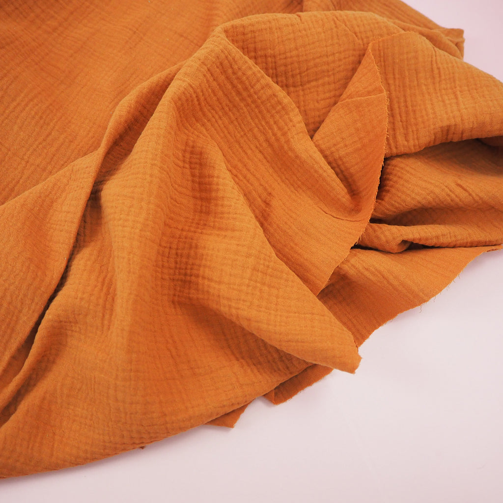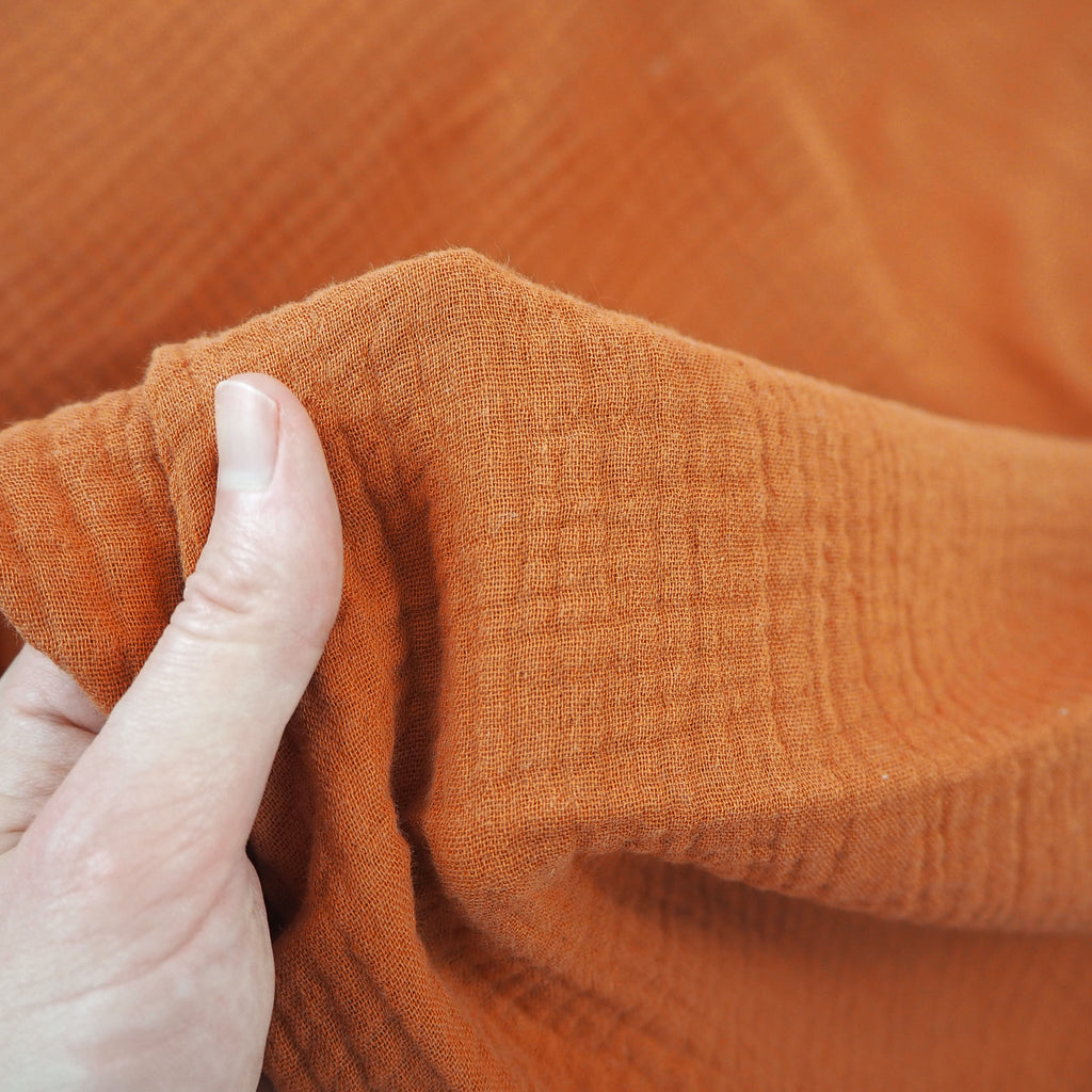 A pretty Autumnal rust coloured double gauze from the Sakata range by Modelo Fabrics. This cotton fabric is Oeko-tex certified, super soft and ideal for comfortable pyjamas, light pullovers and gathered dresses.