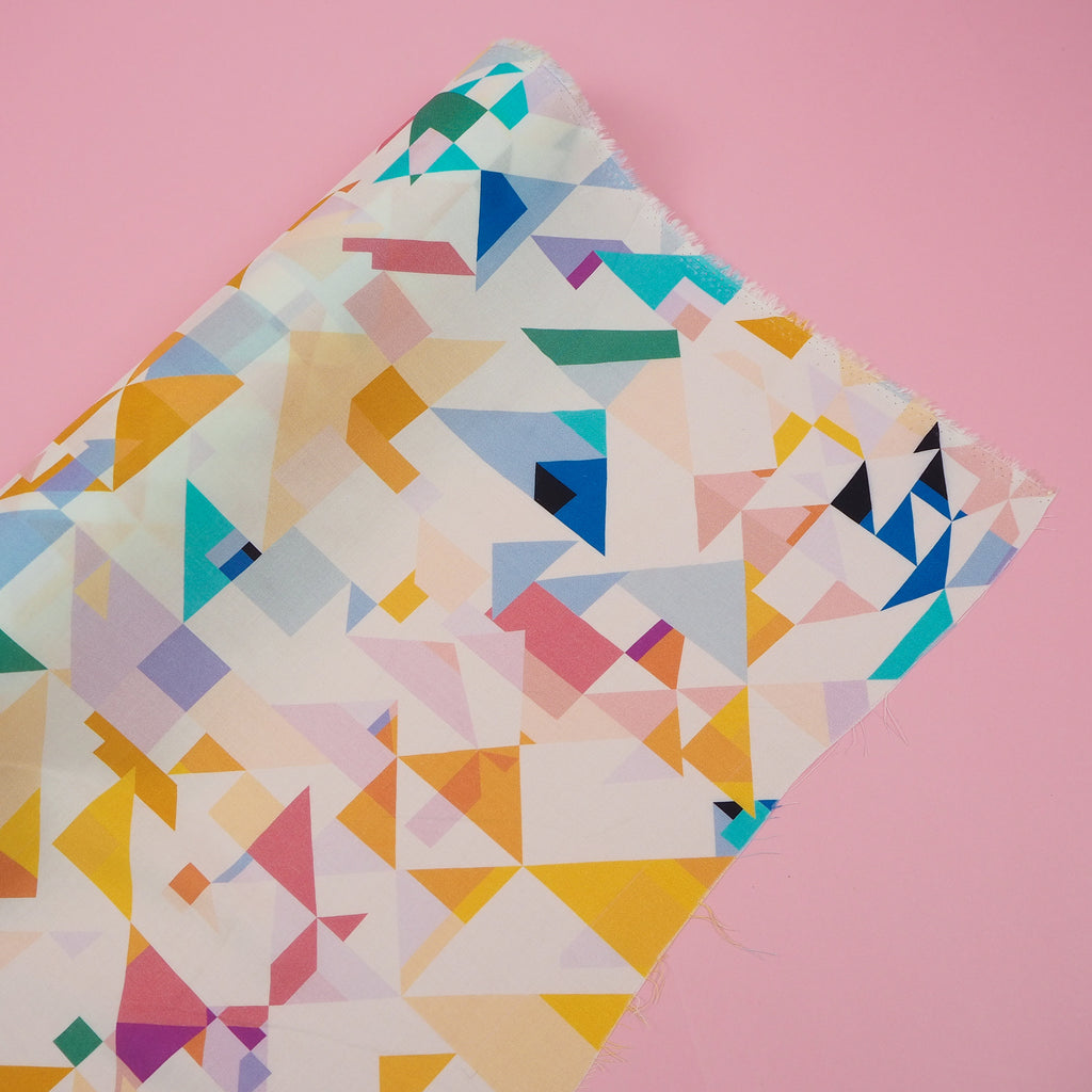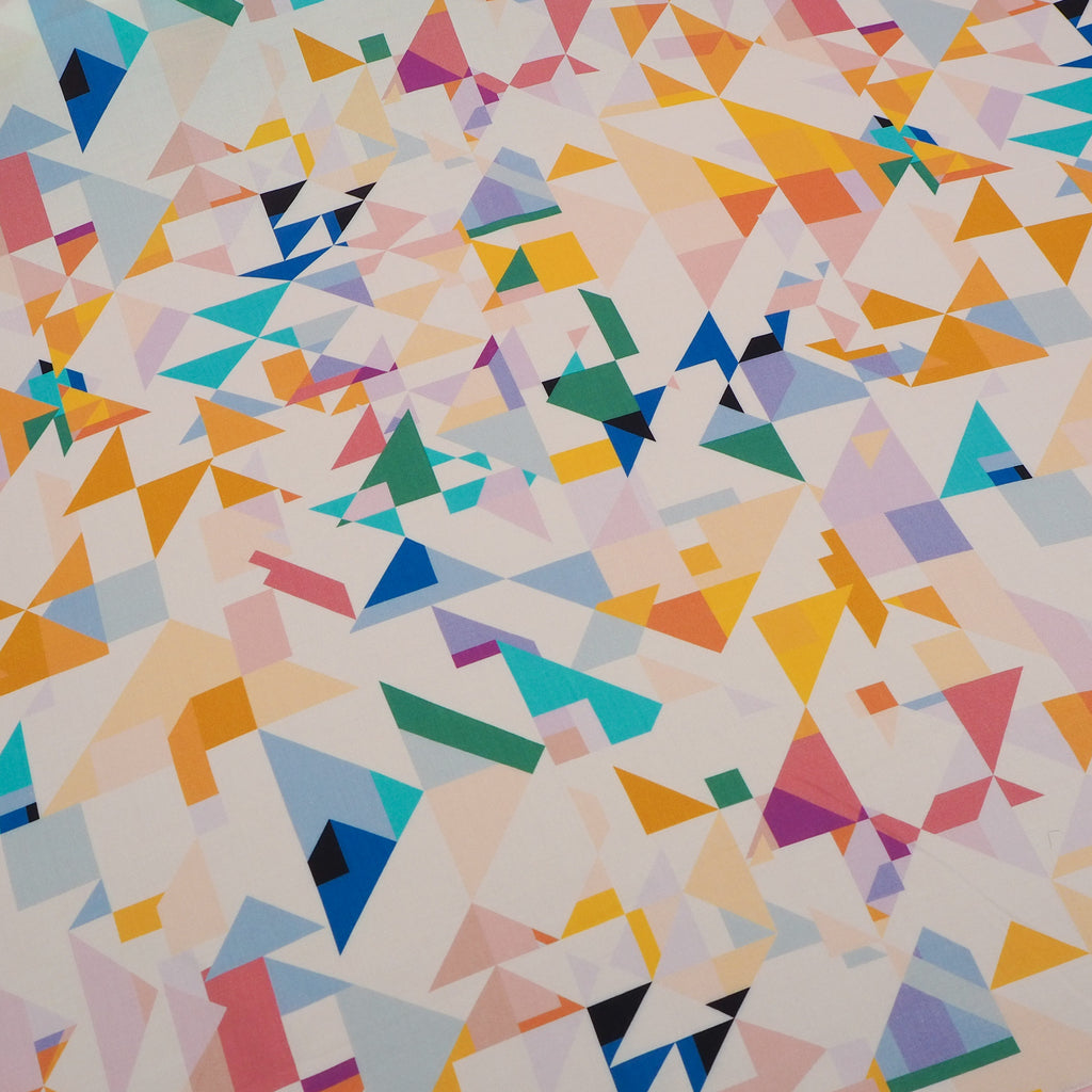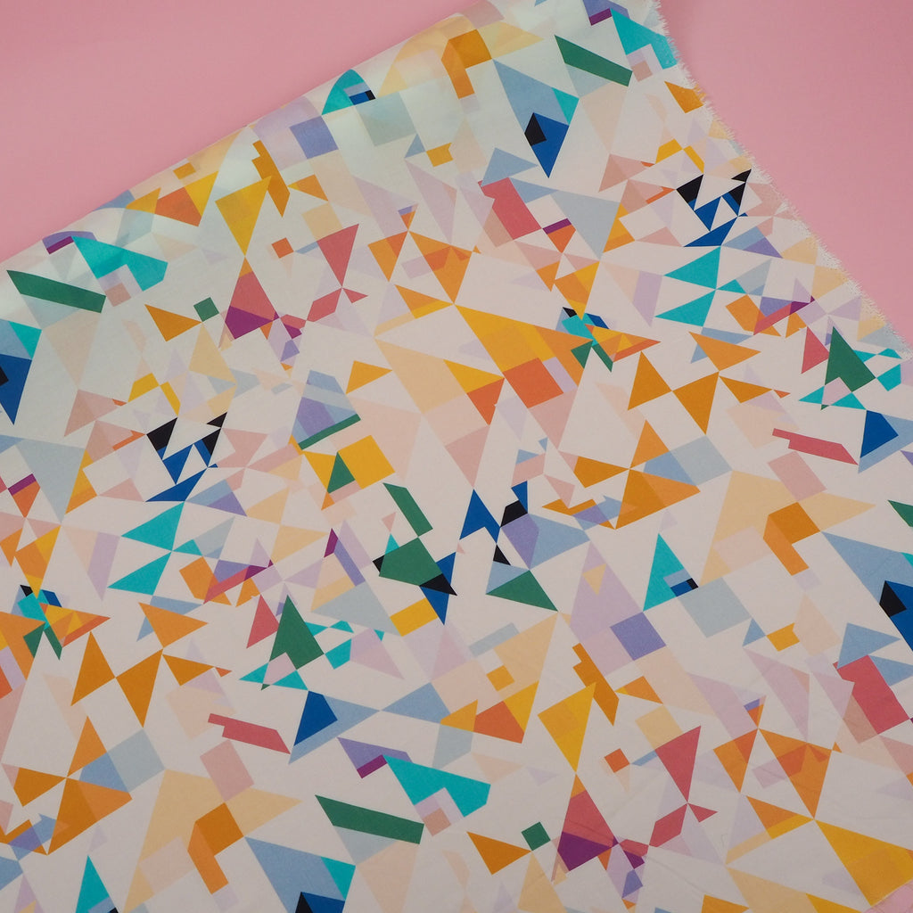 A soft and floaty rayon fabric with a beautiful rainbow geometric pattern from Rachel Parker's Circle Line collection.
