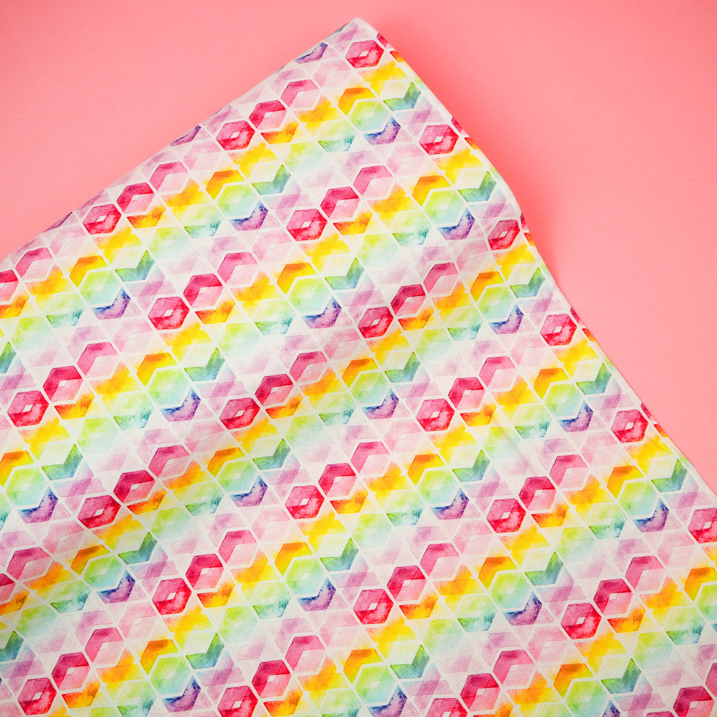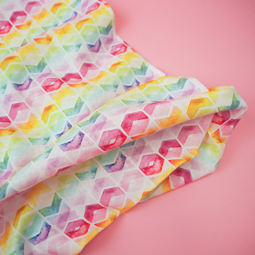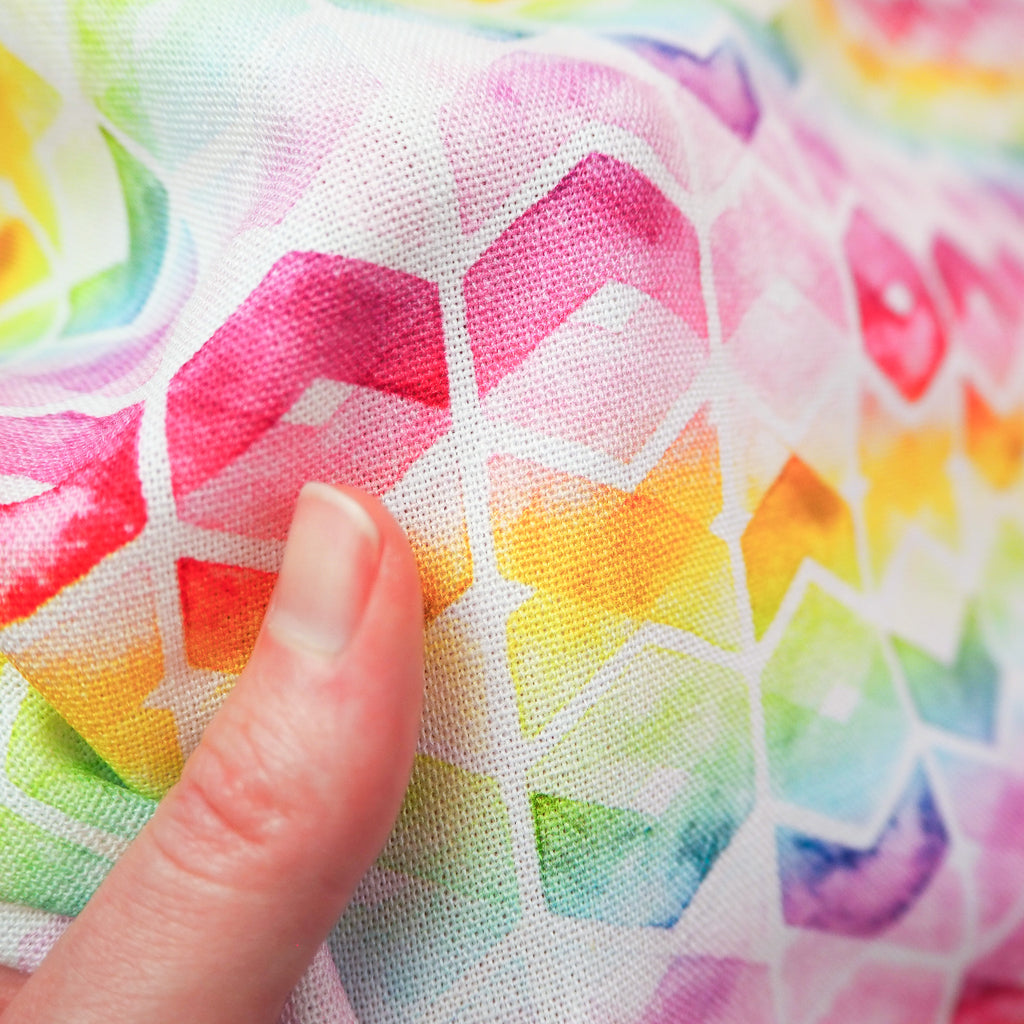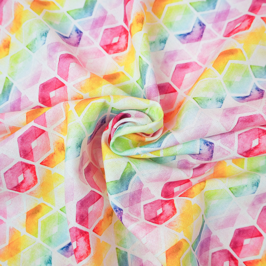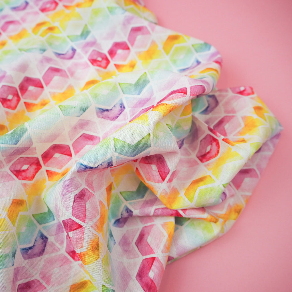 This rayon/linen blend features a geometric design made up of watercolour rainbow shapes against a crisp white background.