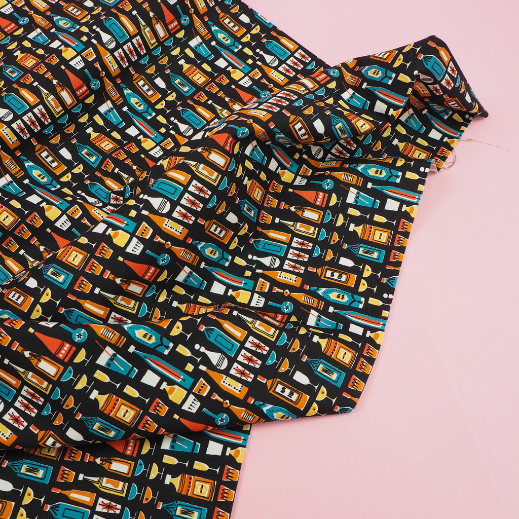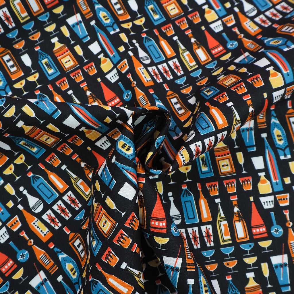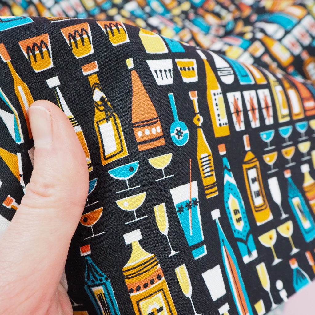 Retro style bottles and cocktails on a black backdrop make this cotton ideal for your vintage patterns. The individual designs are small enough to use for many fussy cutting projects!