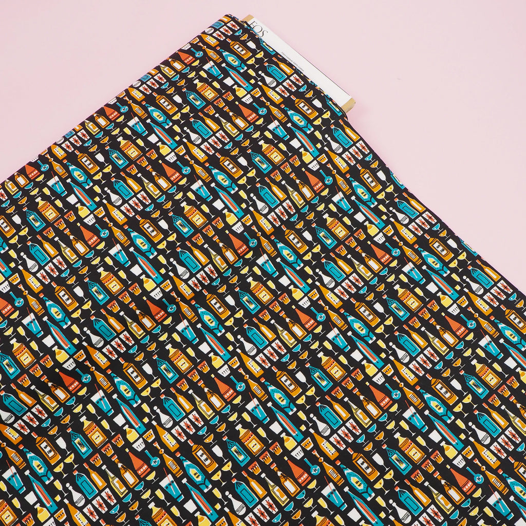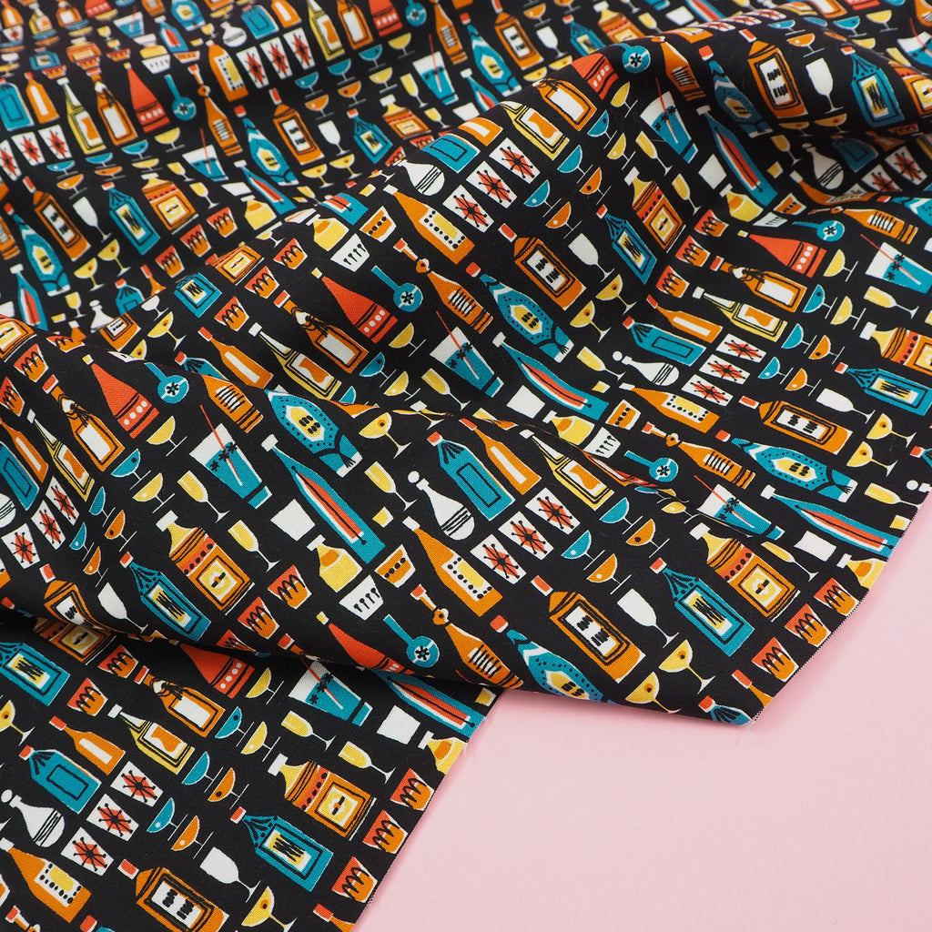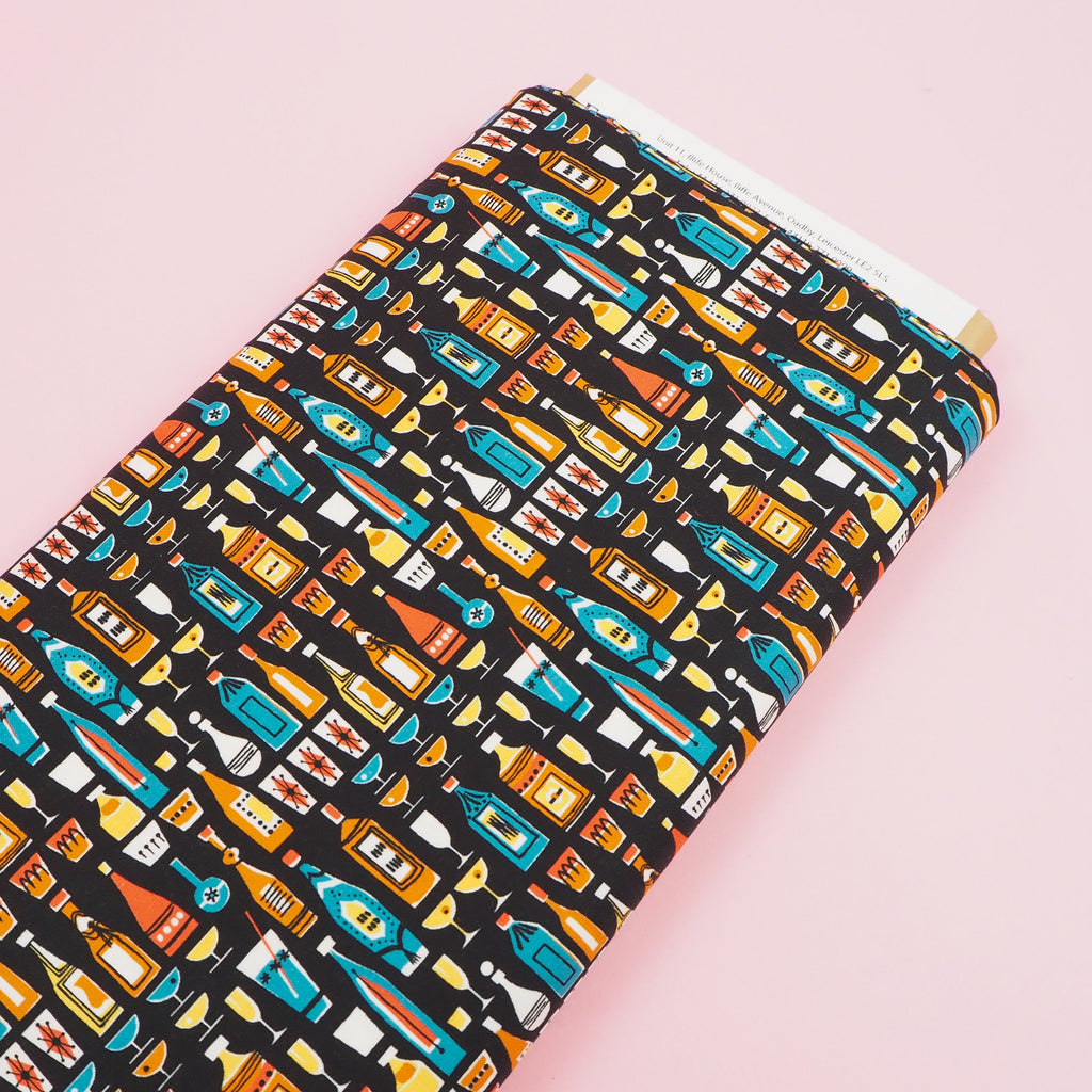 Retro style bottles and cocktails on a black backdrop make this cotton ideal for your vintage patterns. The individual designs are small enough to use for many fussy cutting projects!