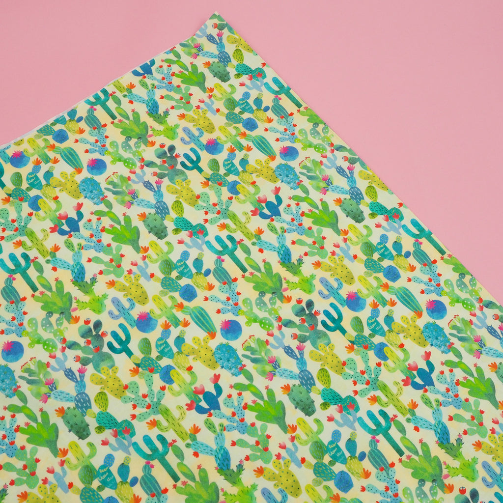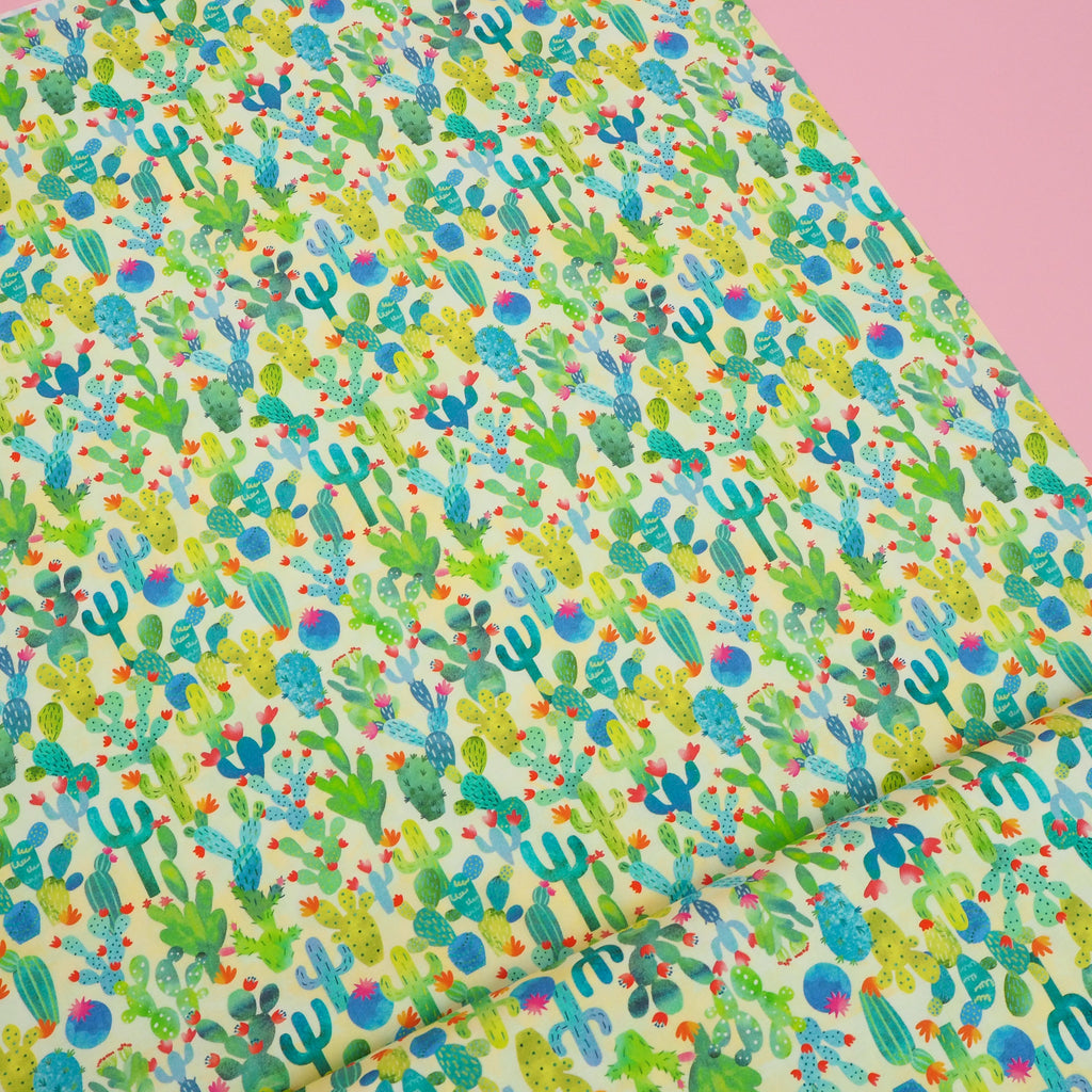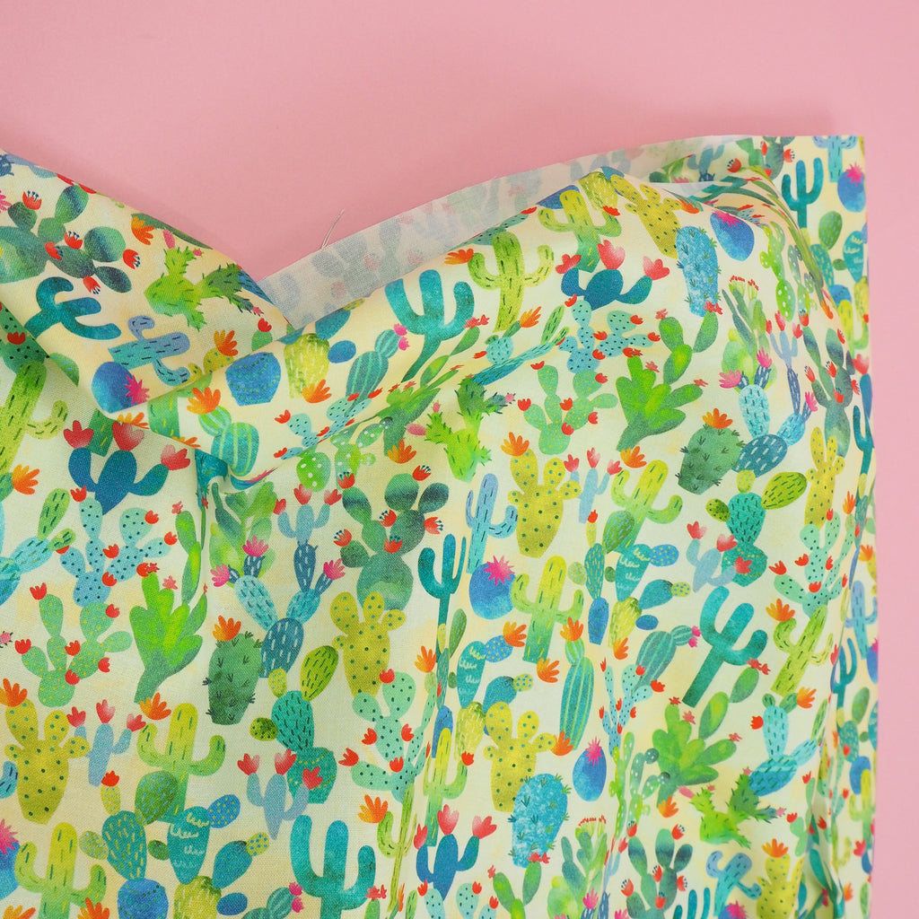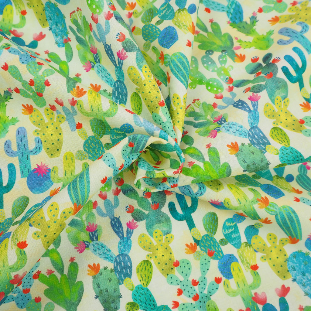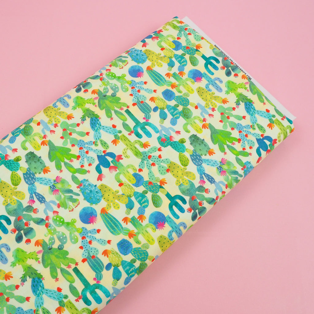 Channel the botanic gardens or an exotic holiday with this cactus garden cotton. The green and yellow colour scheme features flashes of red and blue for a colourful craft project. This bright pattern would make a cute shift or a great addition to a quilt.