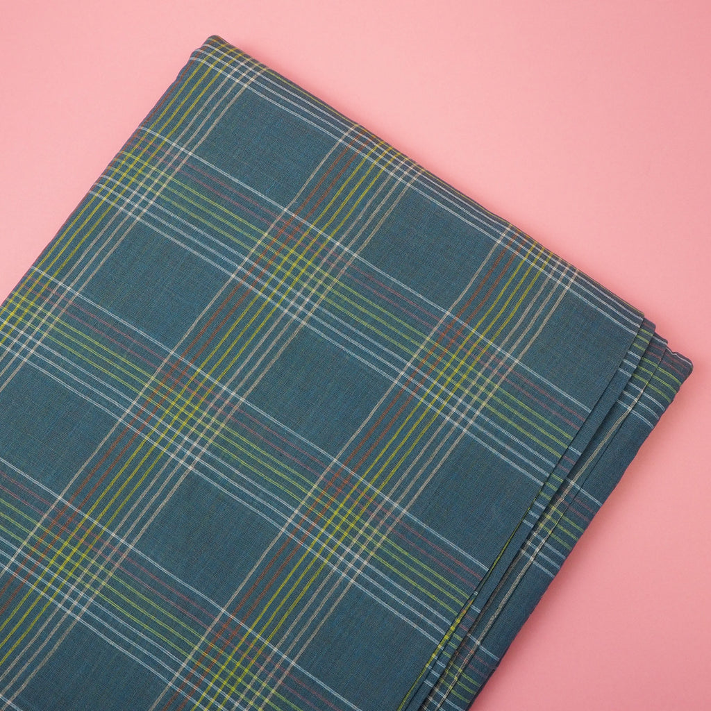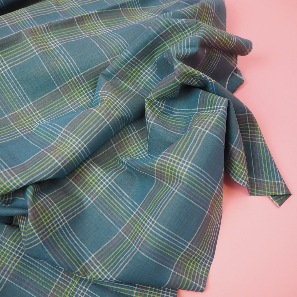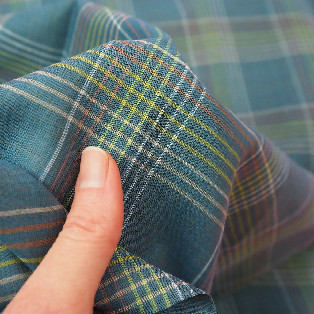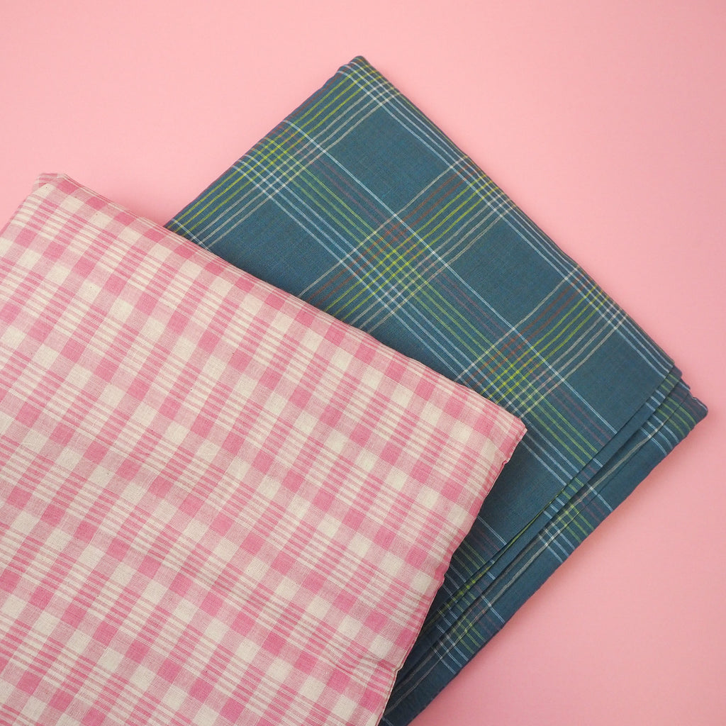 Mayday is a hand woven check of dusty blue with stripes of white, green and pink running through.