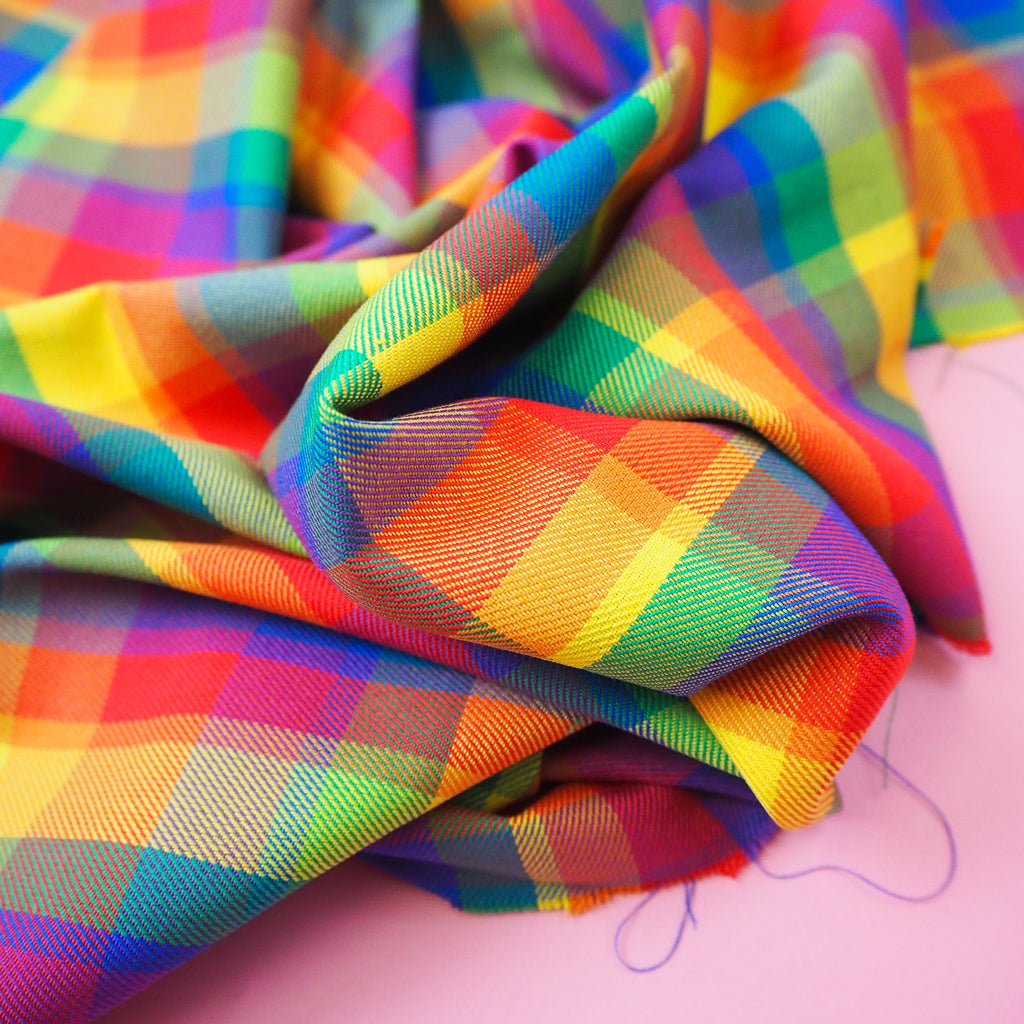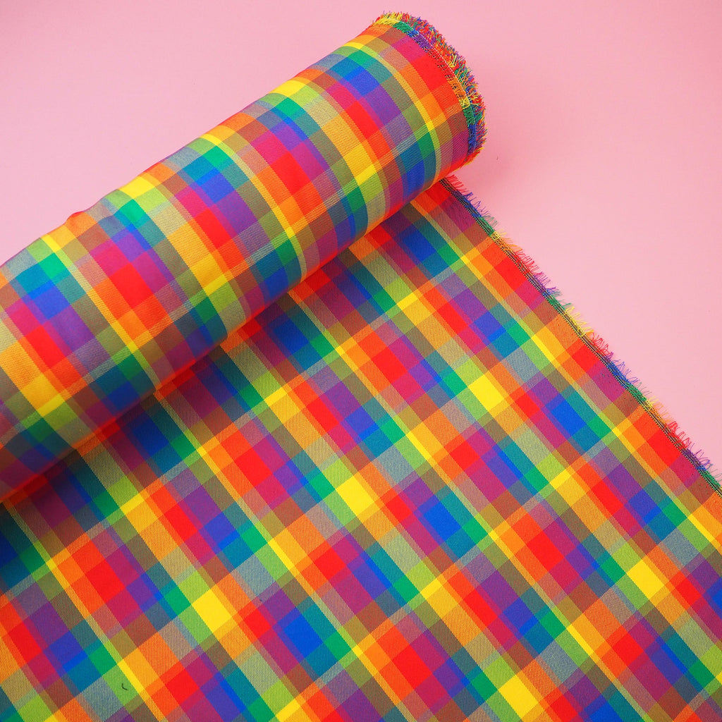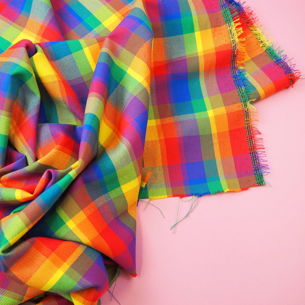 Bright rainbow tartan in polyester and viscose blend fabric. Polyviscose is durable and drapey with a smooth feel and is ideal for dresses and swishy skirts.