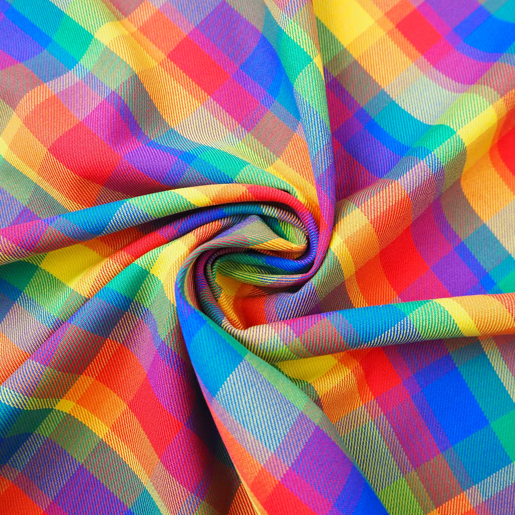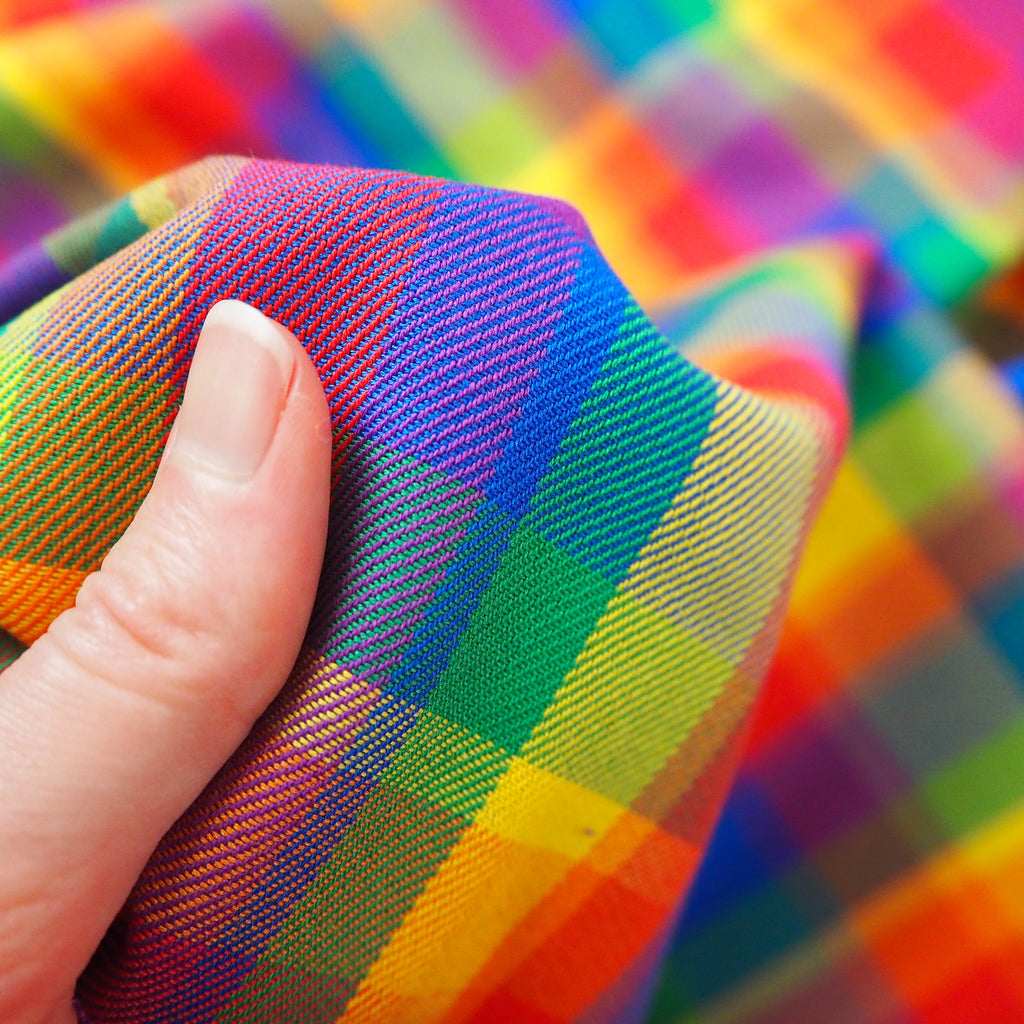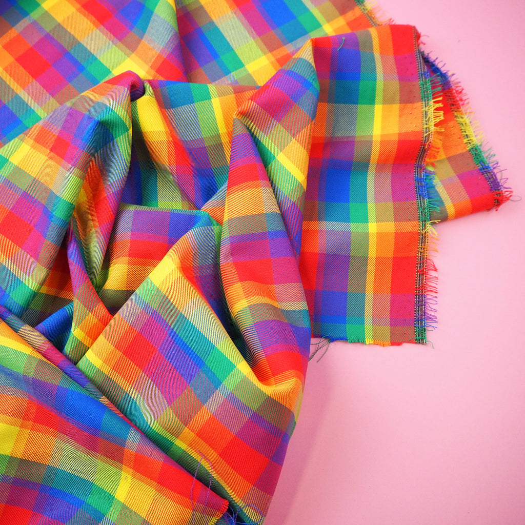 Bright rainbow tartan in polyester and viscose blend fabric. Polyviscose is durable and drapey with a smooth feel and is ideal for dresses and swishy skirts.