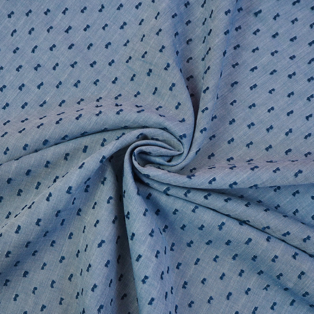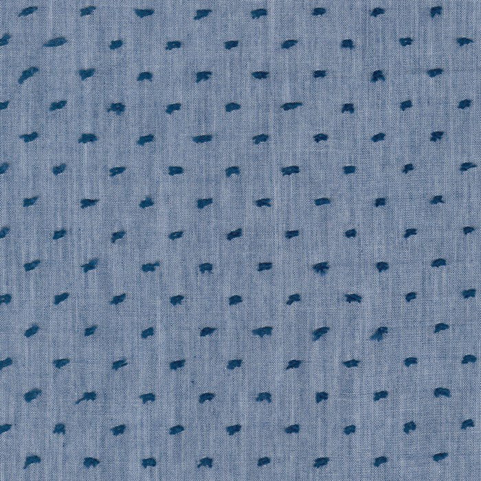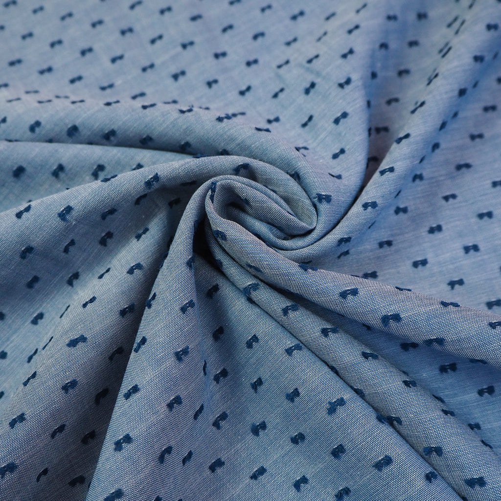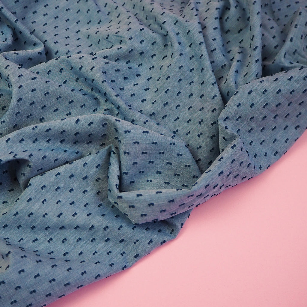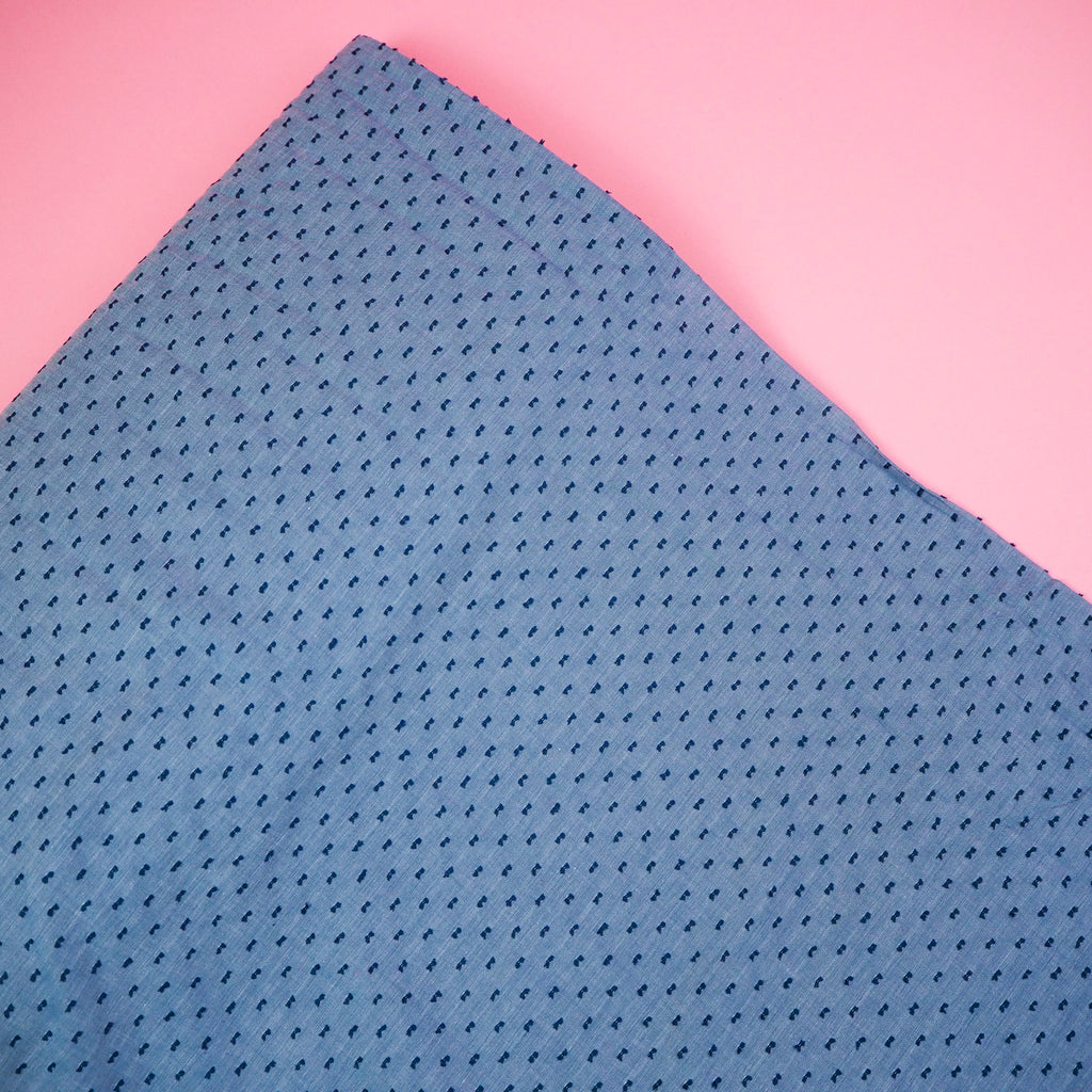 Woven cotton Robert Kaufman chambray in "denim" colour with little raised deep blue dots. This chambray is lightweight and breezy with a lovely textured feel.