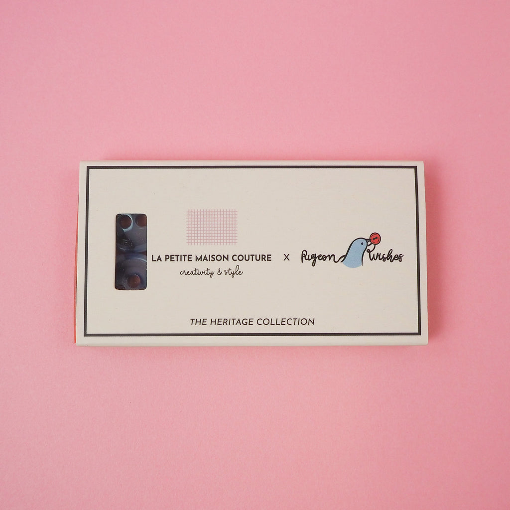 Tough, glossy blue and white buttons made from resin: each button is one of a kind! These buttons are smooth, tough and lightweight. Sold in packs of 8 and beautifully packaged in a little box.