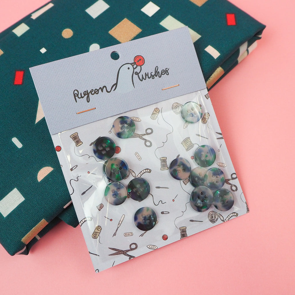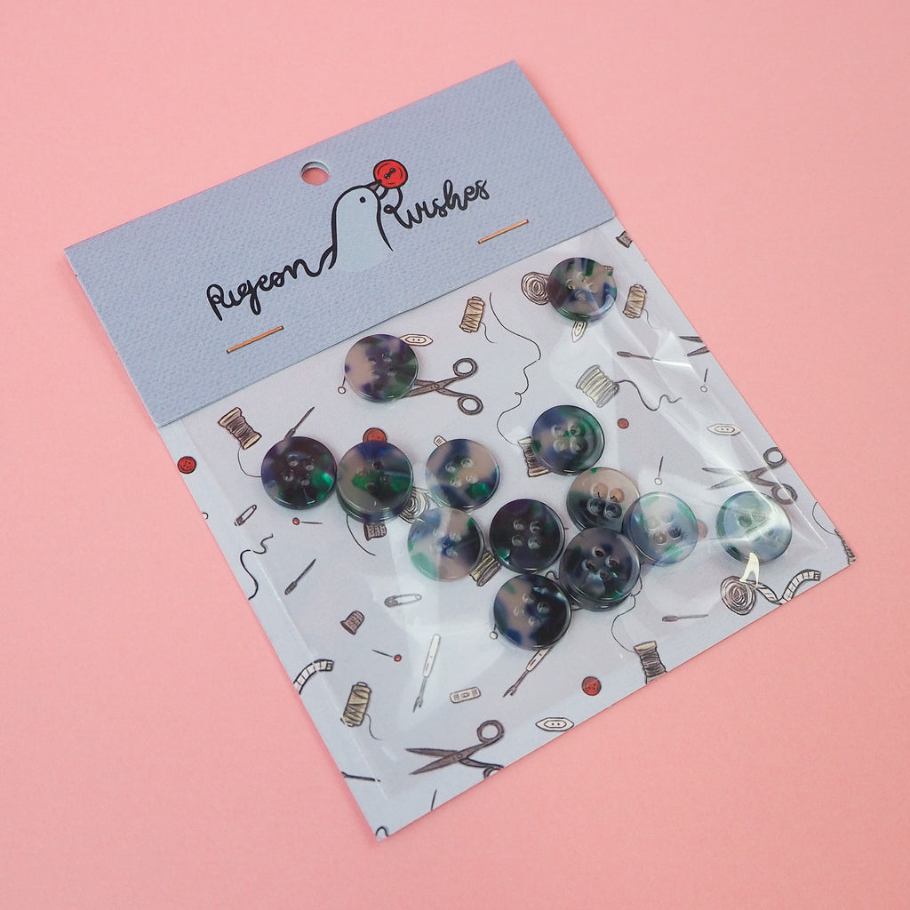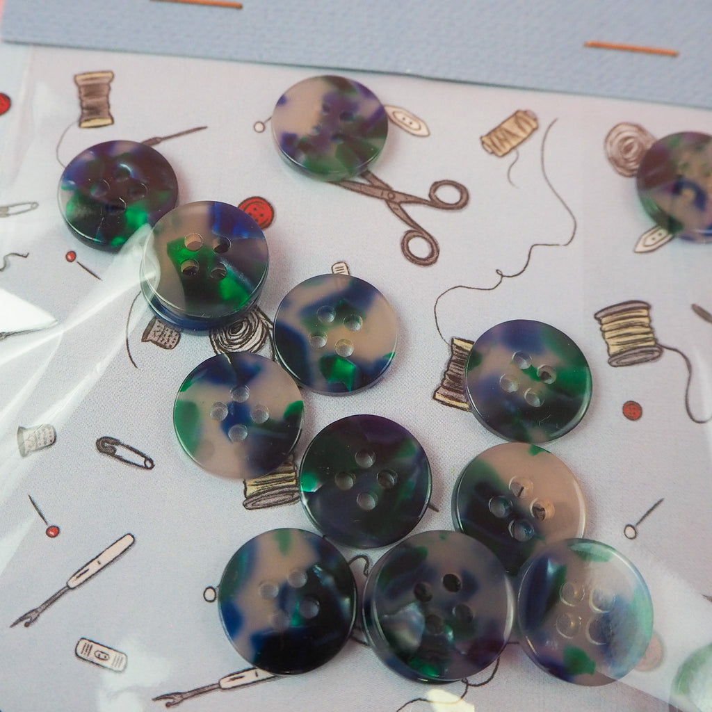 Tough, glossy buttons made from resin: each button is one of a kind! These buttons are lightweight and sold in packs of 15.