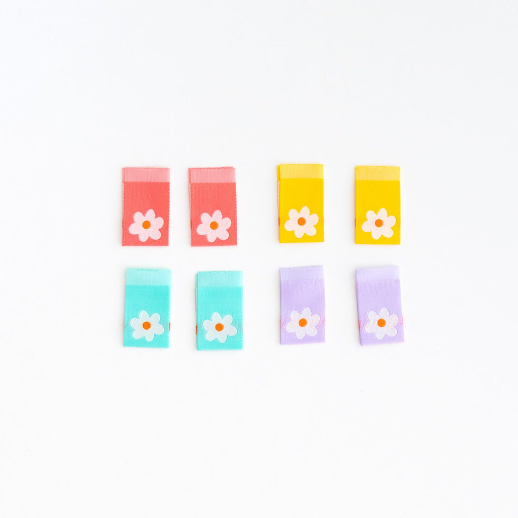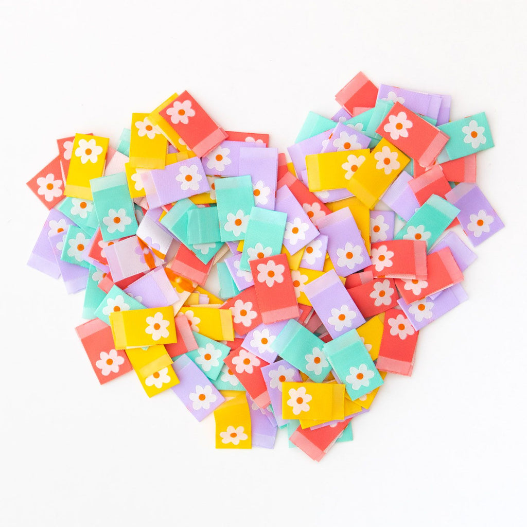 These high quality double-sided woven labels feature bright yellow, pink, mint and lavender tags each with cream and orange daisy. They are super soft to the touch, fully washable and can handle the heat of the dryer.