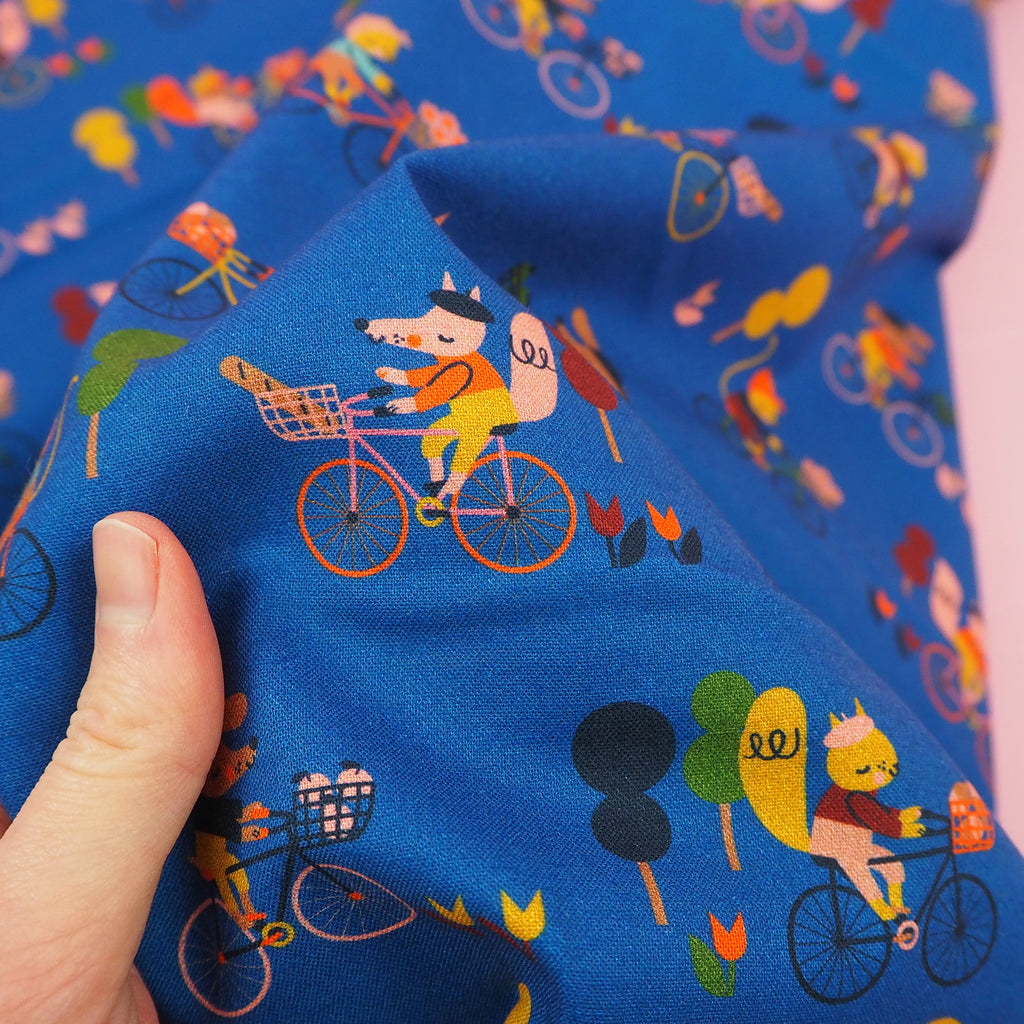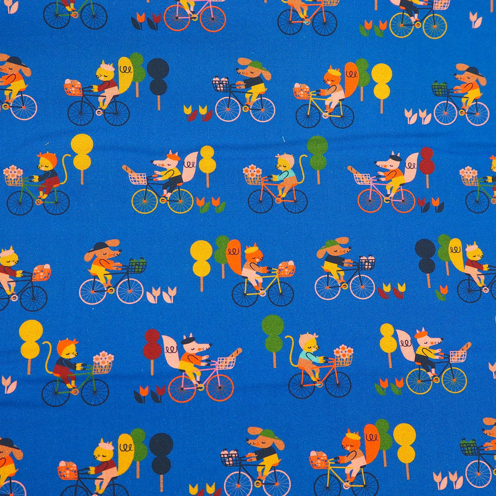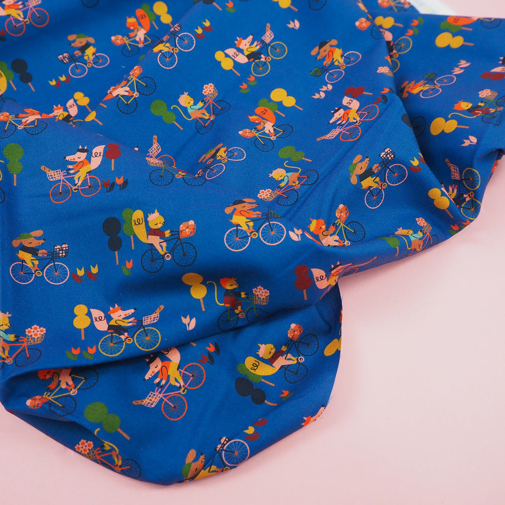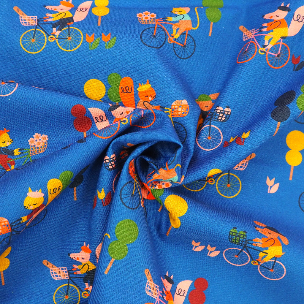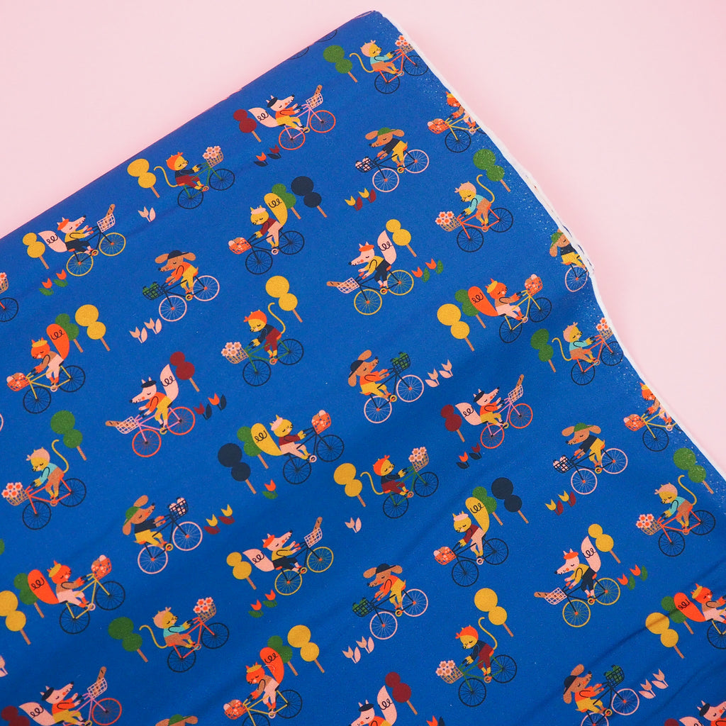 Adorable animals cycling on blue quilting cotton designed by Jilly Philipps for Dashwood Studio.