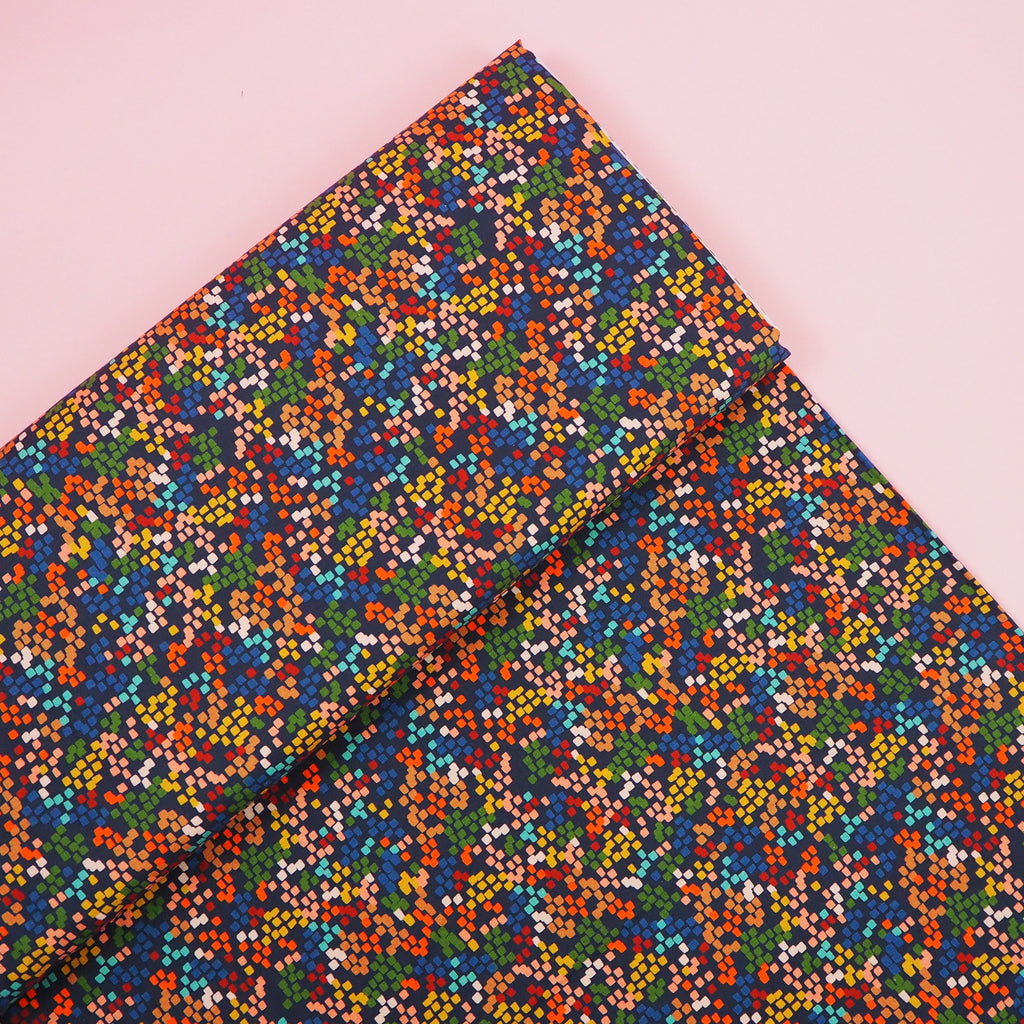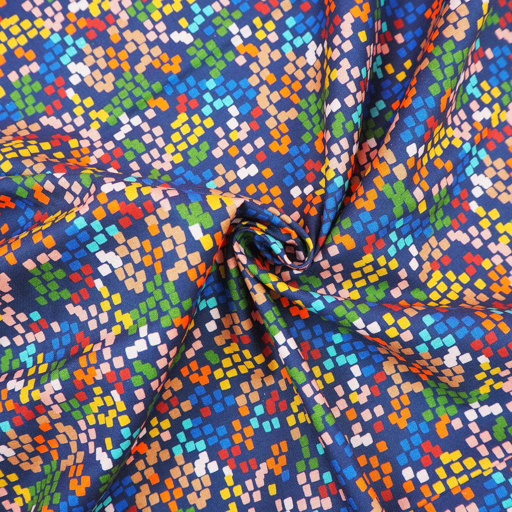 Colourful squares on navy quilting cotton designed by Jilly Philipps for Dashwood Studio.