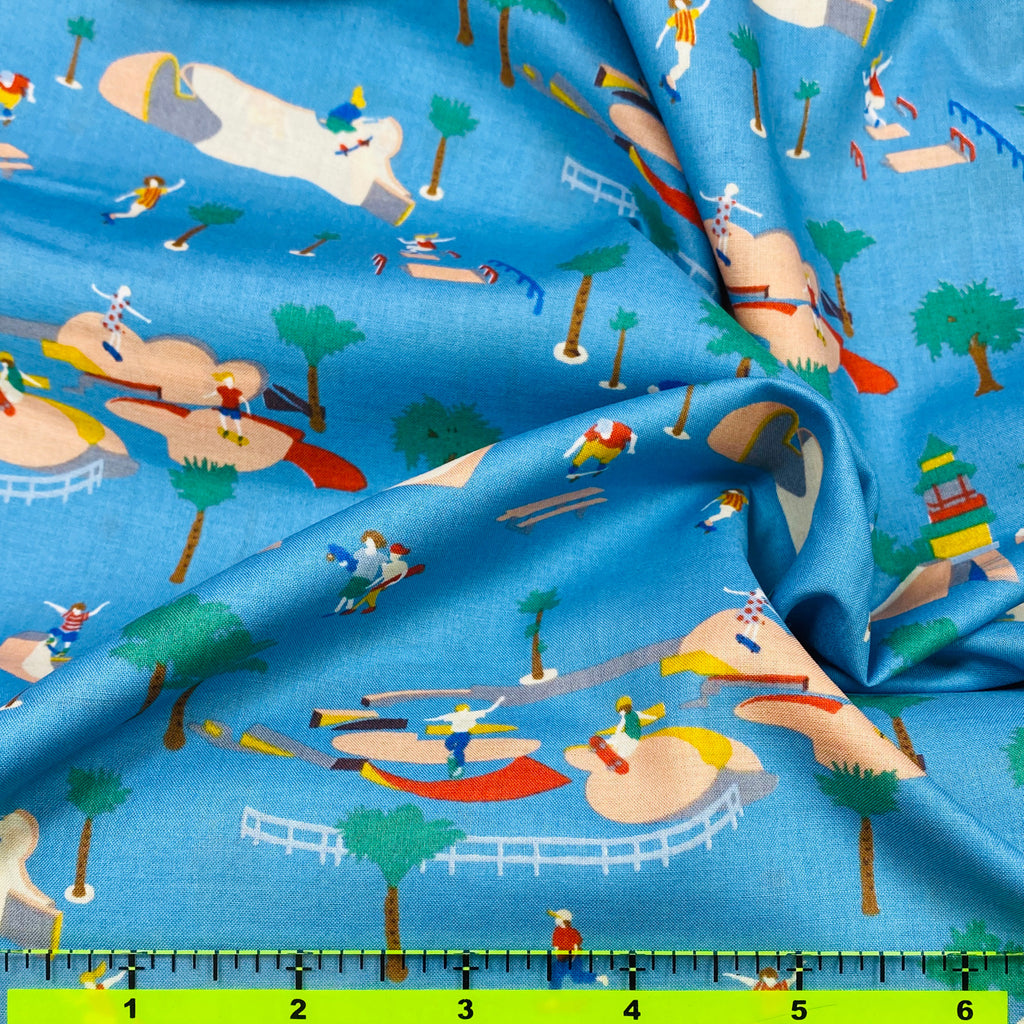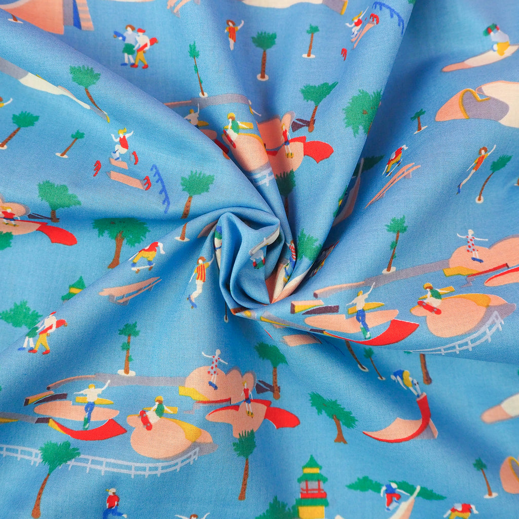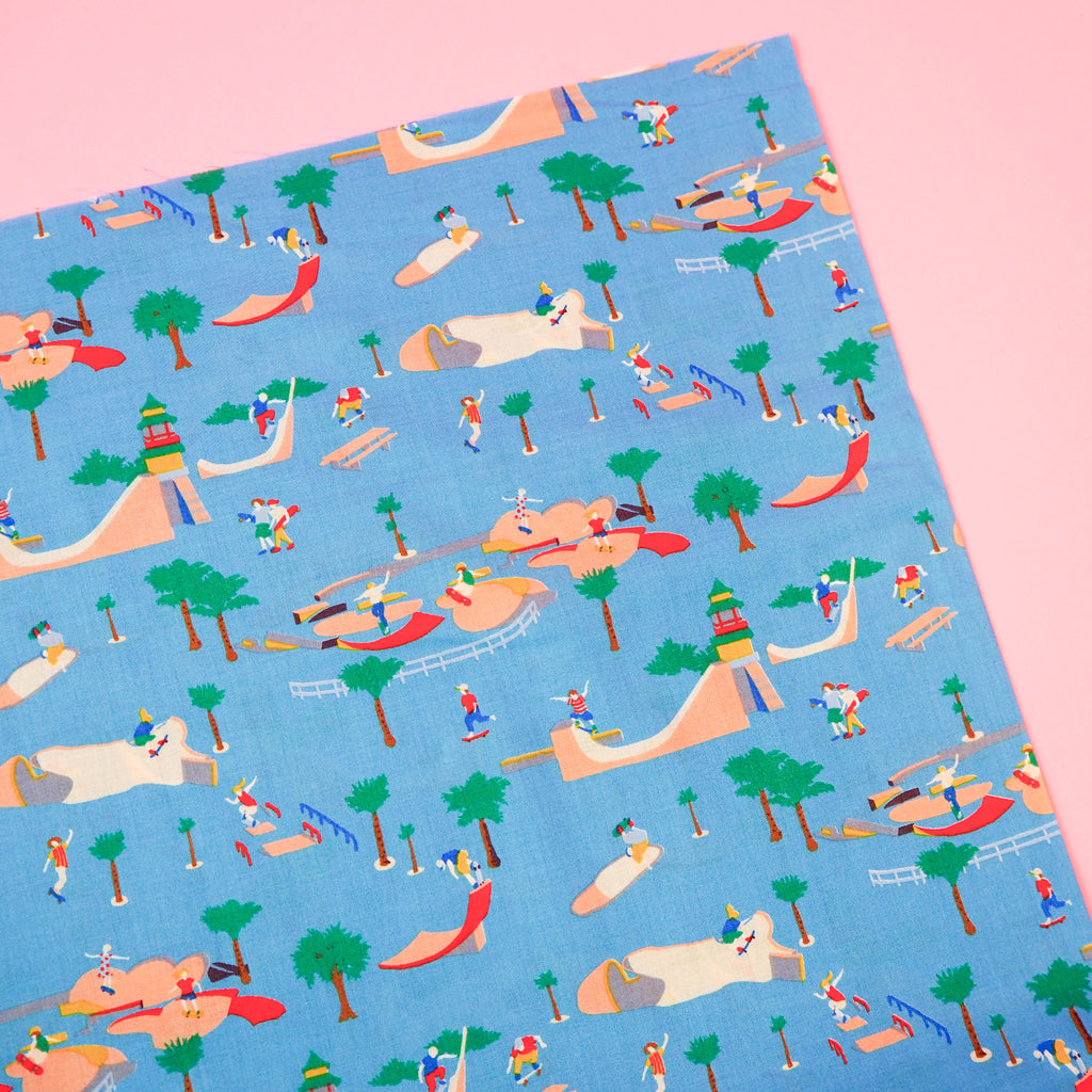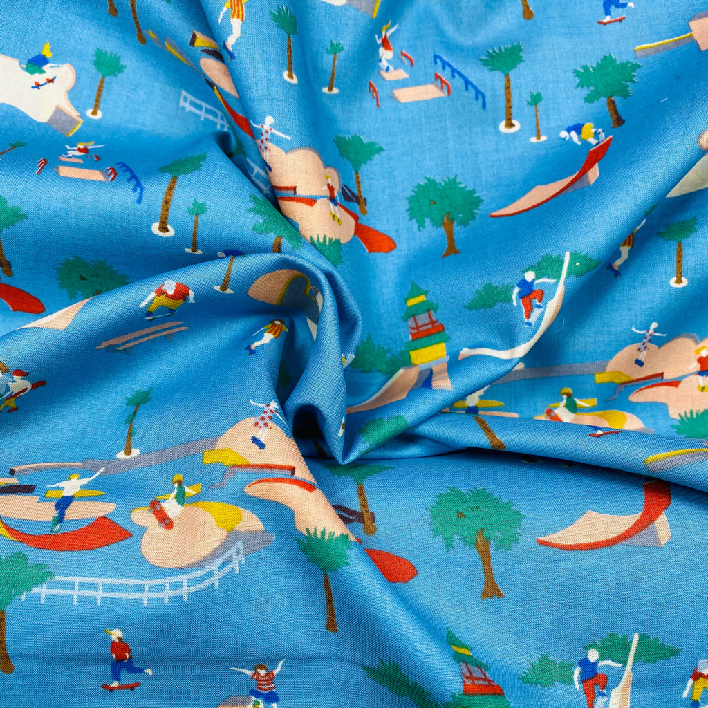 Sky blue version of this Japanese Skate Park cotton lawn fabric. Very cute pattern with skaters and trees pictured against a light blue background: this is also available in navy! Would be amazing for fussy cutting, comes as a super smooth and silky cotton.