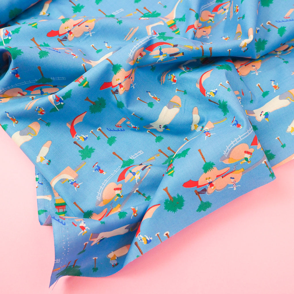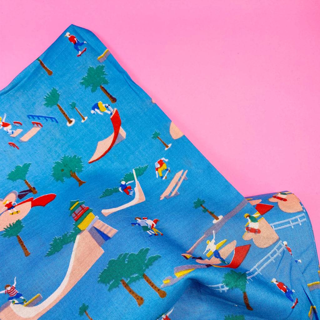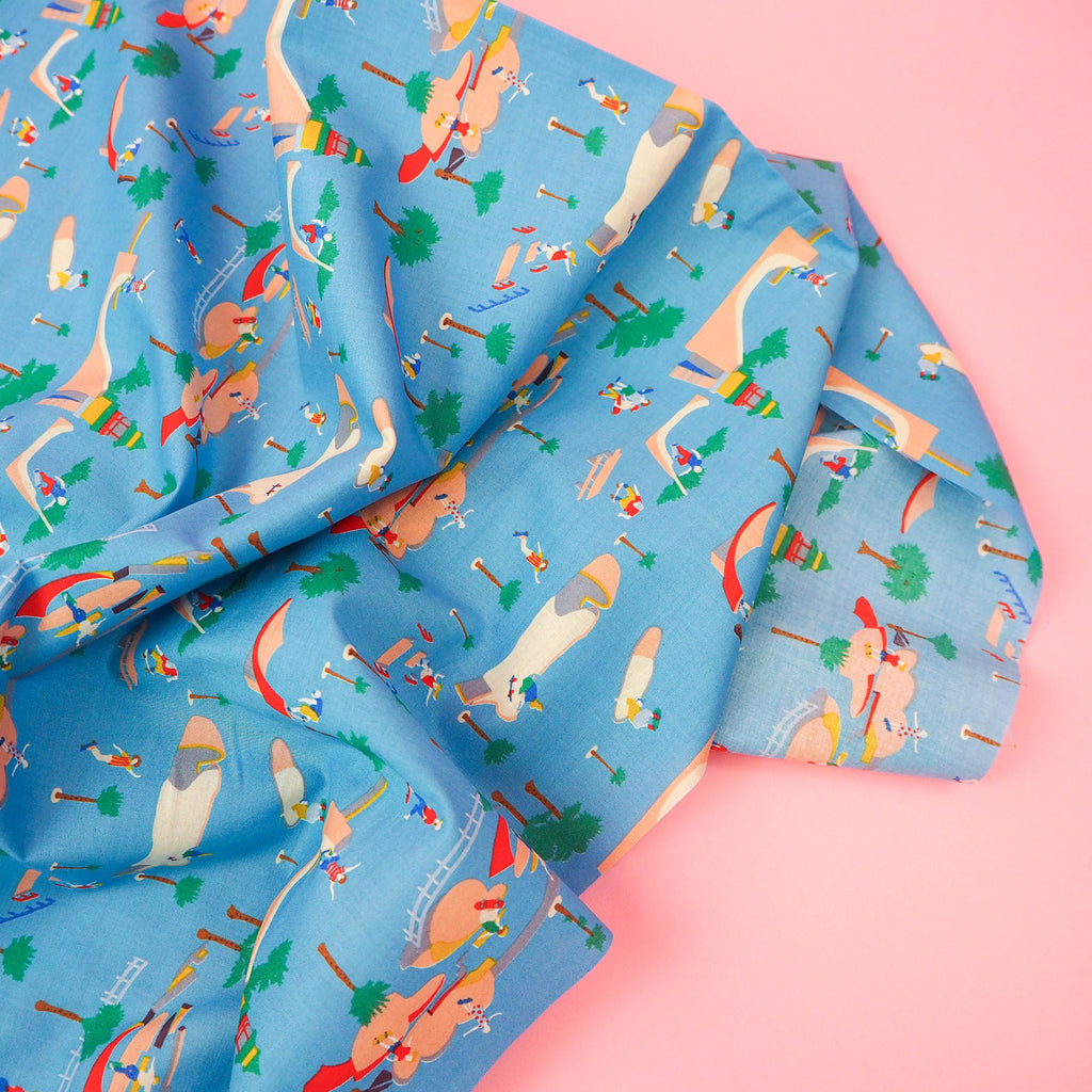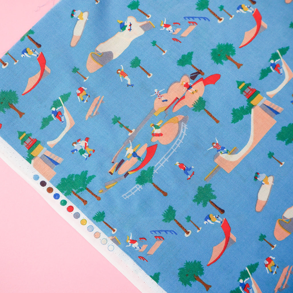 Sky blue version of this Japanese Skate Park cotton lawn fabric. Very cute pattern with skaters and trees pictured against a light blue background: this is also available in navy! Would be amazing for fussy cutting, comes as a super smooth and silky cotton.
