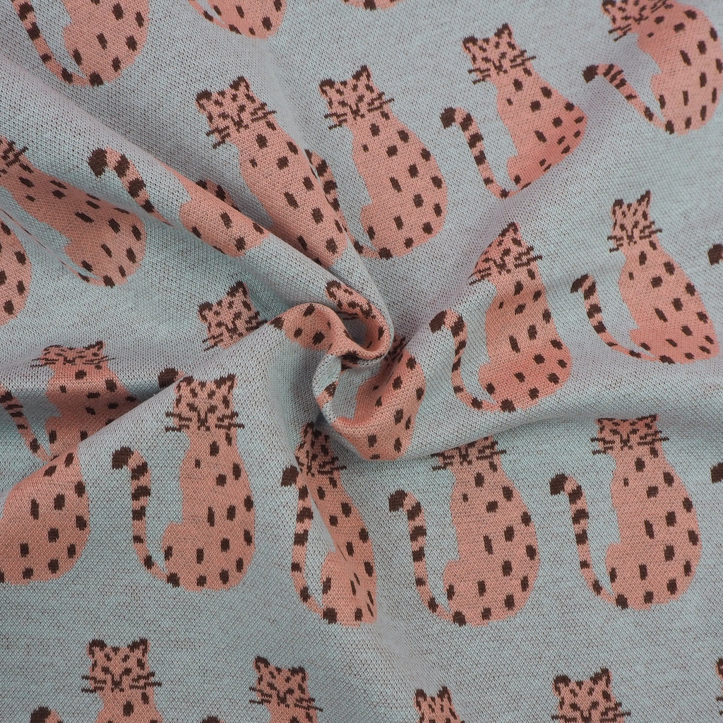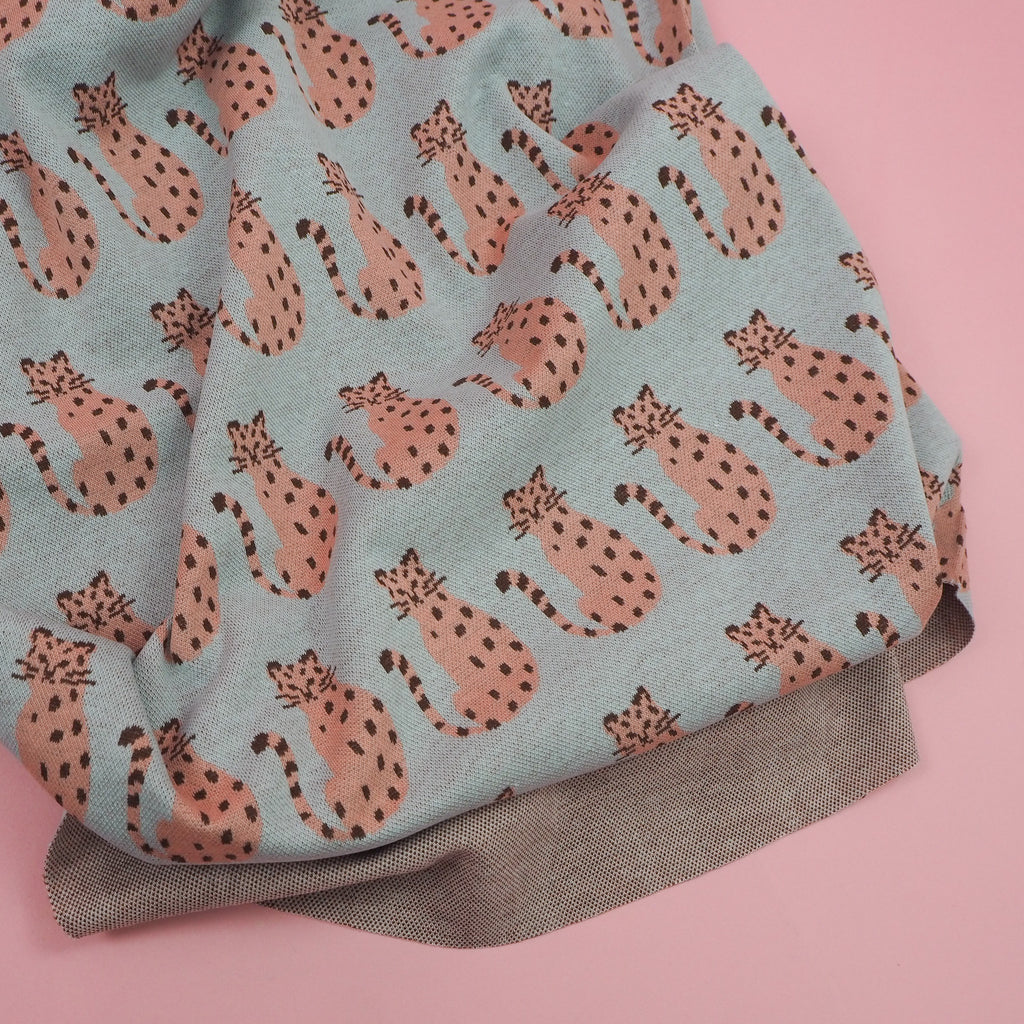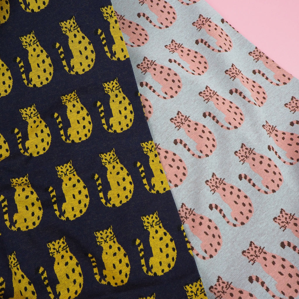 Beautiful strawberry-ice-cream-pink leopards on soft grey knit Jacquard imported from Japan. This statement cosy cotton knit has some stretch to it for your next comfortable-yet-cute project. It's ideal for cardigans and jumpers!
