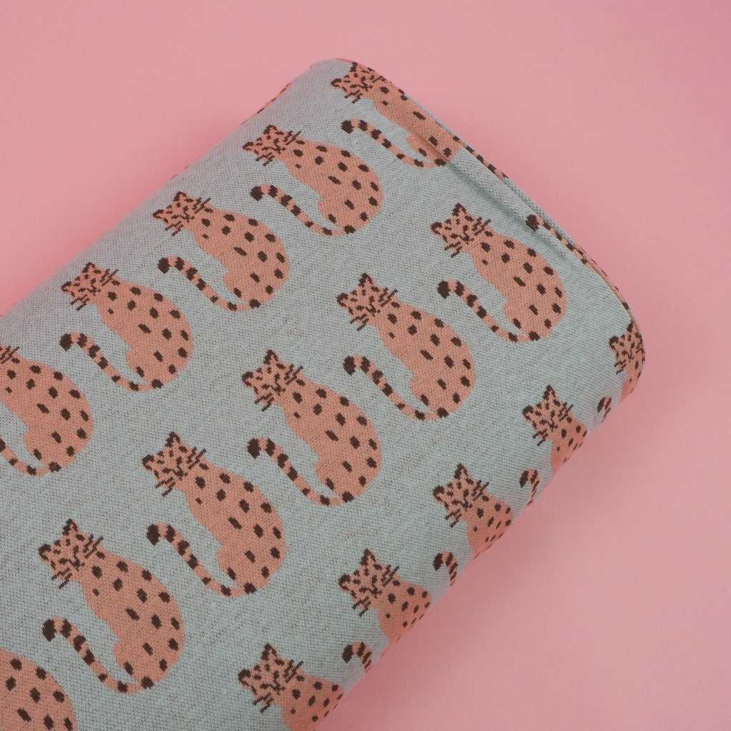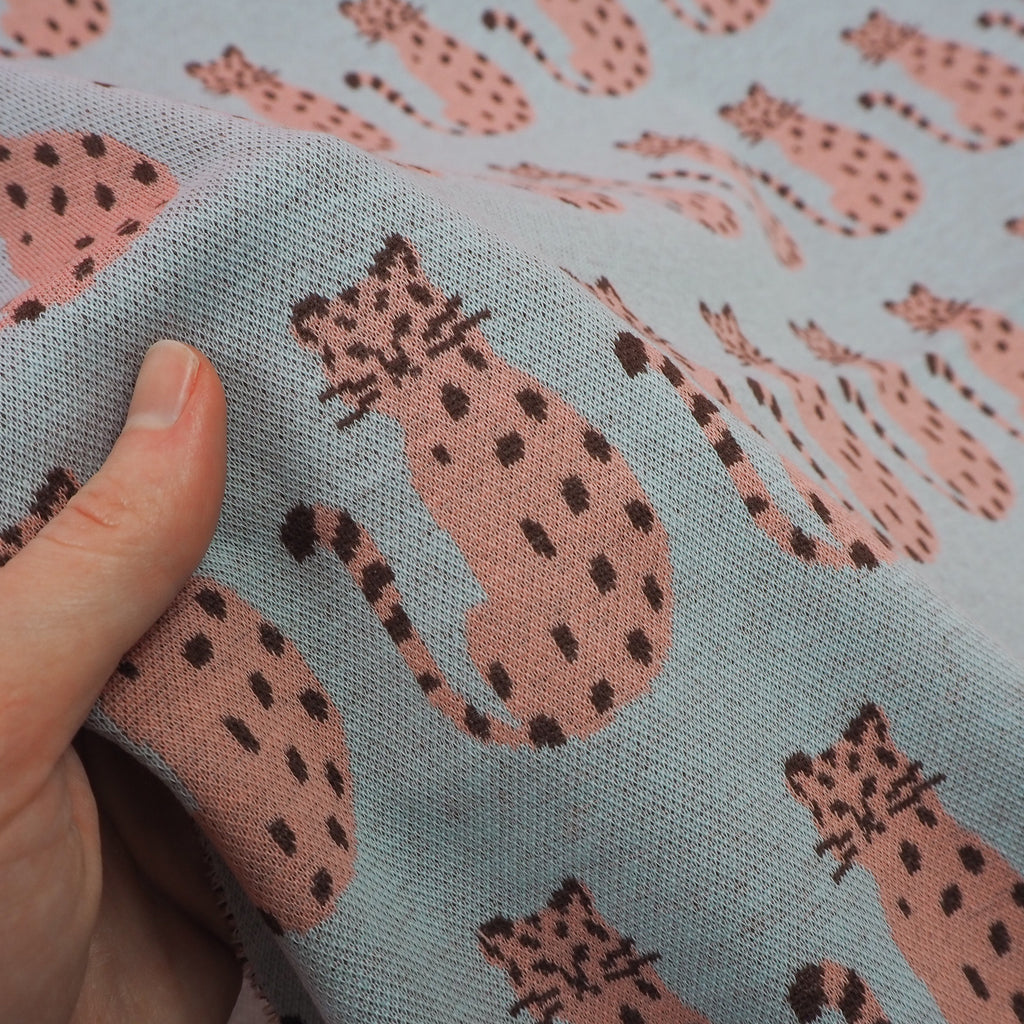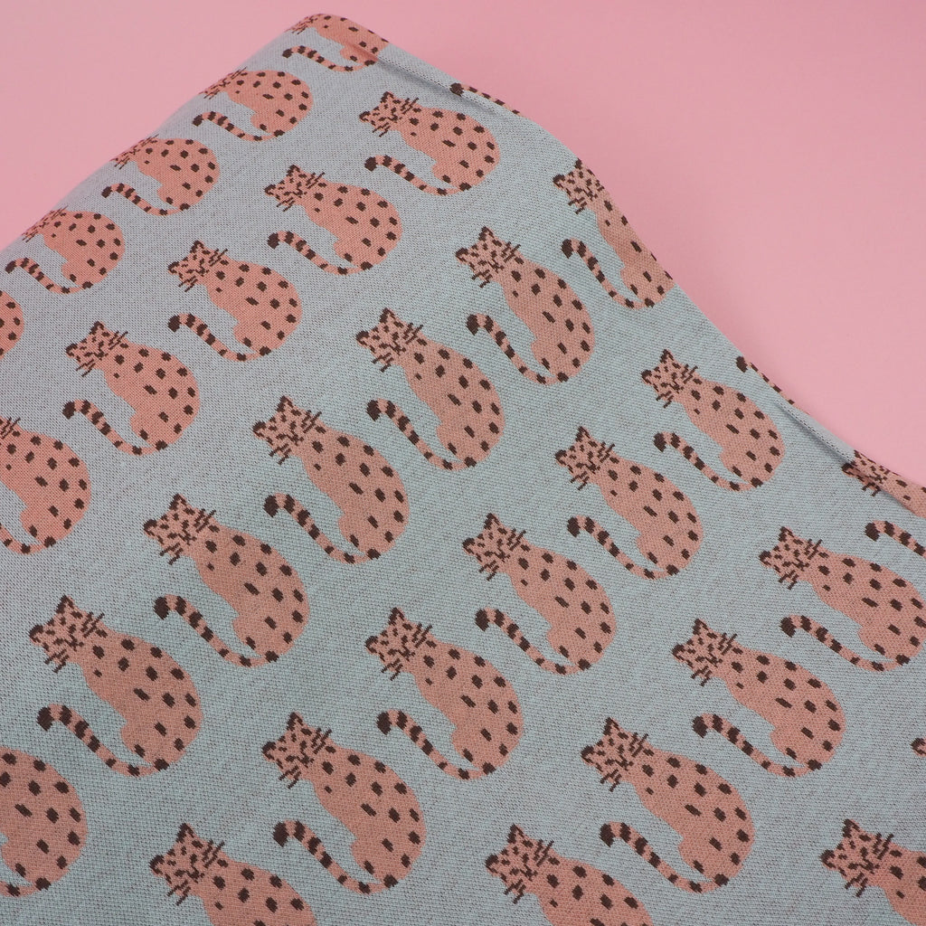 Beautiful strawberry-ice-cream-pink leopards on soft grey knit Jacquard imported from Japan. This statement cosy cotton knit has some stretch to it for your next comfortable-yet-cute project. It's ideal for cardigans and jumpers!