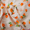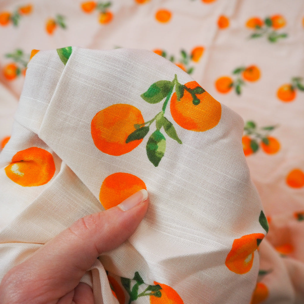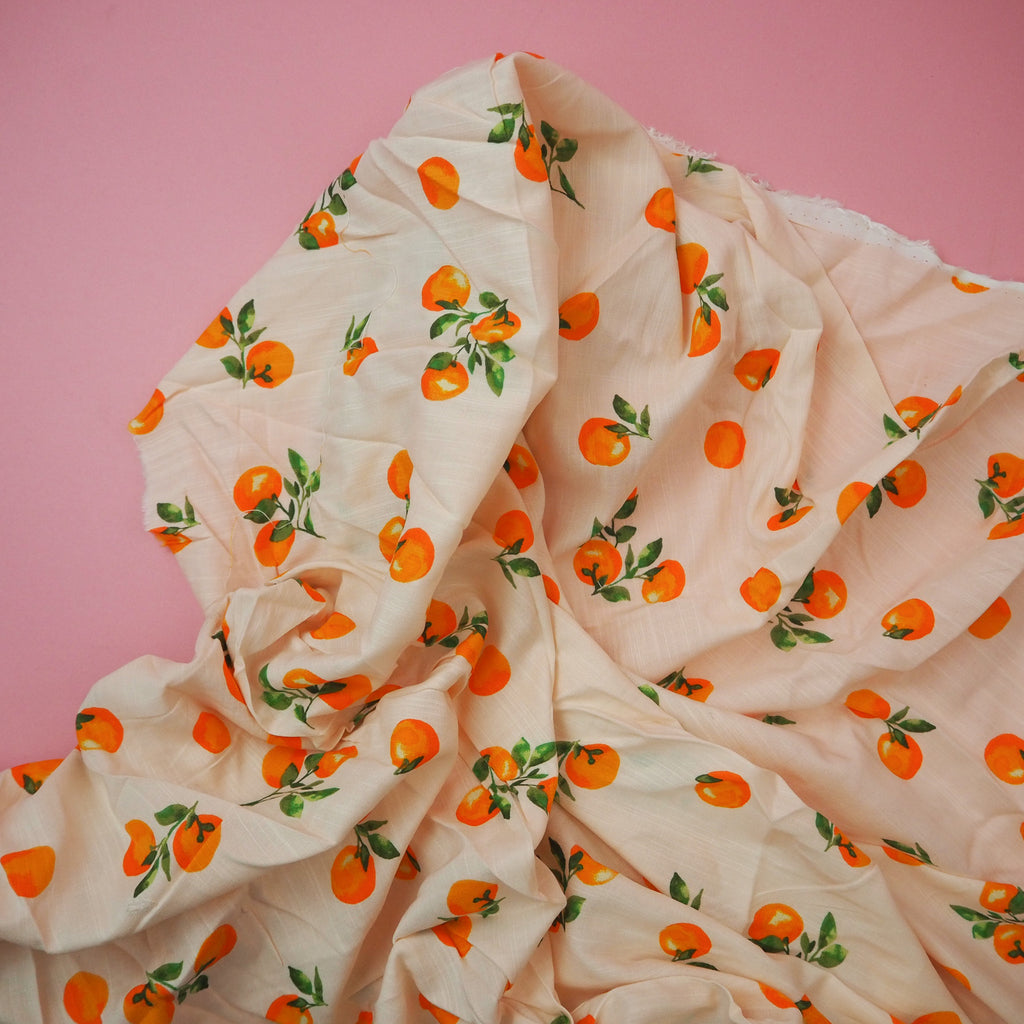 Pretty, light weight viscose with oranges on a pale orangey-pink background with great drape.