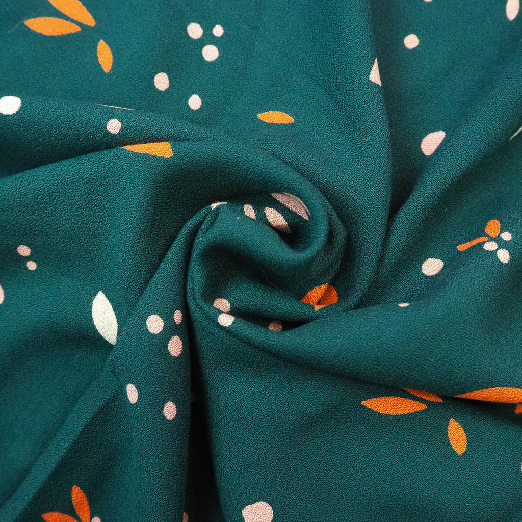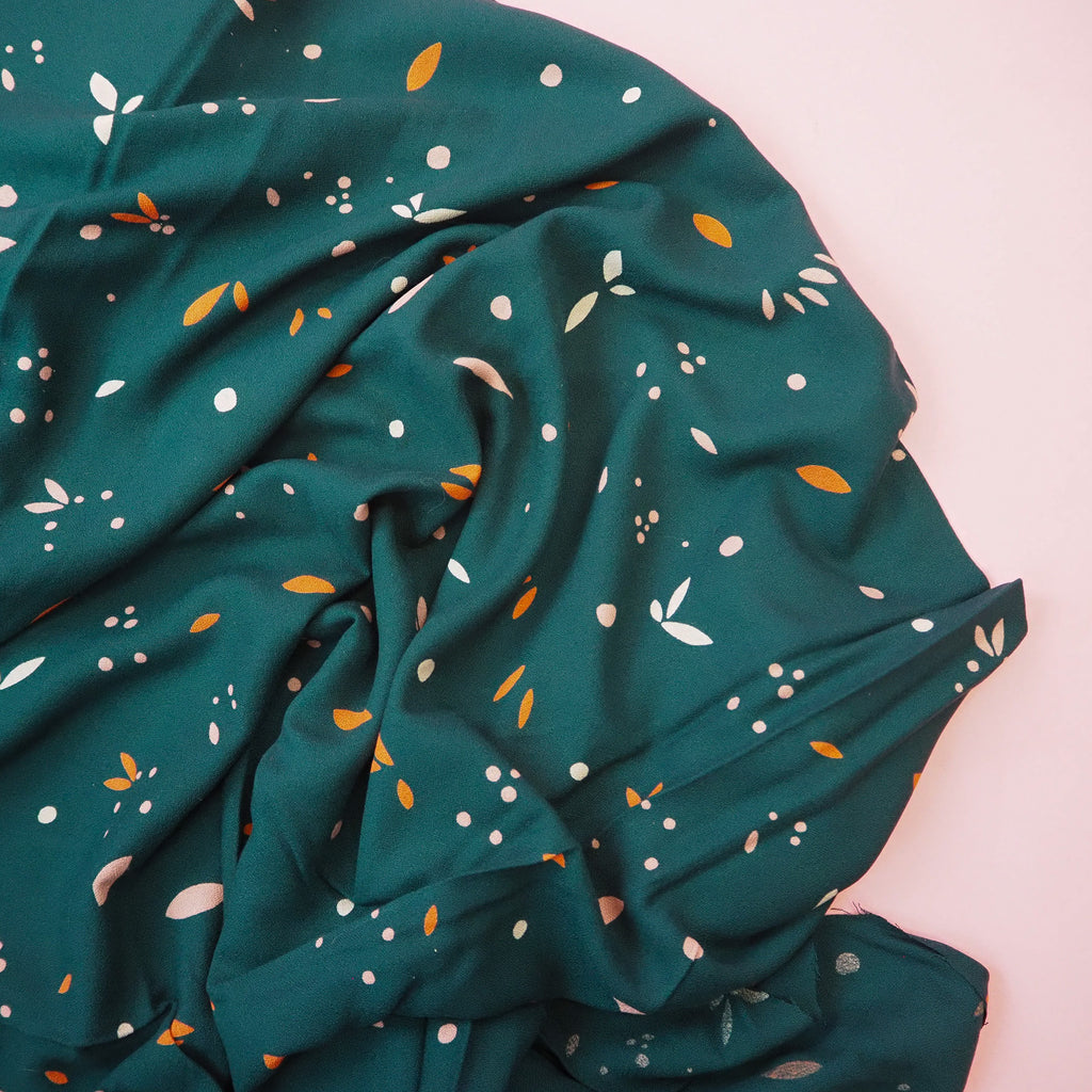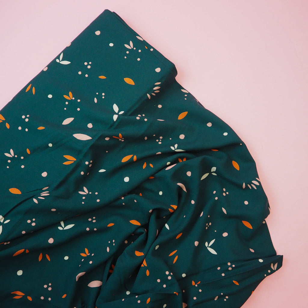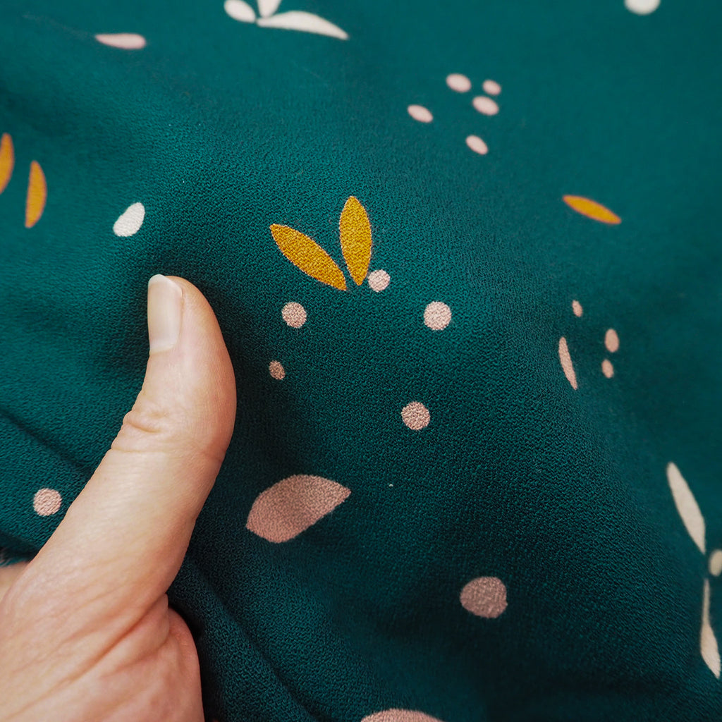 Luxurious bottle green coloured viscose crepe fabric by Mind the Maker. Made with high-quality ECOVERO™ Viscose fibers, this fabric offers a lovely soft drape. This viscose crepe fabric is very versatile and perfect for a wide range of garments, like shirts, blouses, dresses and skirts. The 'dyed and printed' technique ensure a seamless look from every angle.