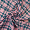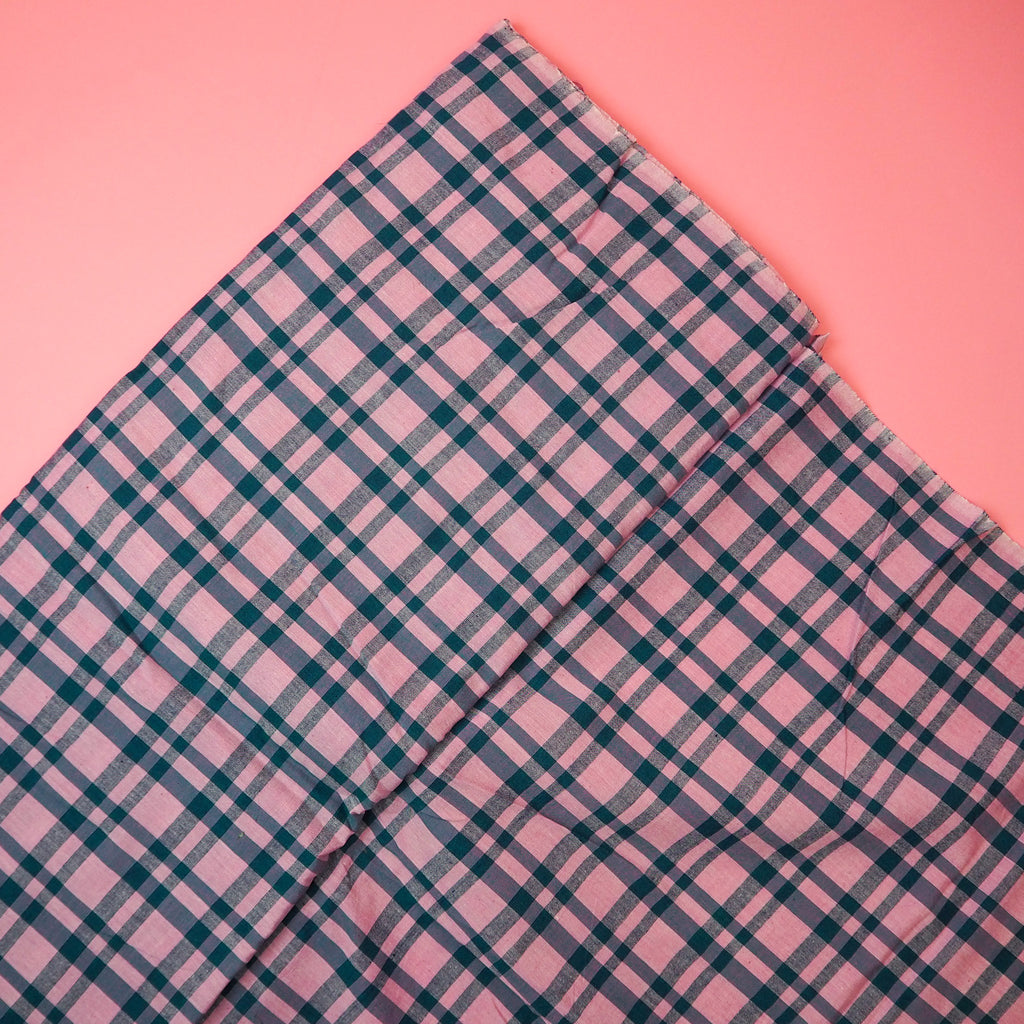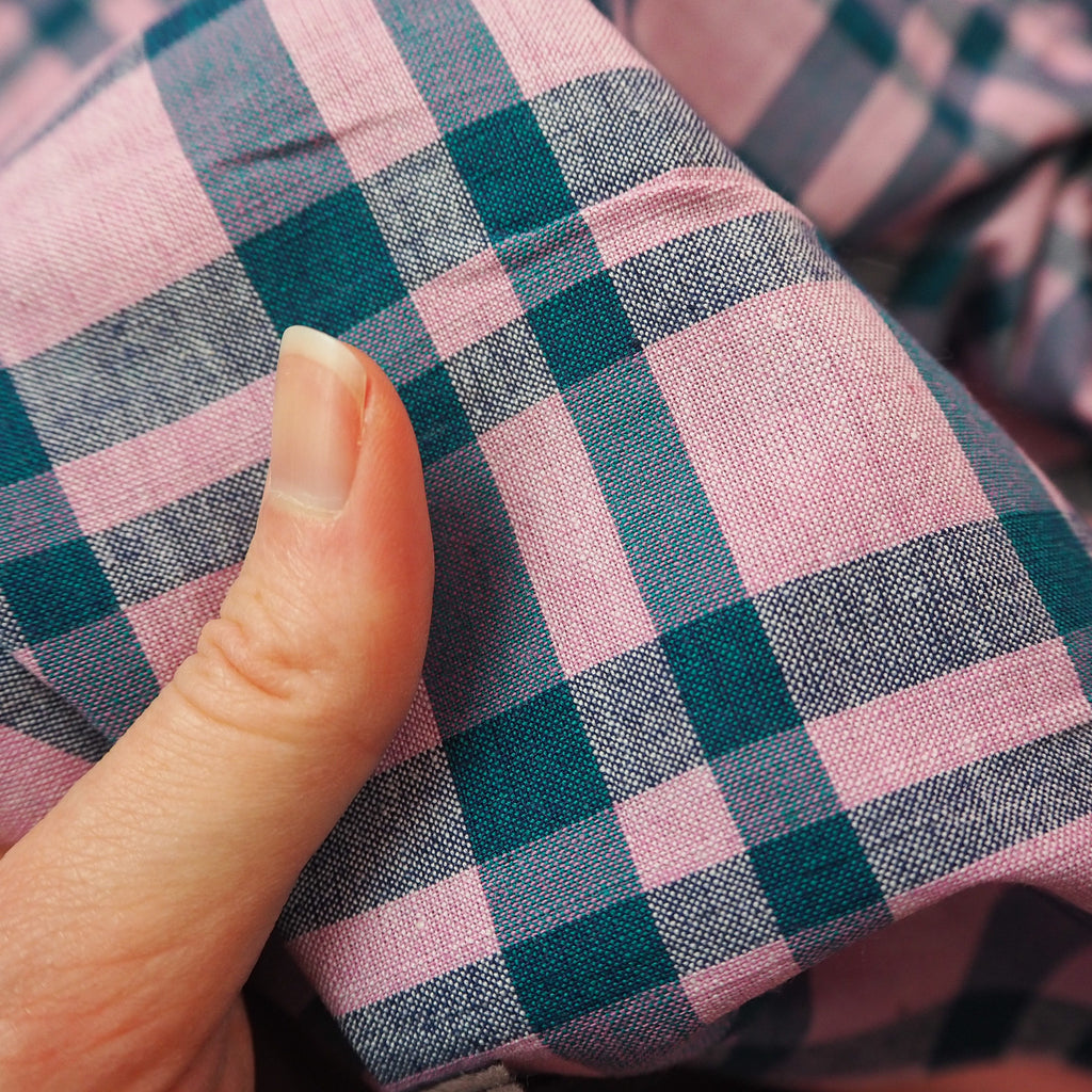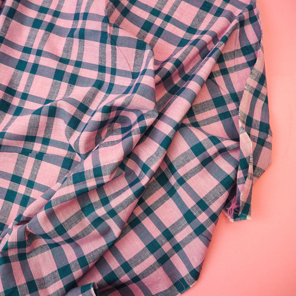Pink and blue/green check Indian khadi cotton. Khadi cotton is crafted by handweaving dyed cotton yarns on a handloom to create this beautiful design.