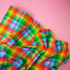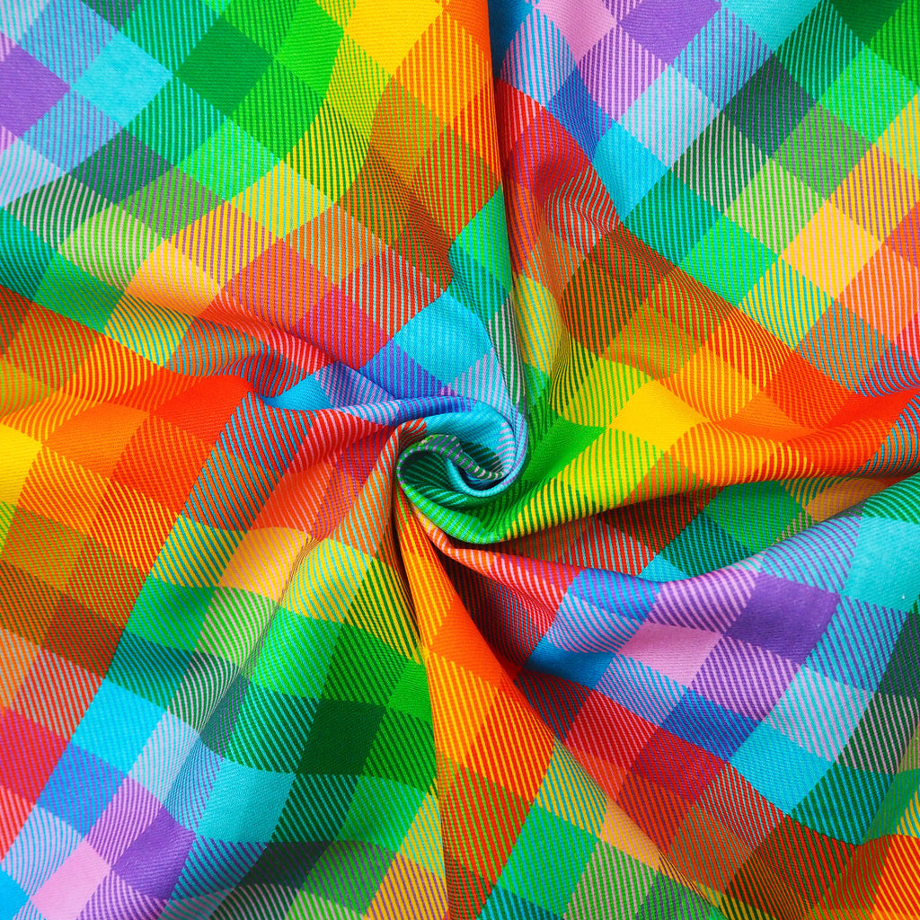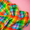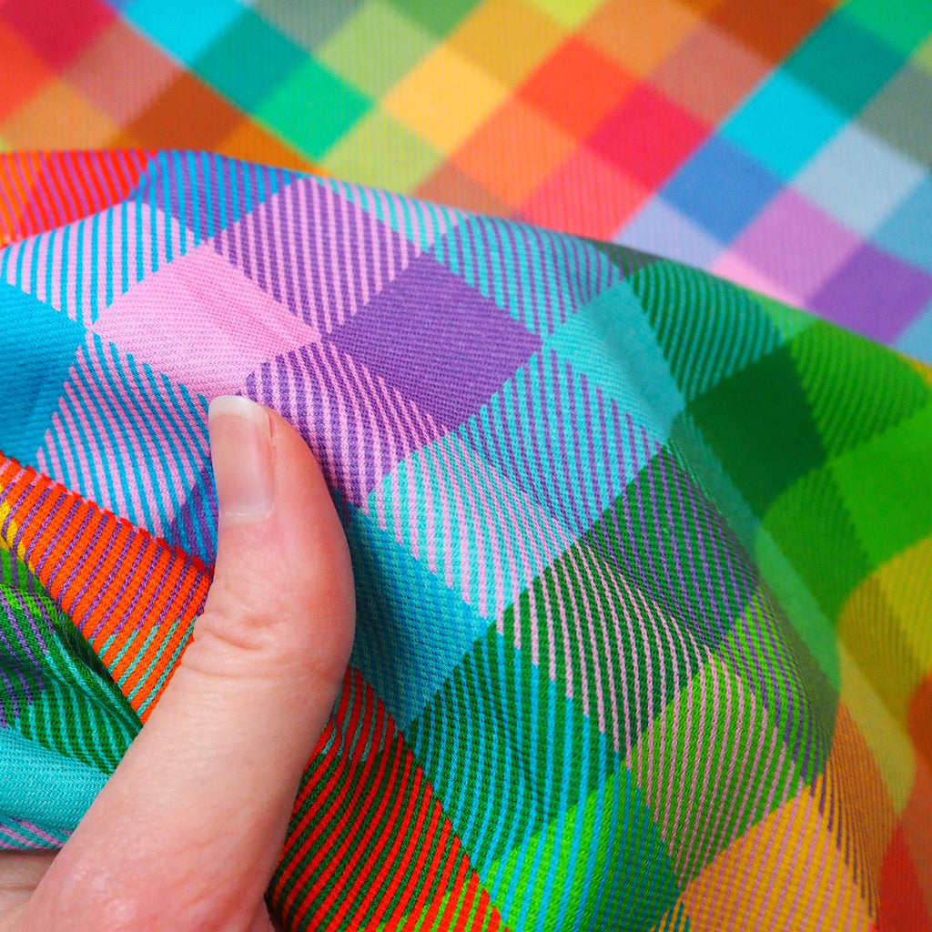 Rainbow multi-colored check pattern woven into a soft and breathable cotton-viscose blend.