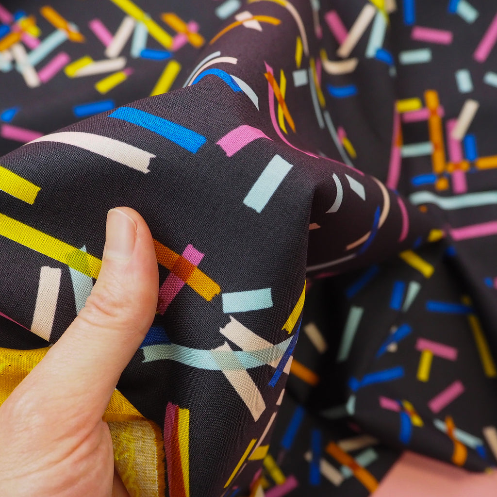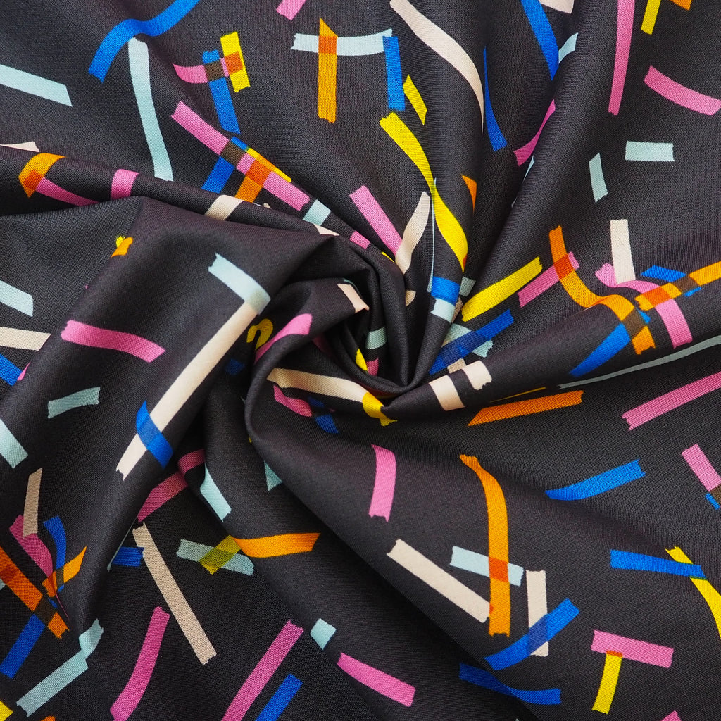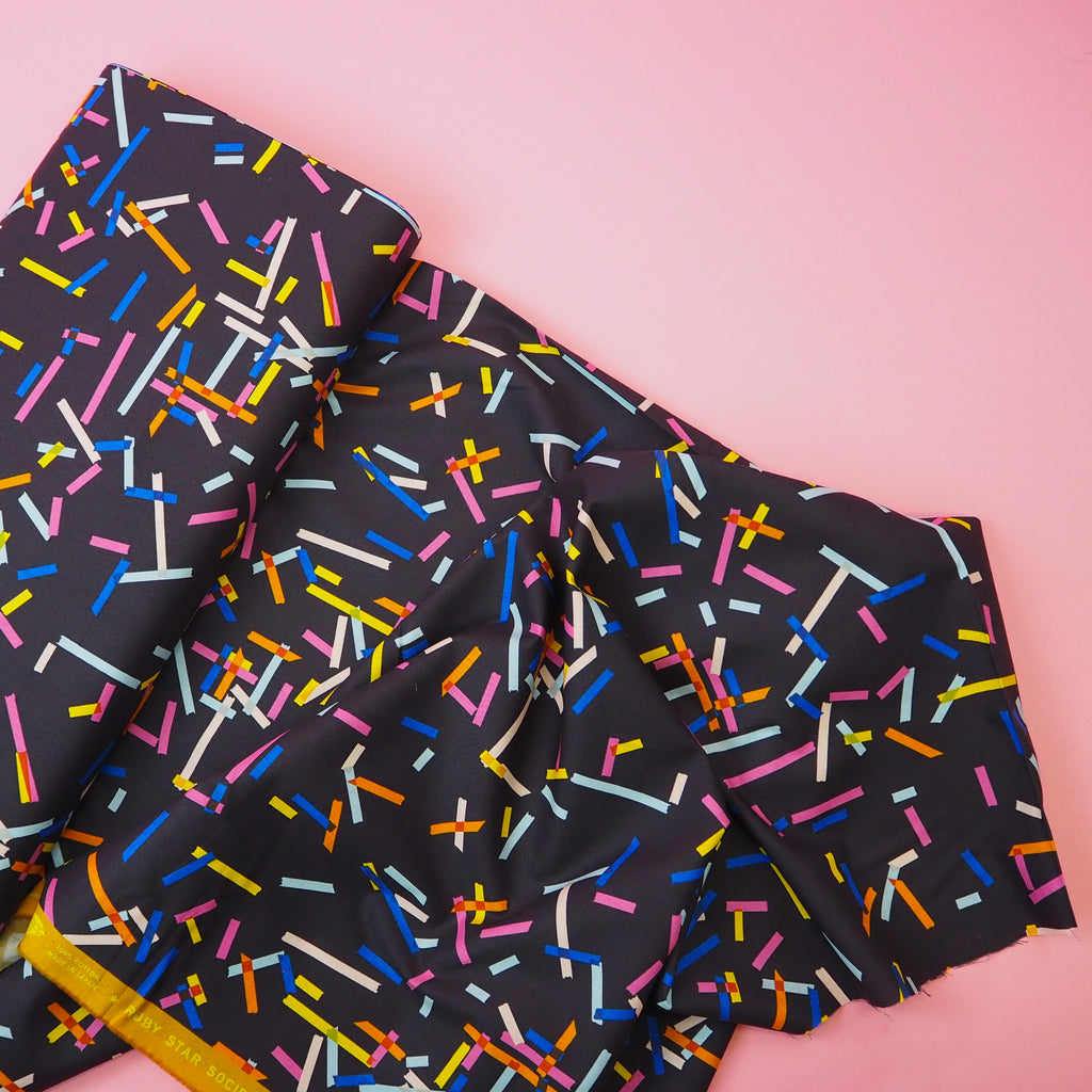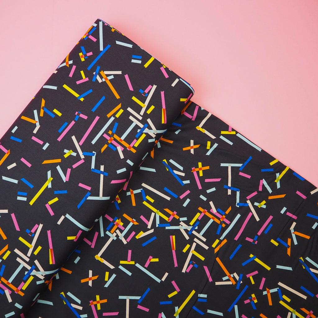 Washi tape print in pretty colours on a soft black background designed by Rashida Coleman Hale for Ruby Star Society.