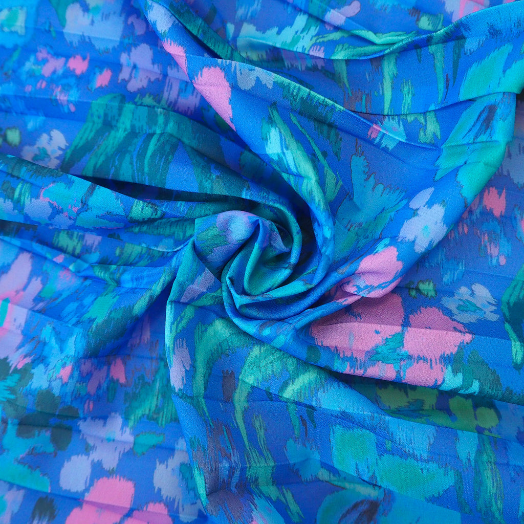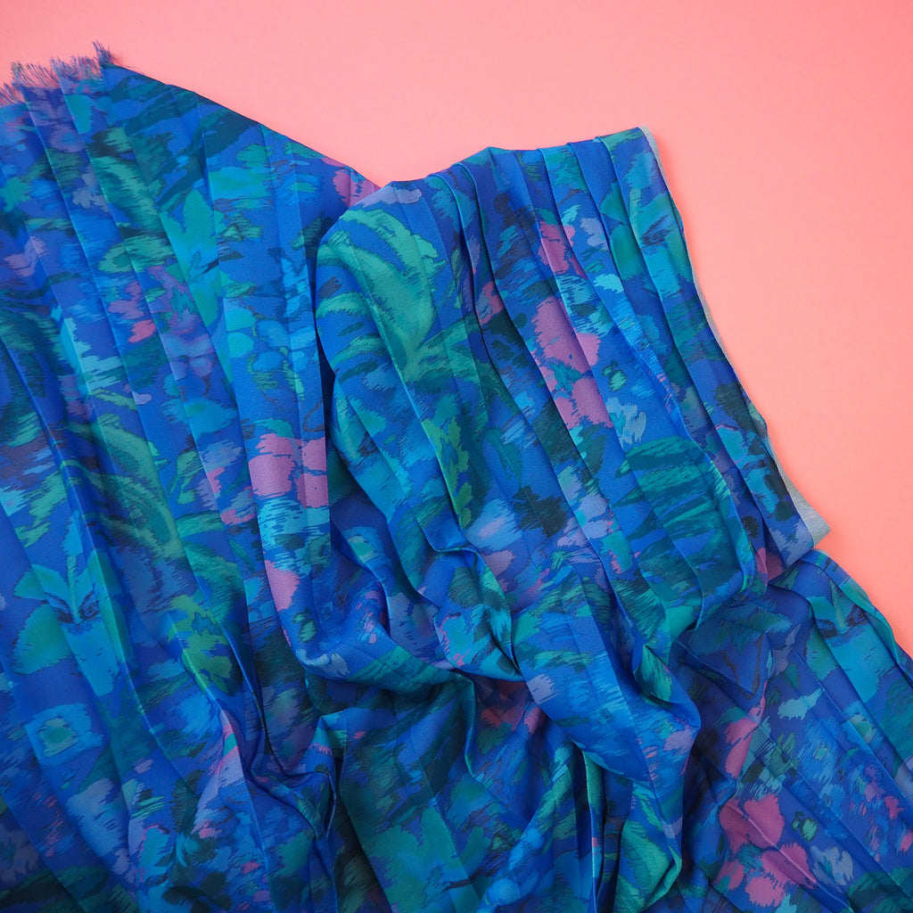 Retro floral print plisse polyester crepe fabric in blue/green/purple/pink shades.